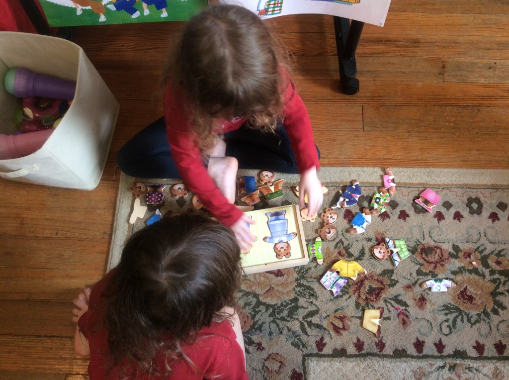 Beginning with the three bears puzzle. It incorporates emotions and proper clothing for the proper people (size/type of person relationship). Lily did very well dressing for the proper occasions switching seamlessly for night clothes at night for sleeping to day clothes for daytime. She even added raincoats for rainy days. Maggie played along and did well taking turns. She is very good & has a quick eye for puzzles. She’s talented with putting them together. Even complex ones.