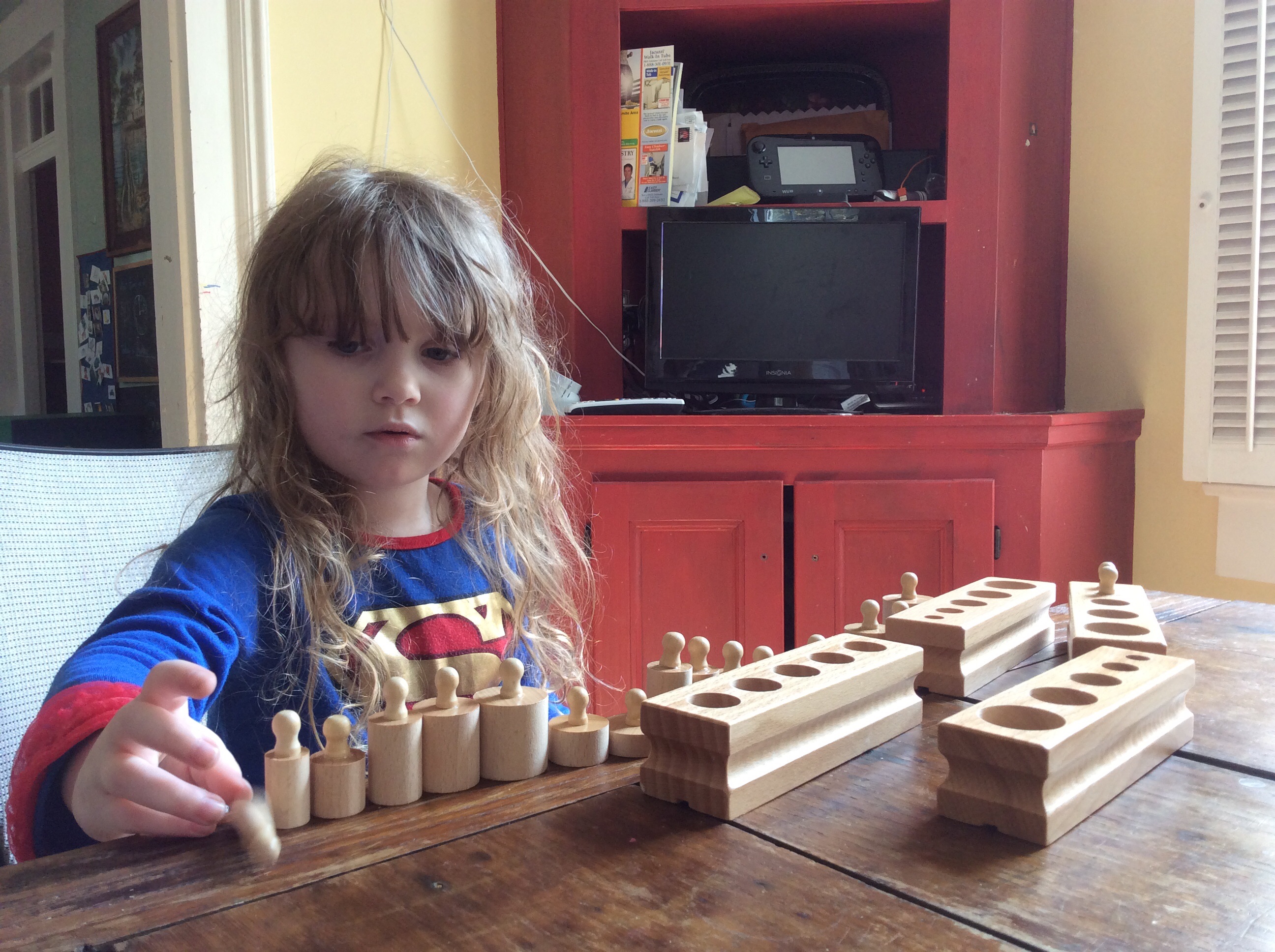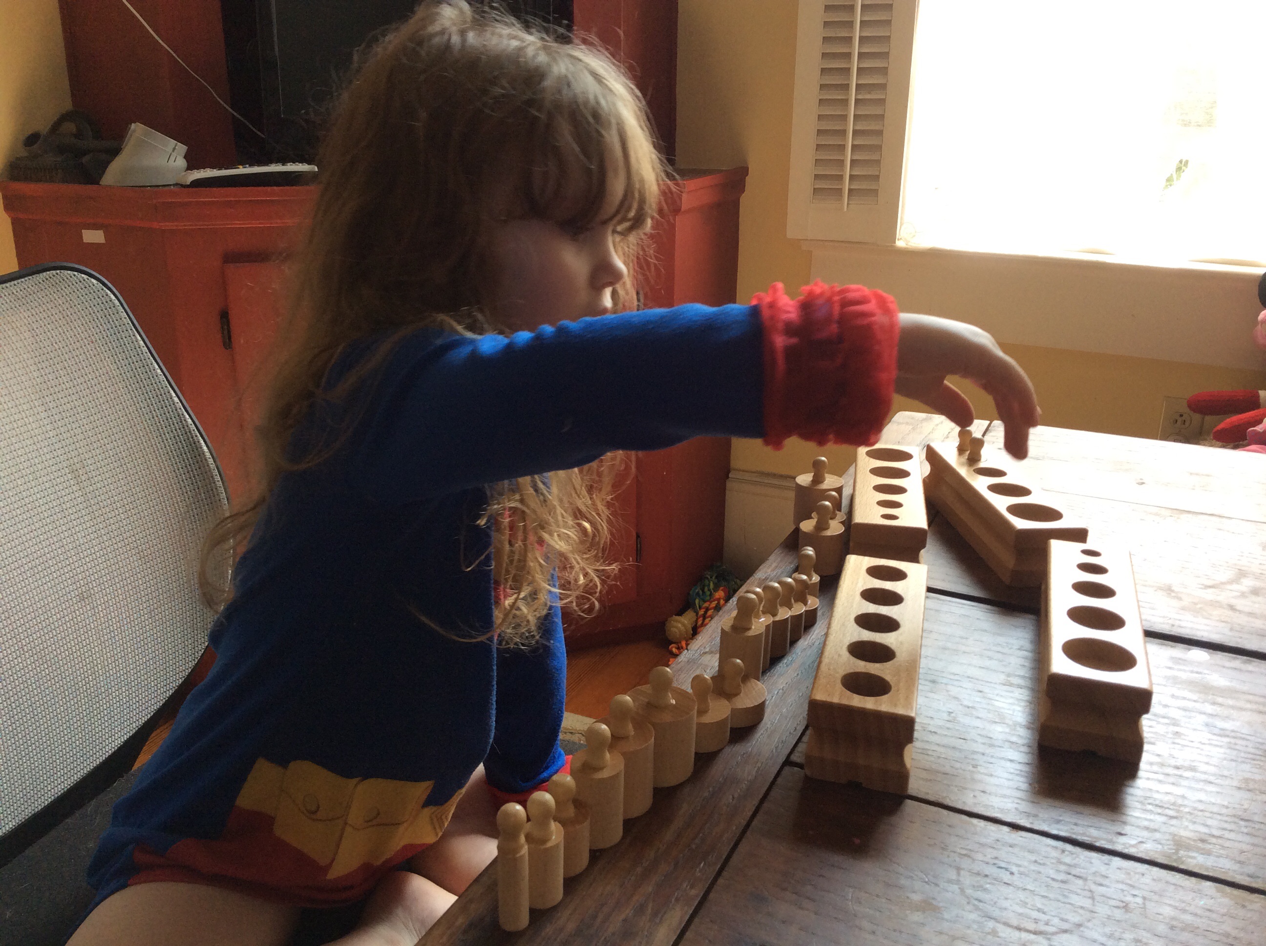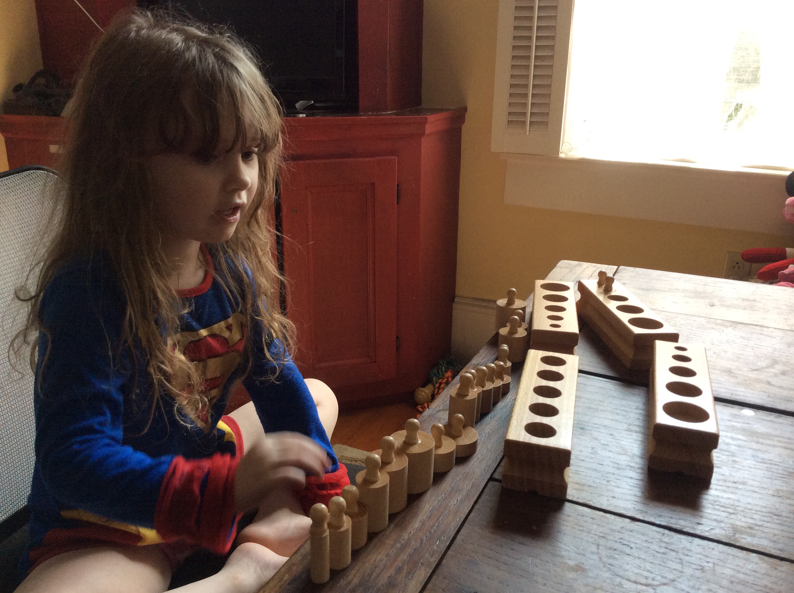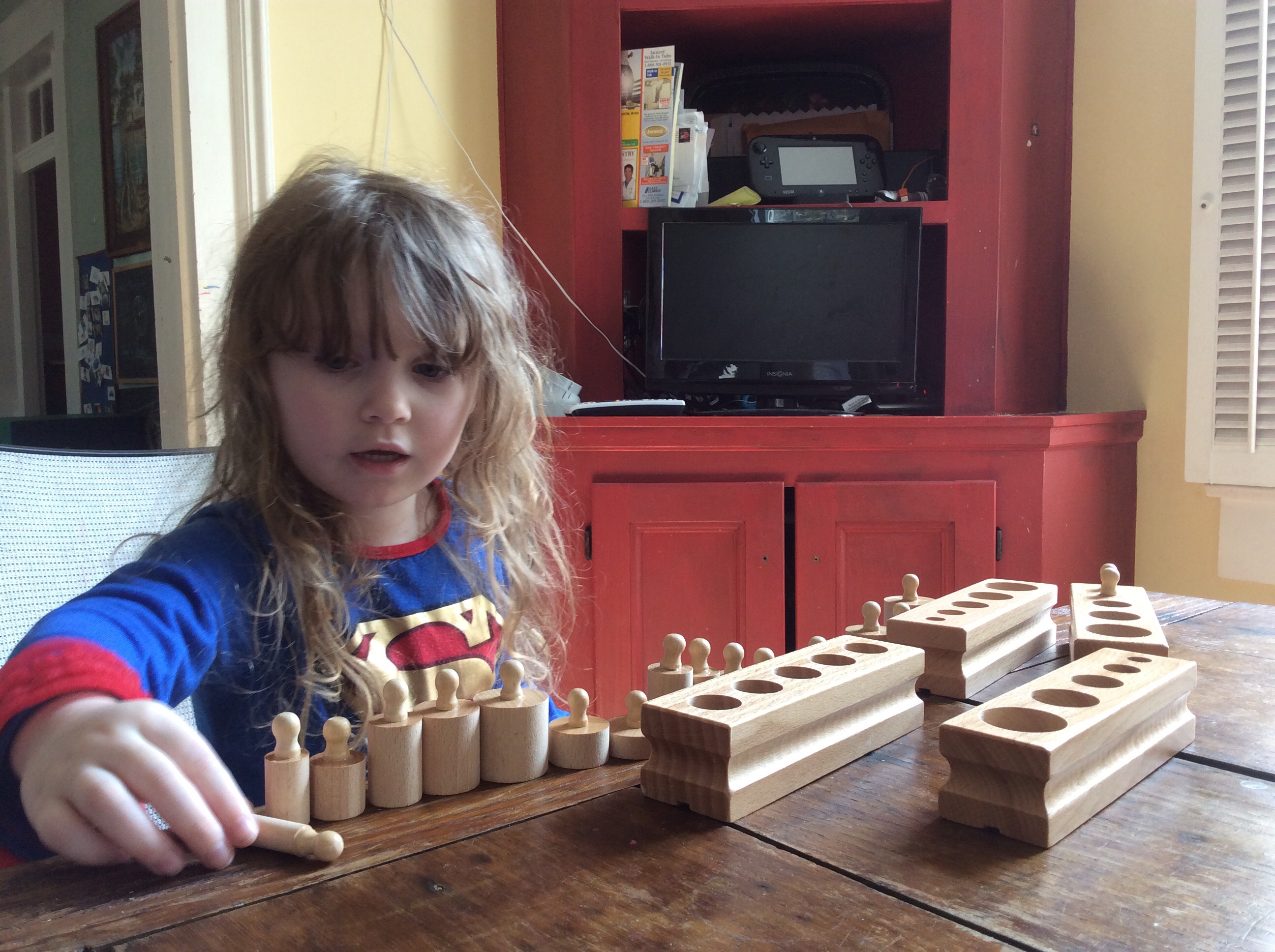 This morning our pegboard cylinder set came in the mail. I couldn’t wait to see Lily’s reaction to it. It is a very small copy to the real Montessori one but it helps to grasp the same concept. I figured if she could use a small version she will know exactly what to do with the larger version when she sees it in a school setting. There are 4 rod blocks. I only put 2 out to start with. To get her to actually place the pegs in versus ordering them in a line I recite the 3 bears with her (which is a favorite book/script). Each peg goes to bed in its hole. We talk about its too big or too small (the hole) in reference to the storyline. Also too deep if the peg is too short. She grasped that concept today too & started using it to describe her actions as they were unfolding. We talked about everything we were doing & because she did so well I laid out all 4 bars at a time and she nailed it. I’ve never been so proud. She’s going to do just fine in school. Wait until everyone sees what she can do. 🙂