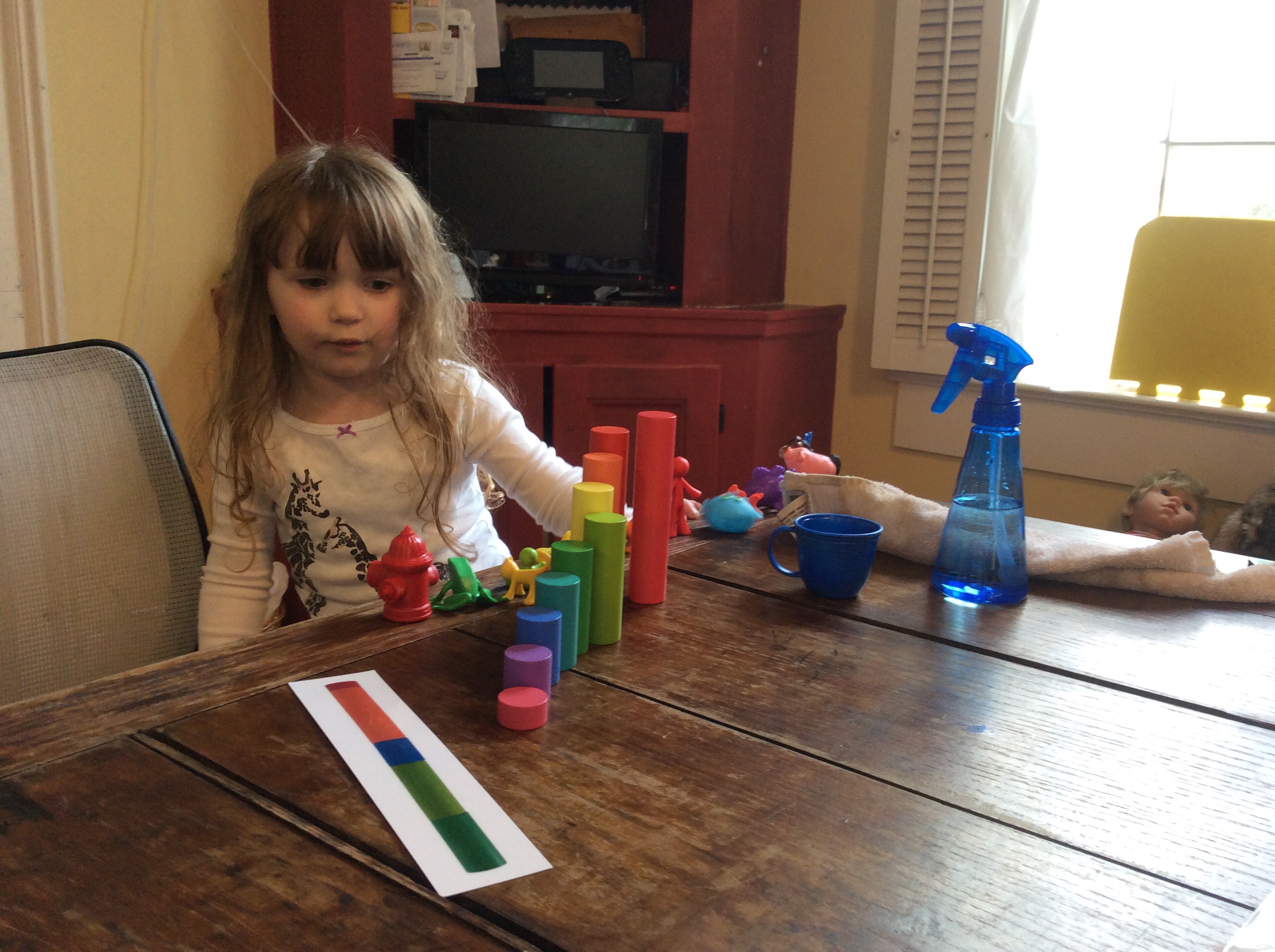 We’ve been learning the concept of making a tower by matching colors from a card and building stairs where one size peg or object is progressively shorter than the next.