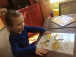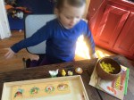Our newest hands on science project was learning about the life cycle of the chicken. The kids really enjoyed this setup. It included books about the life cycle of the chicken that also explained the stages of egg growth. We have a kit which represents the growth that goes on in the inside of an egg in order for it to reach the chick stage. So we put this out too. There were figures present to represent the life stages and cards to match. A little life cycle puzzle of the chicken is in the tray. Lily preferred to match this to the stages instead of the cards. I also had a made up book of the parts of a chicken that Maggie took interest in matching the cards parts. (3 part cards). I even found some inflatable chickens to draw the kids interest in the table and it worked beautifully and the chickens lasted for at least 2 days! I’m glad we started this project before Easter because now we can have more discussions during our Easter egg hunts, etc.