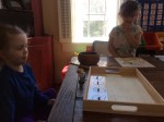 More simple addition with the math beads. Checkboard beads mainly. There are tens in there also. The girls are recognizing units, tens, hundreds and thousands but still not applying them to their place value in a traditional number just yet as they have just been introduced. Maggie is very excited about learning how to read a number as she puts it.