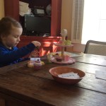 Work with the pink series and the Handwriting without Tears board and moveable alphabet. The kids match the word to picture card then spell it out with the moveable alphabet. After this they write the word on the chalkboard with a sponge and chalk. Maggie can do this now without help. Lily is still requiring hand over hand but she is trying to do it on her own now and succeeding with the proper strokes.