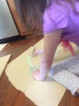 What you see above is a very boring picture of the floor. On it are 2 oversized pieces of draft paper, a CD player, laminated letter cards (used with wooden letters), and a magnetic board that holds up the magnetic pieces to make letters with the same laminated cards, but you can stick it in a vertical position as opposed to horizontal on a table & magnetics are fun. When they stick together it can be a task to pull them apart so it’s great for fine motor skills too. Ha!