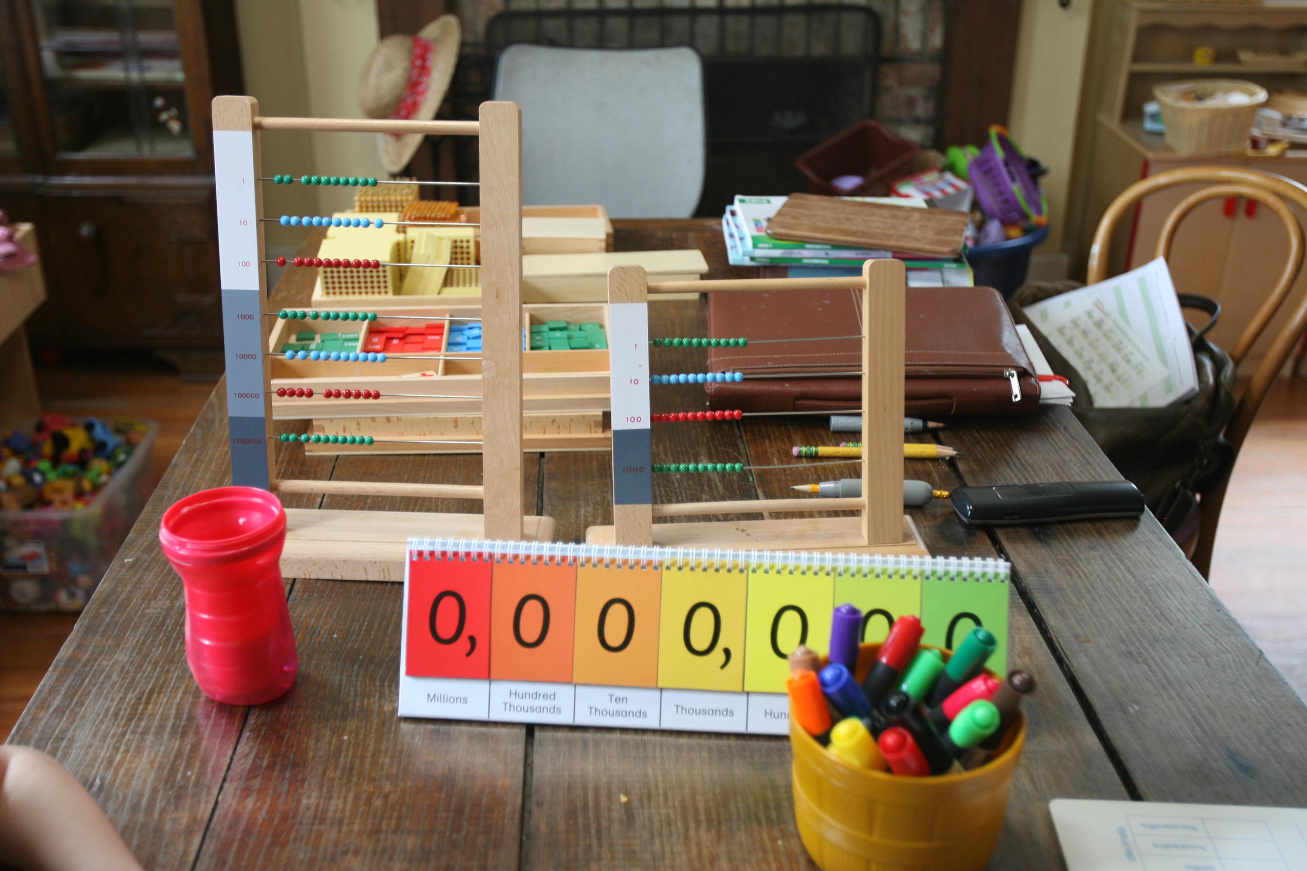 We’ve been working a lot with learning place values lately. The girls enjoy using the charts and the various materials that they mix up to get the same number with different representations. We use a combination of math workbooks that cover place value material and base 10 blocks with our workbooks. We include an array of Montessori materials such as what you will see in the photography below. In the pictures you’ll see the golden beads which are broken down into thousands, hundreds, tens and ones. You’ll also see the large and small bead frame or abacus. We used the stamp game which has wooden tiles which represent the same place values mentioned above. Additionally the girls used a place value whiteboard to record their answers and a flipchart to give a colorful visual and reminder of what number they were working on. I also explained place value on a whiteboard alongside of their work being done.