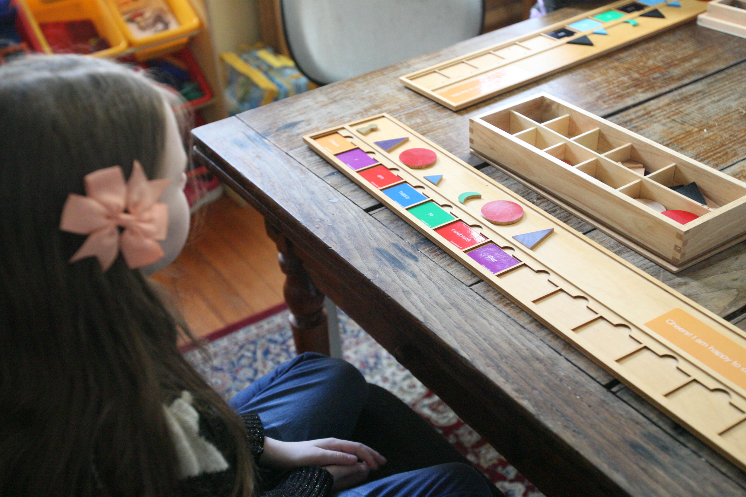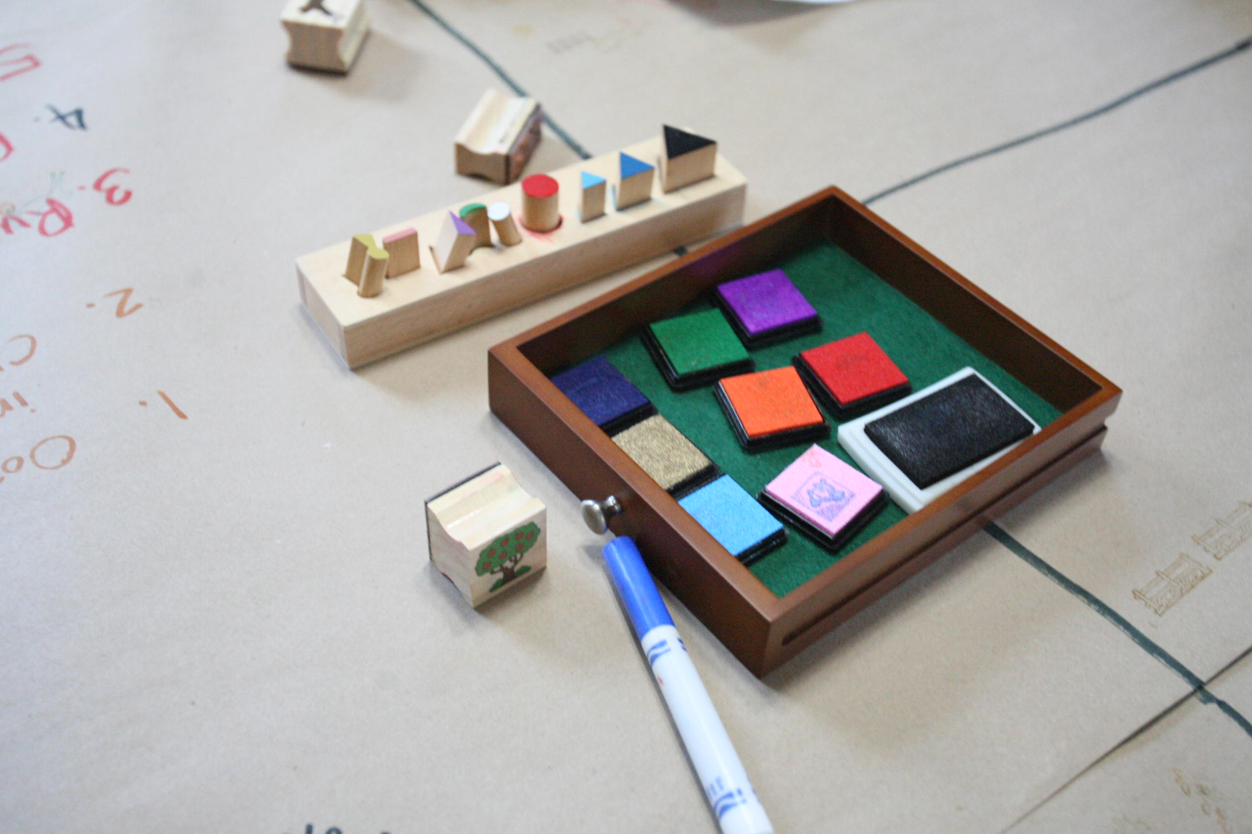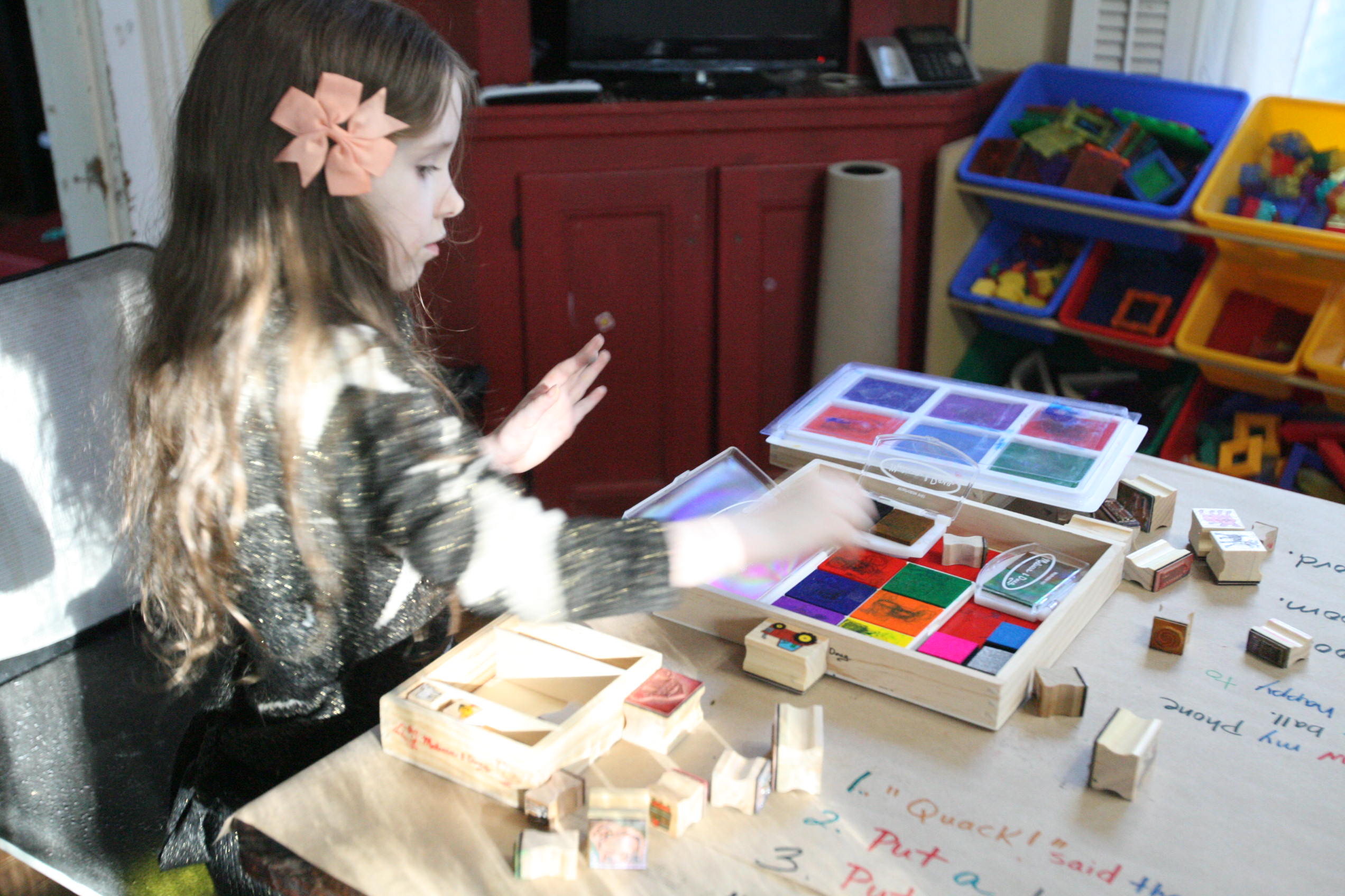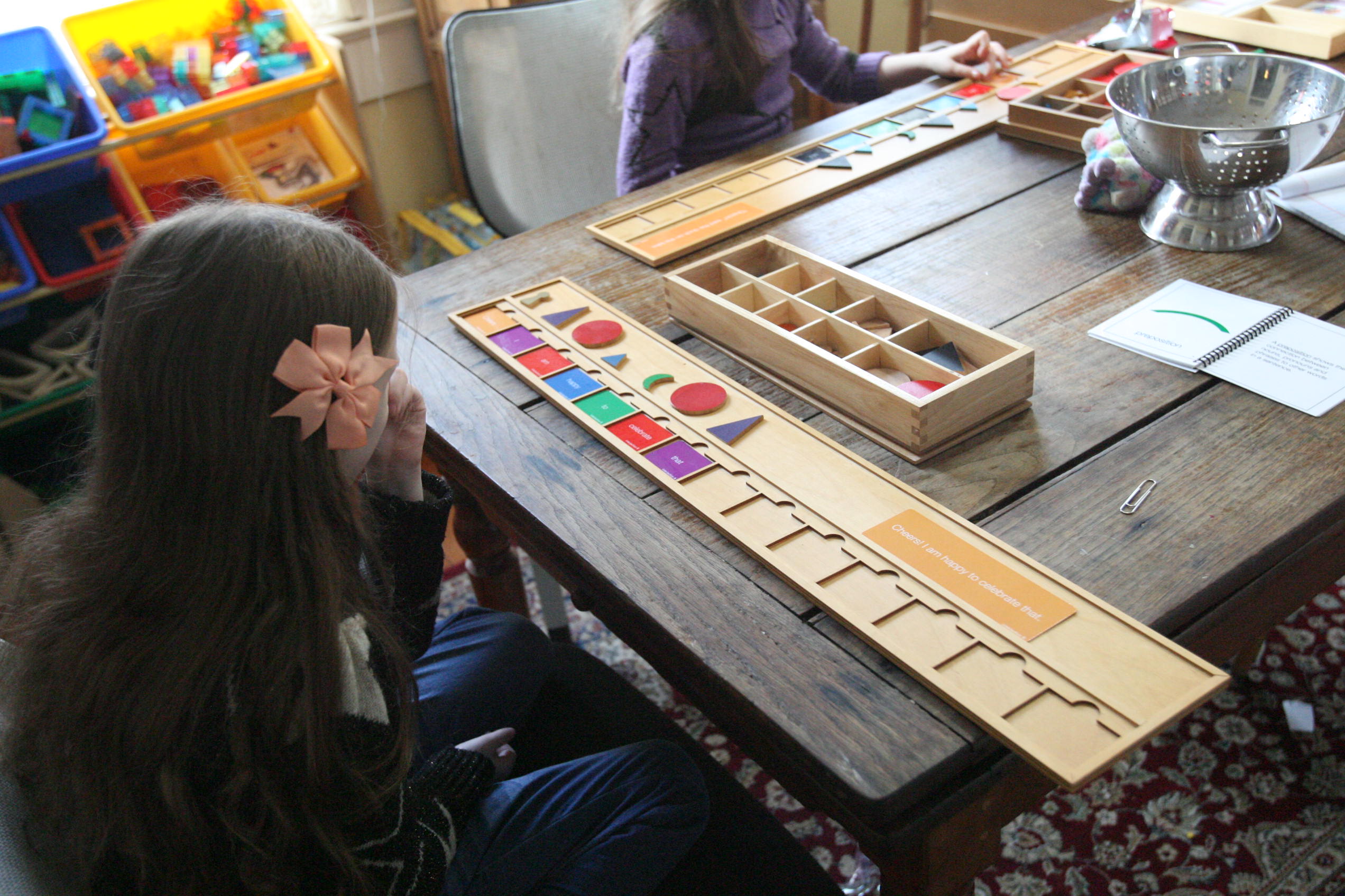 The activity above is the grammar board which are Montessori based materials to teach grammar in language. The girls enjoy working with the bits and pieces and it makes it more interesting when the stamps become involved. After working with the sentences and breaking them down into individual words the kids can focus on what each one is as grammar in a sentence. Though the answers are easily recognized with the colors marking them through repetition I am seeing the girls recognize the parts of speech even when the color coding is not available.