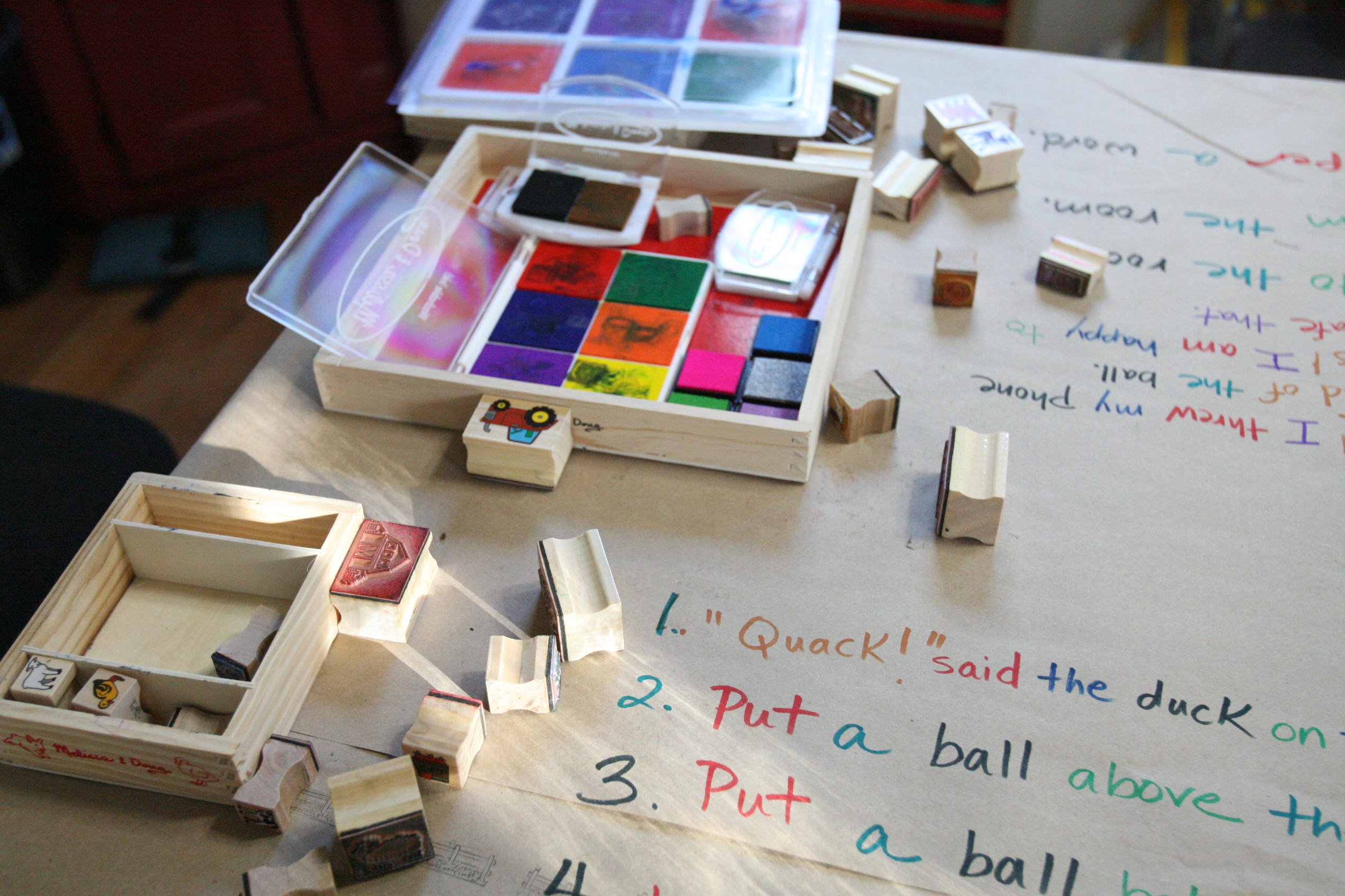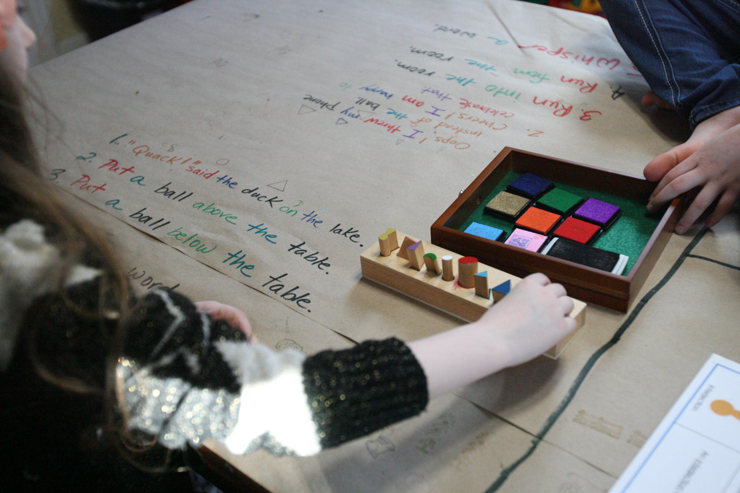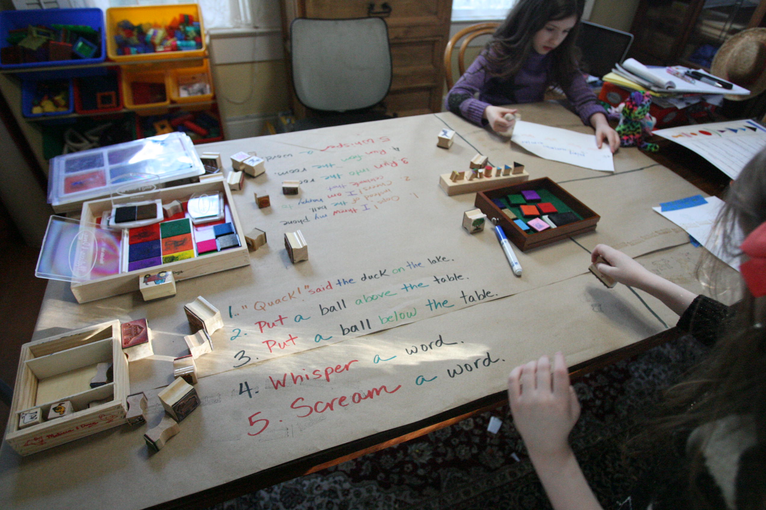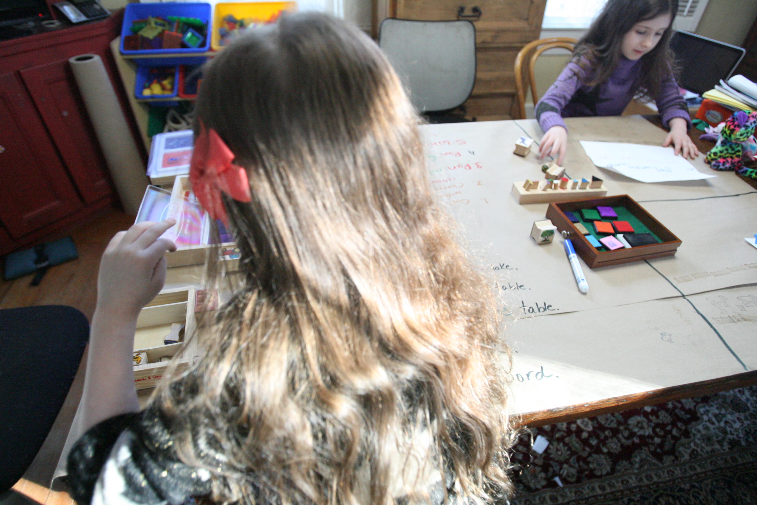 After the girls used their wooden pieces to match up on the grammar board we spread out paper on the table and covered some of those same sentences by using the grammar stamps to find out the language parts.