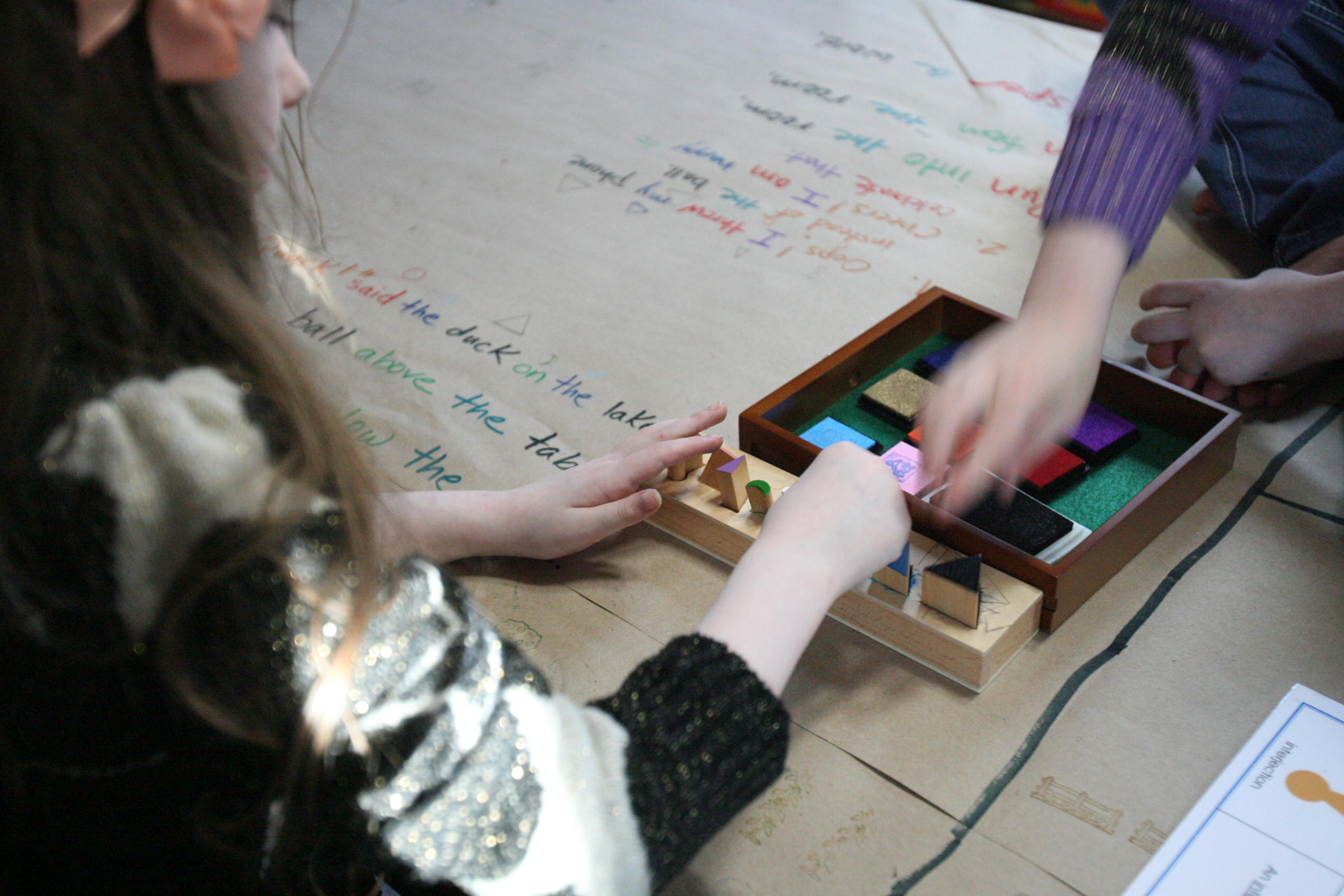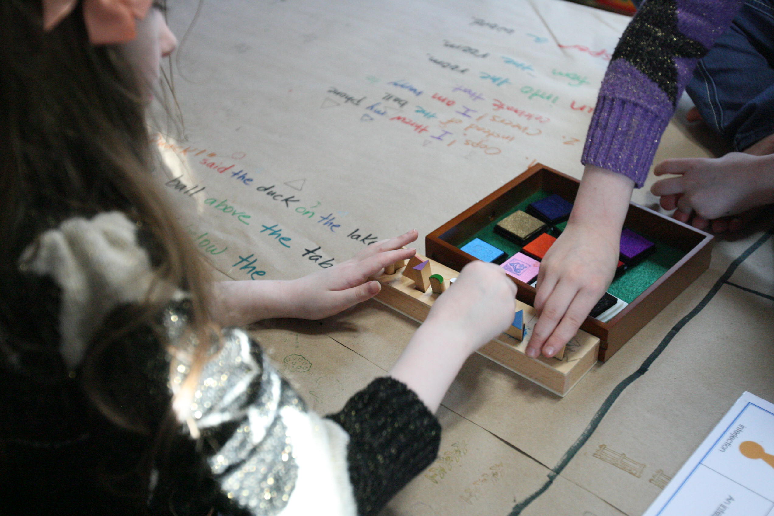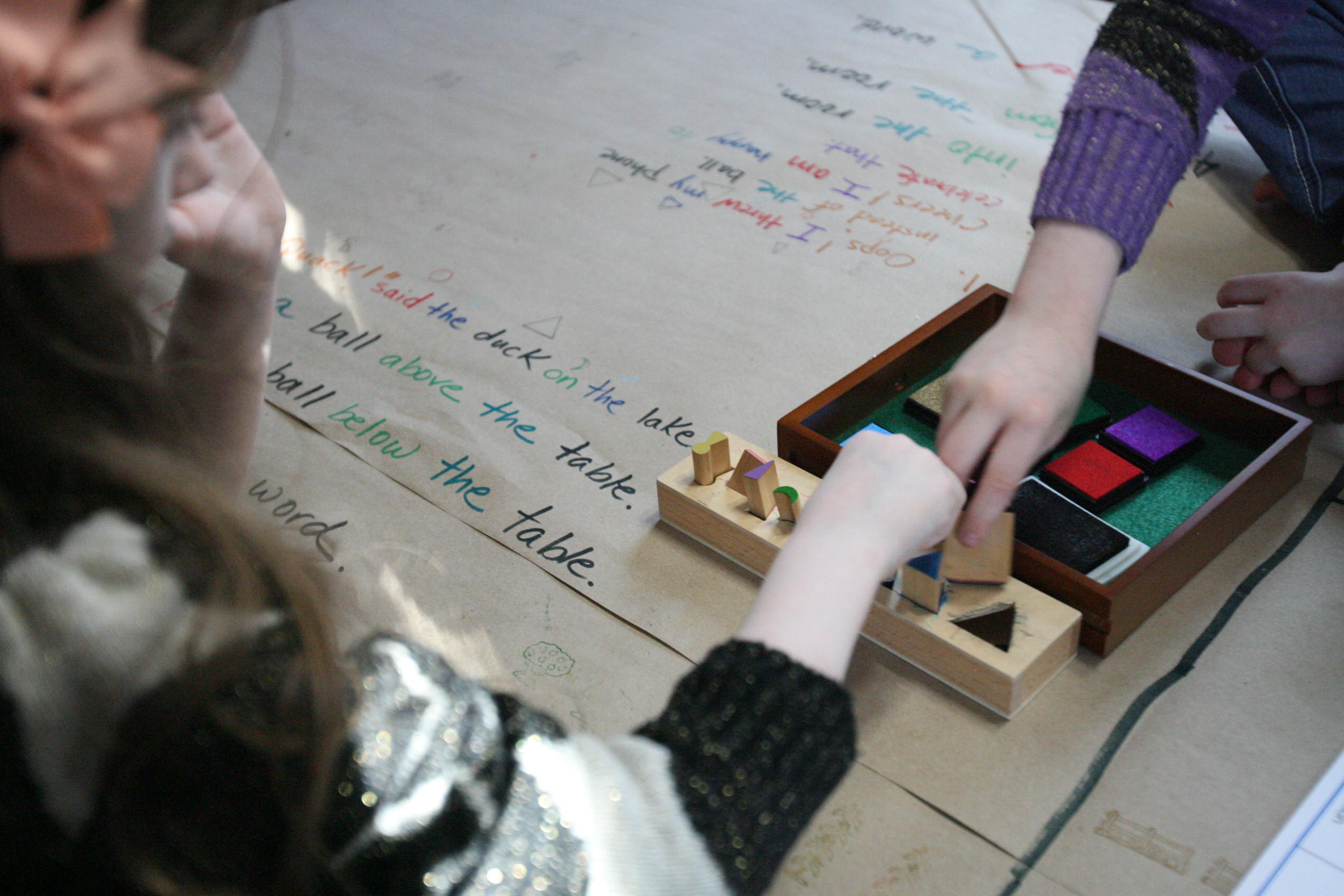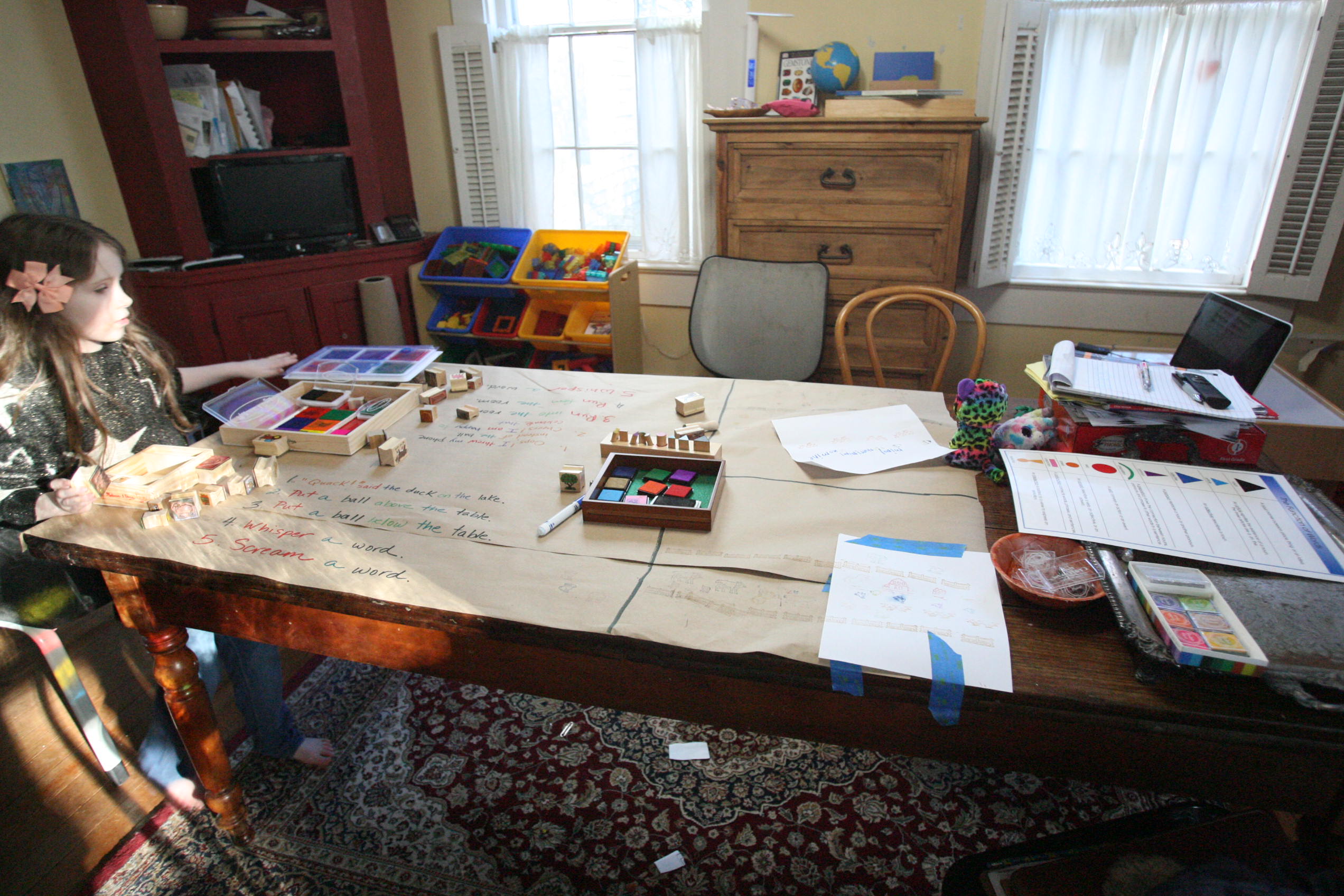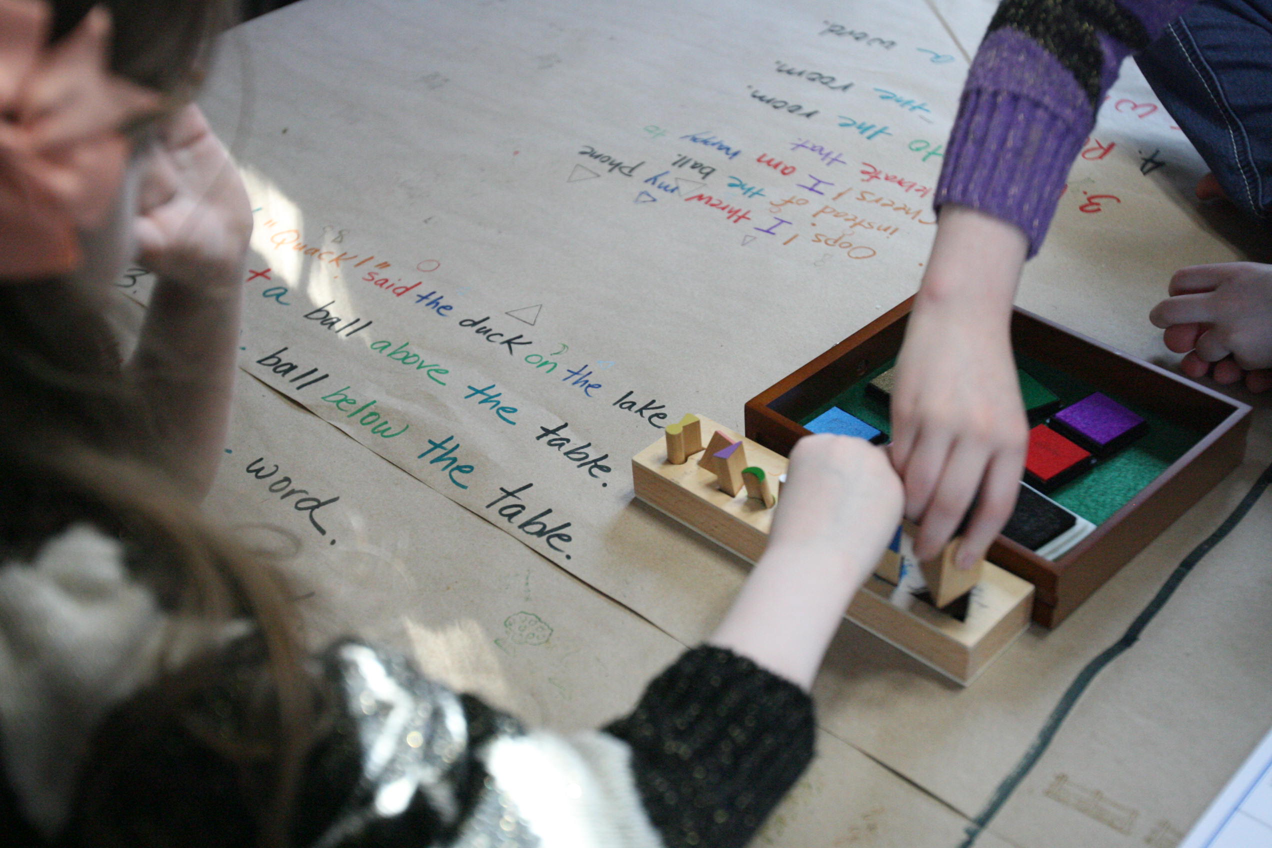 After the girls used their wooden pieces to match up on the grammar board we spread out paper on the table and covered some of those same sentences by using the grammar stamps to find out the language parts.