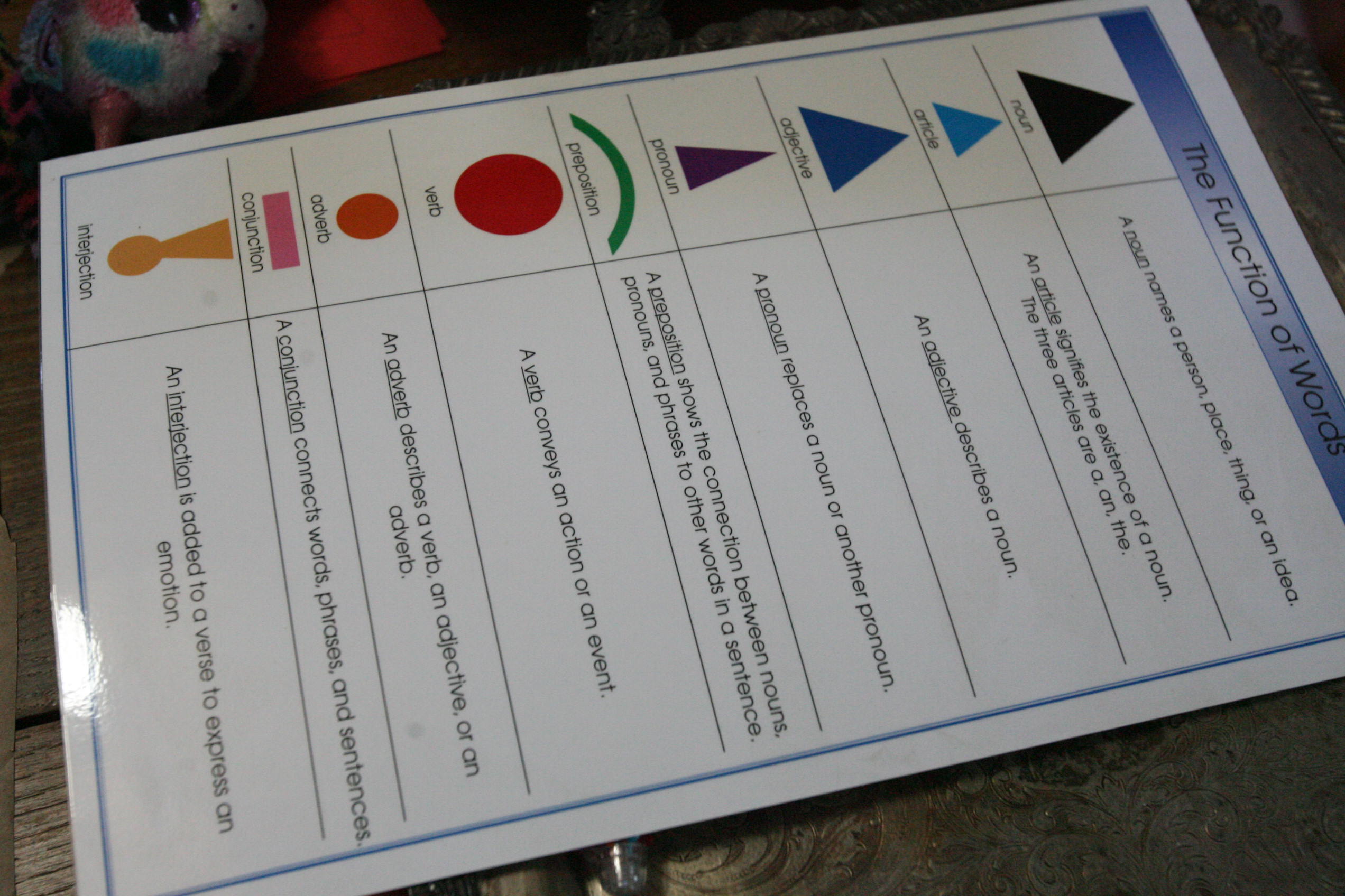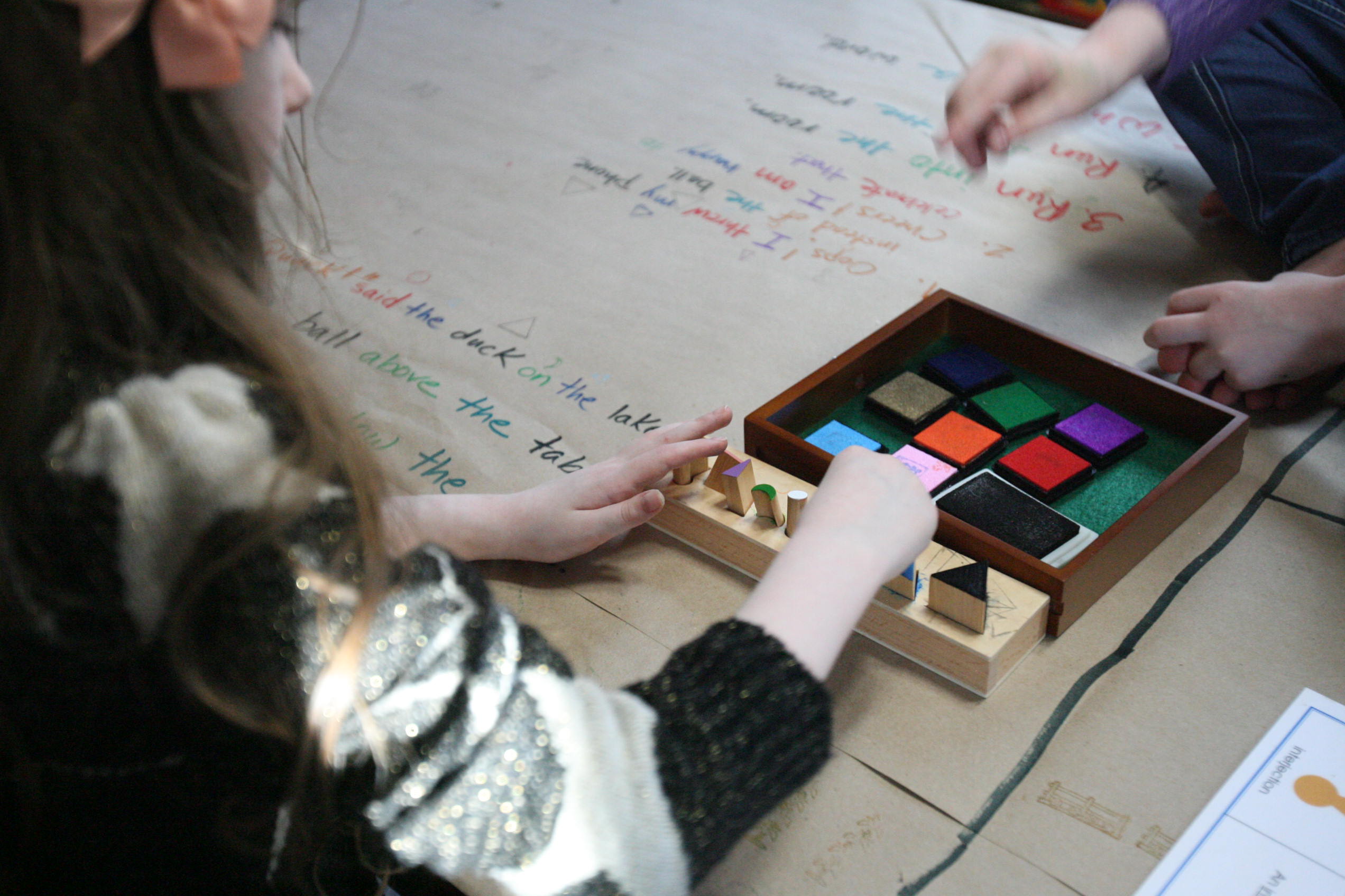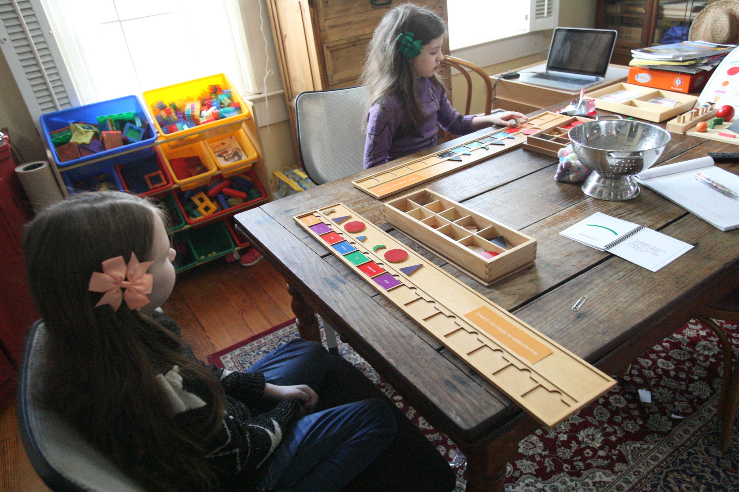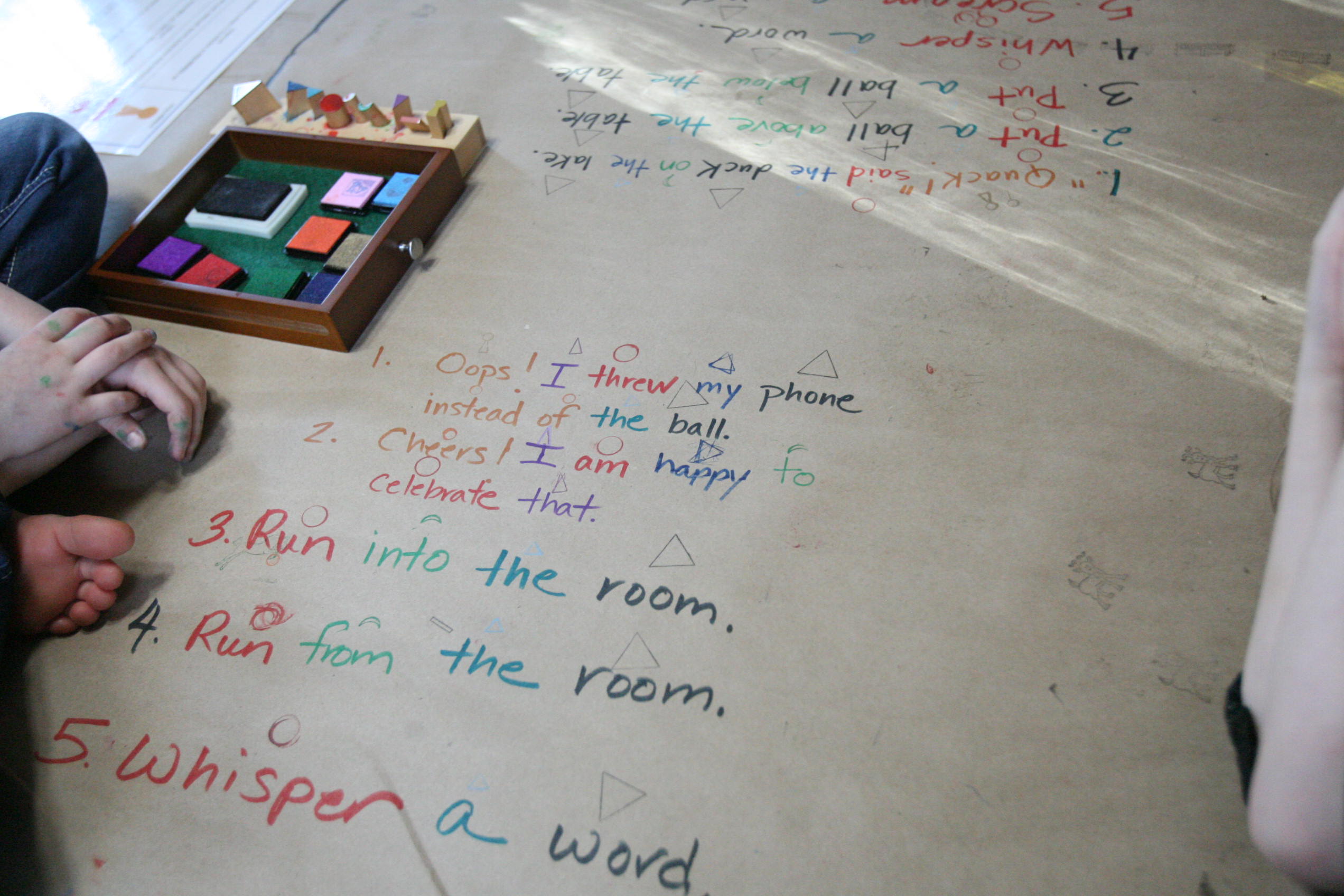 After the girls used their wooden pieces to match up on the grammar board we spread out paper on the table and covered some of those same sentences by using the grammar stamps to find out the language parts.