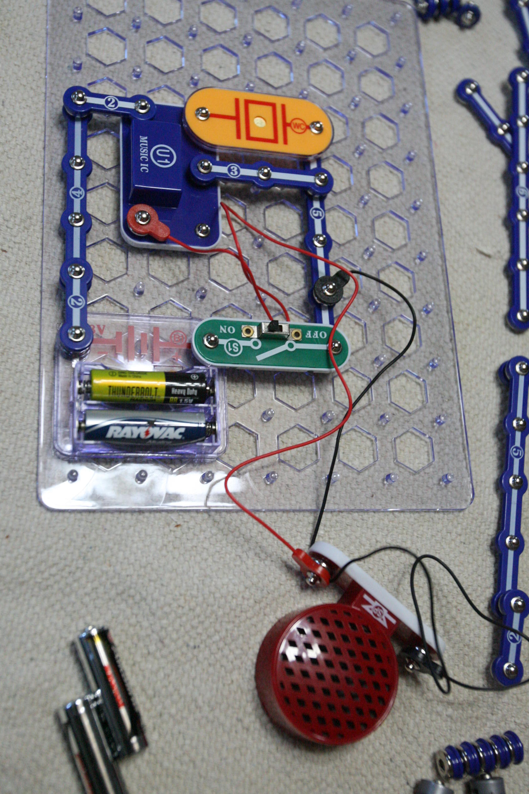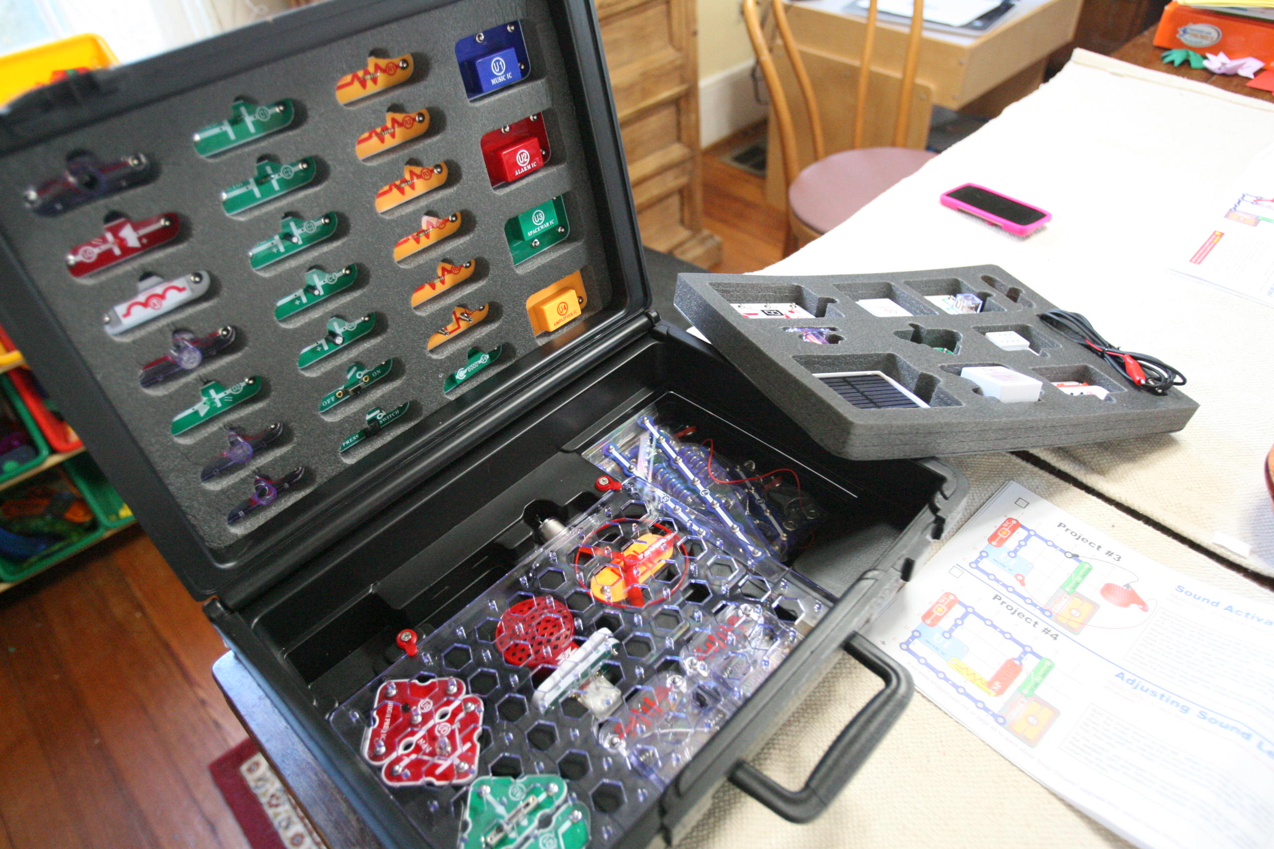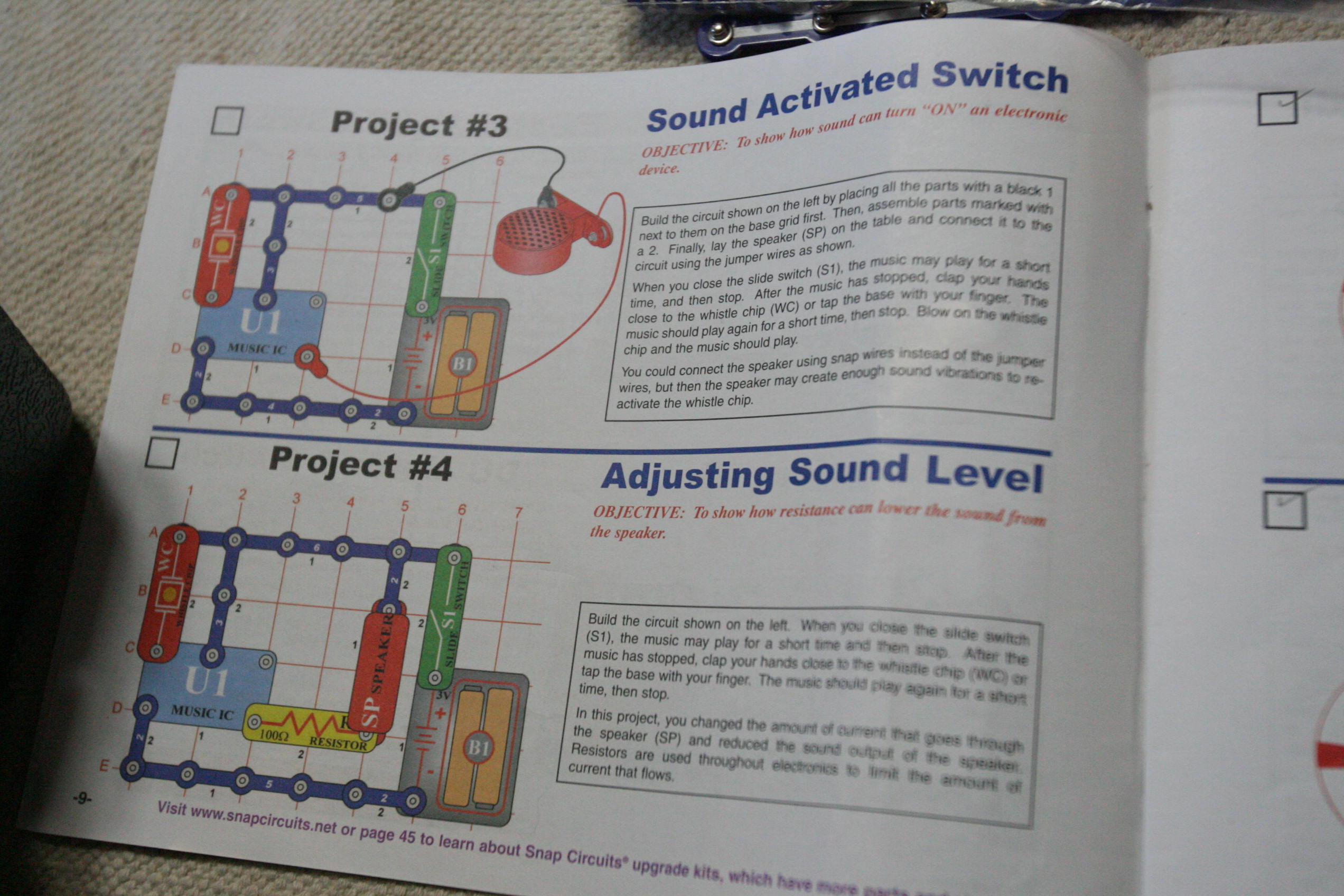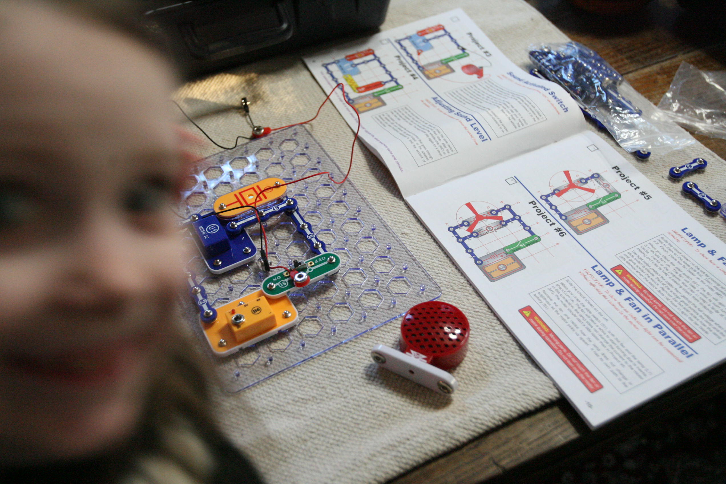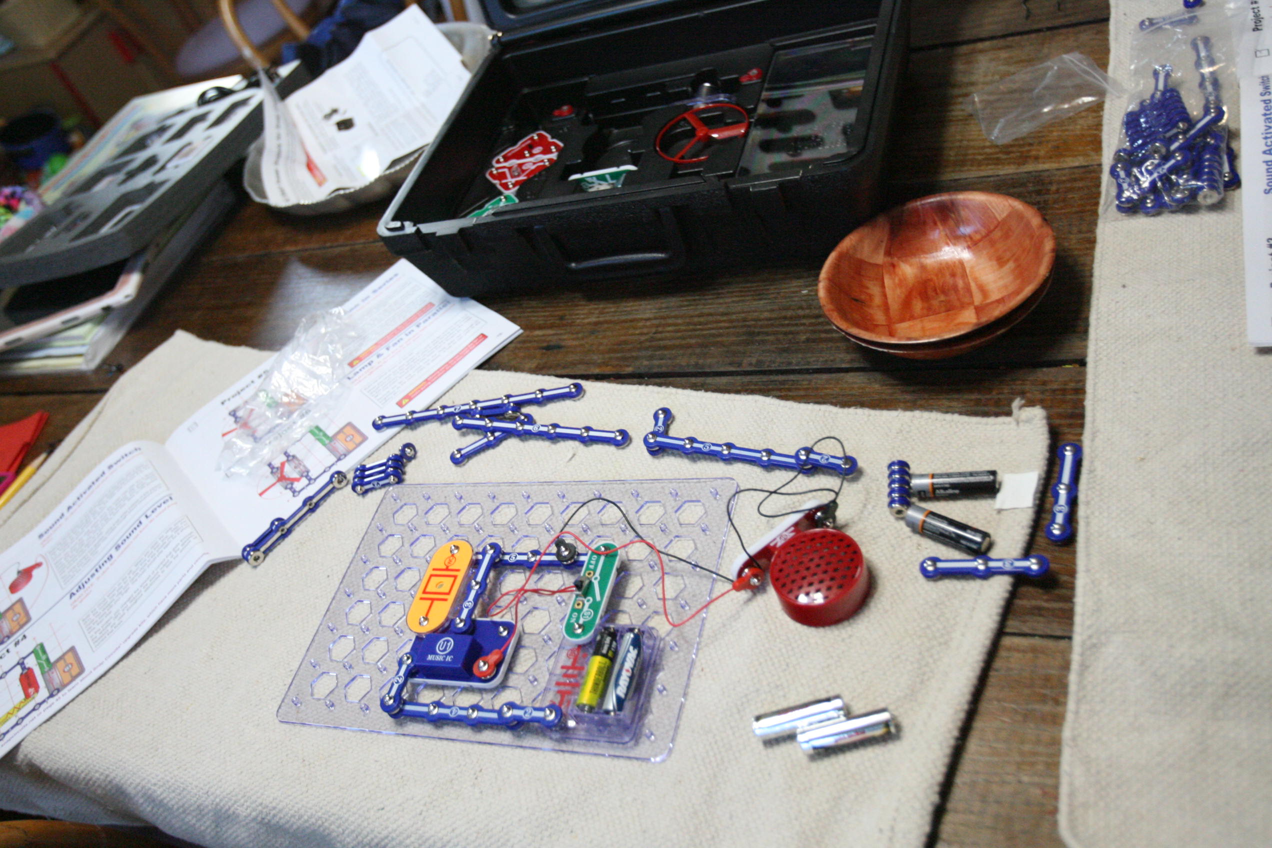 After working with grammar we took out the Snap Circuits for a good portion of the day and created various projects. Below is pictured using sound to start up a speaker to play a song using a switch, a sound sensor, wires, and a battery pack/electricity pack.
