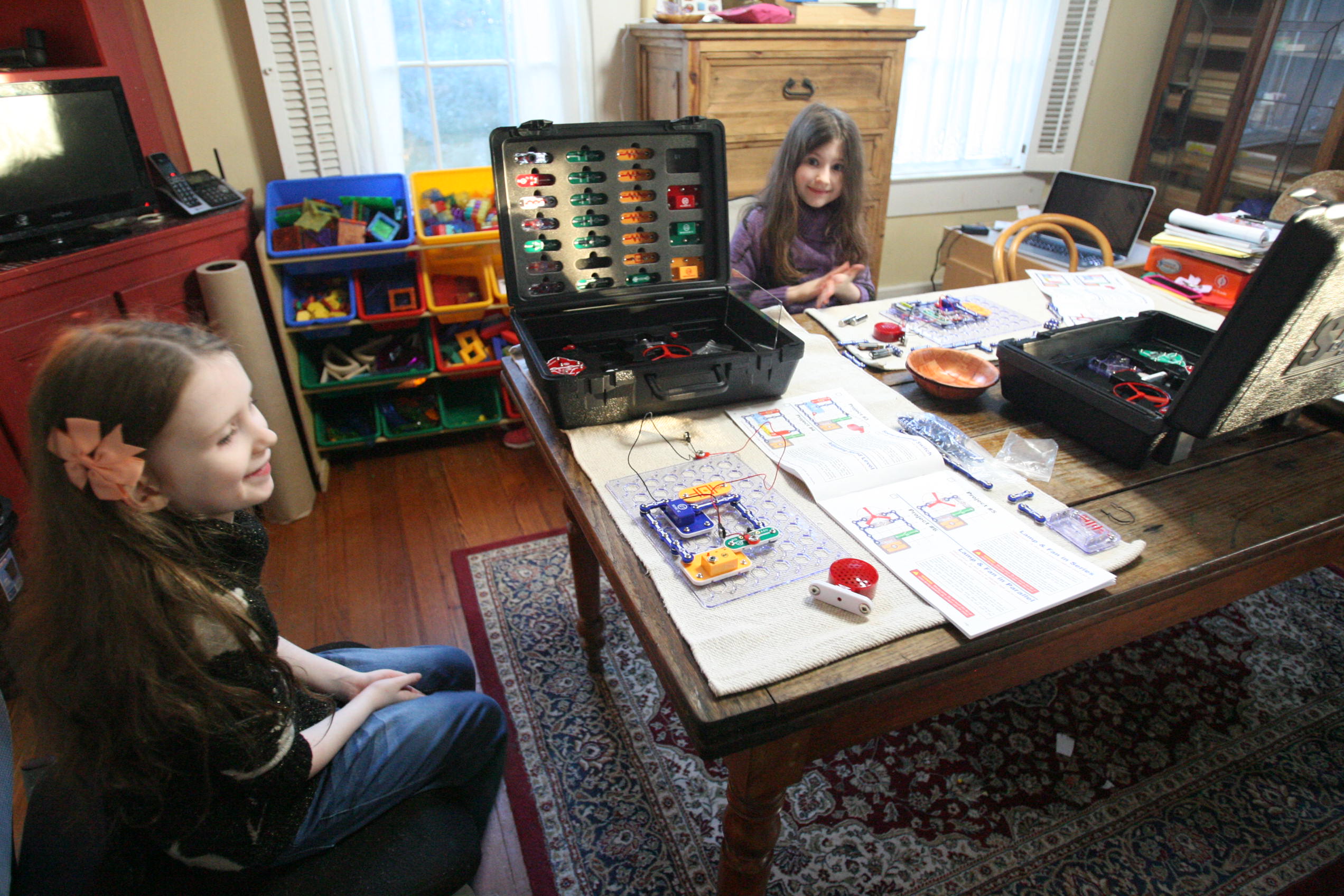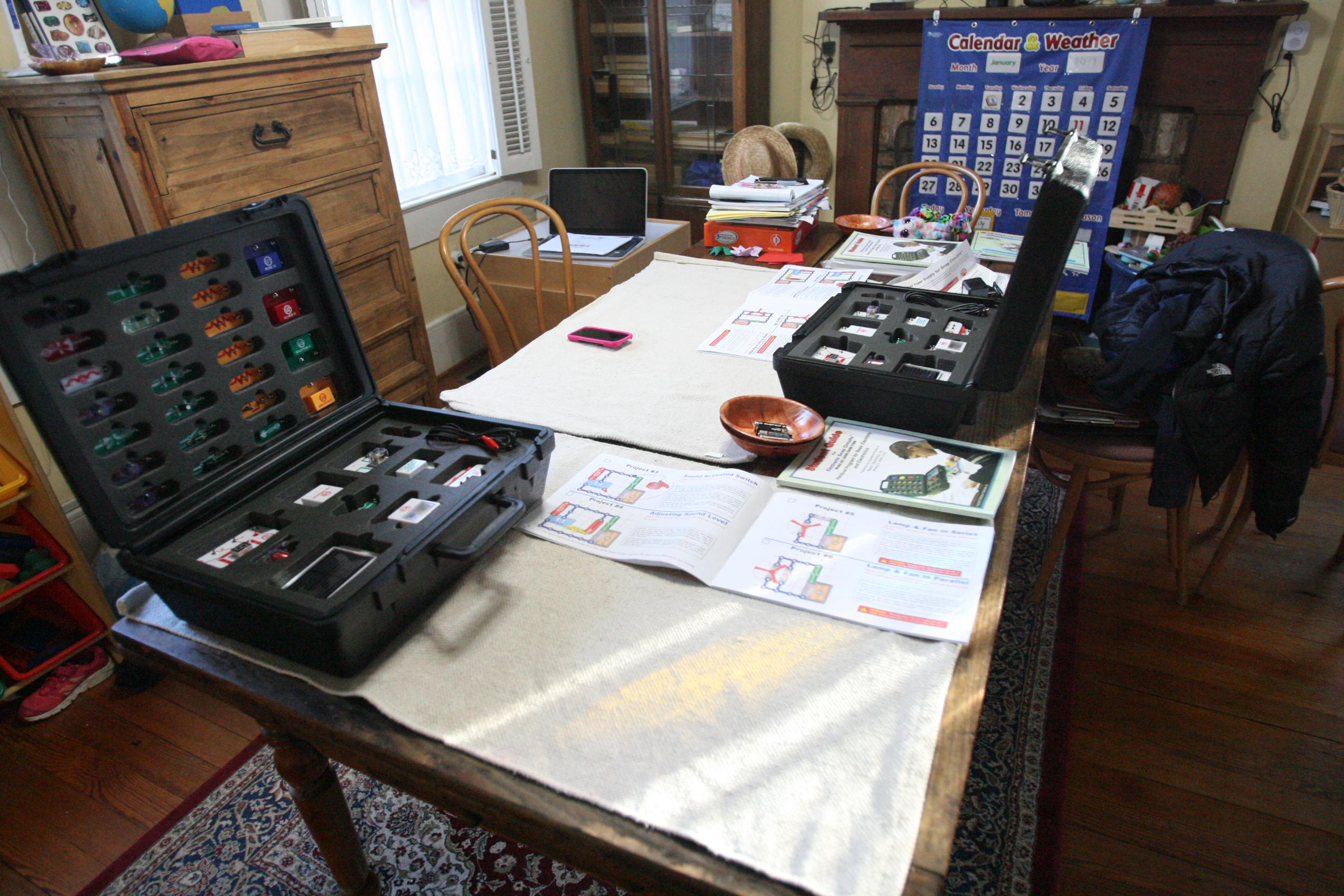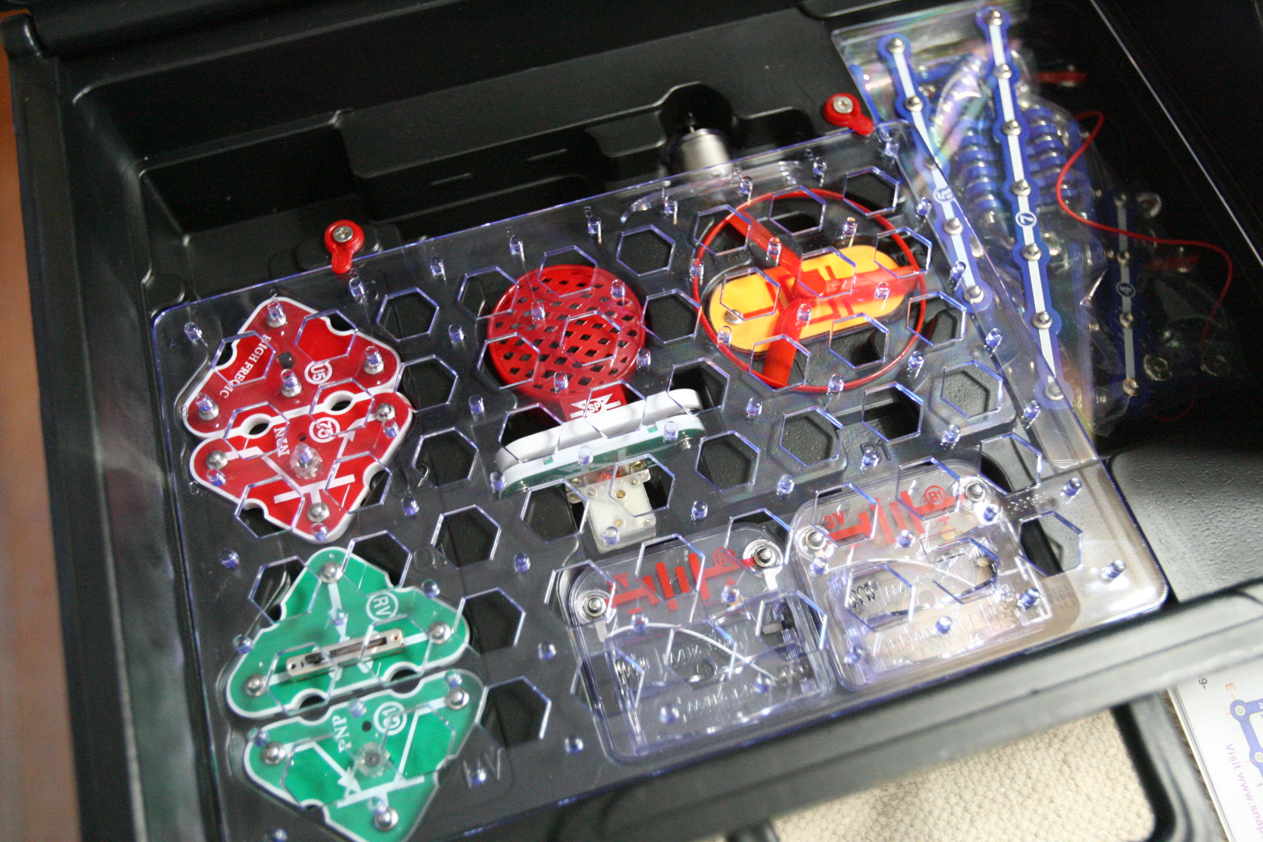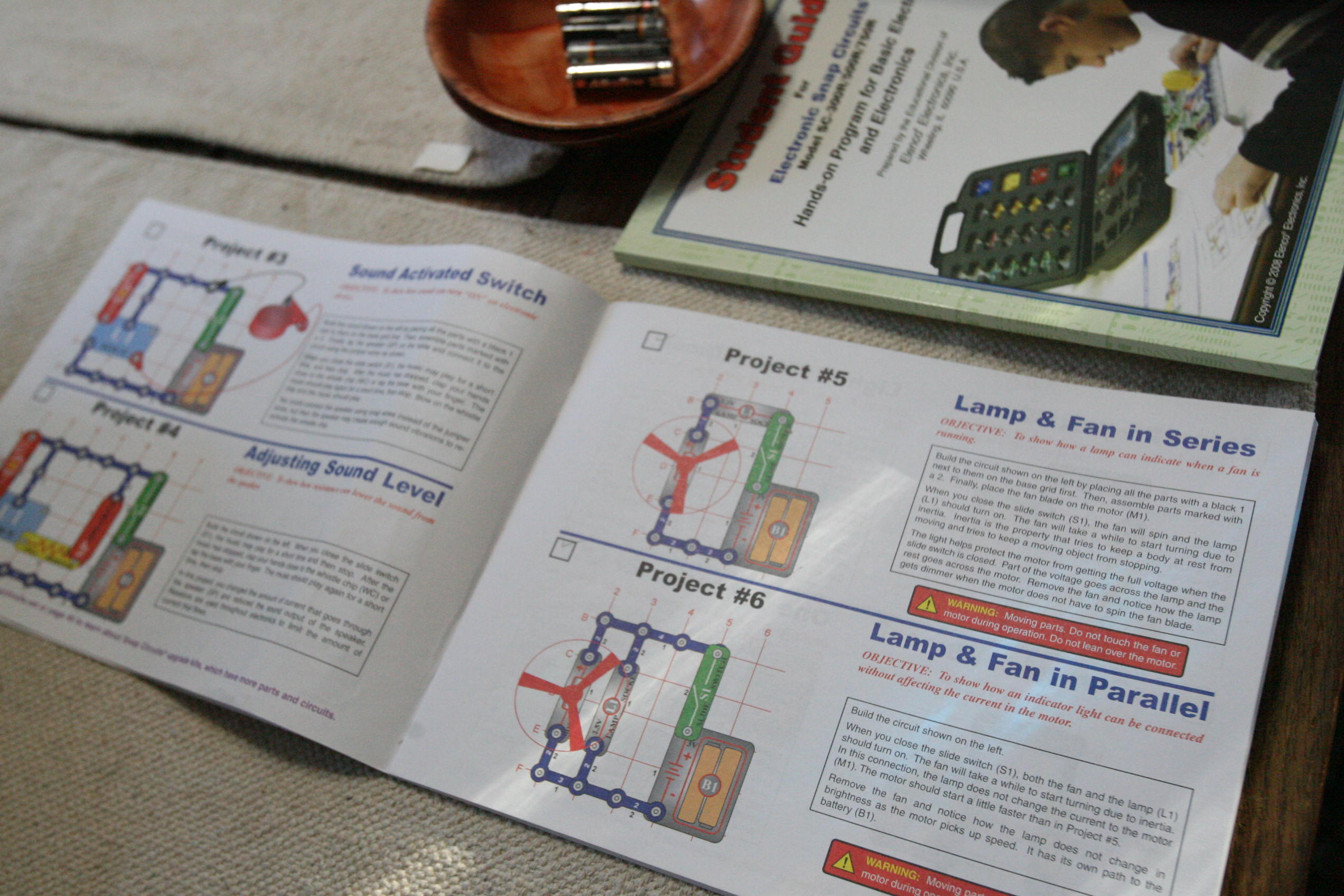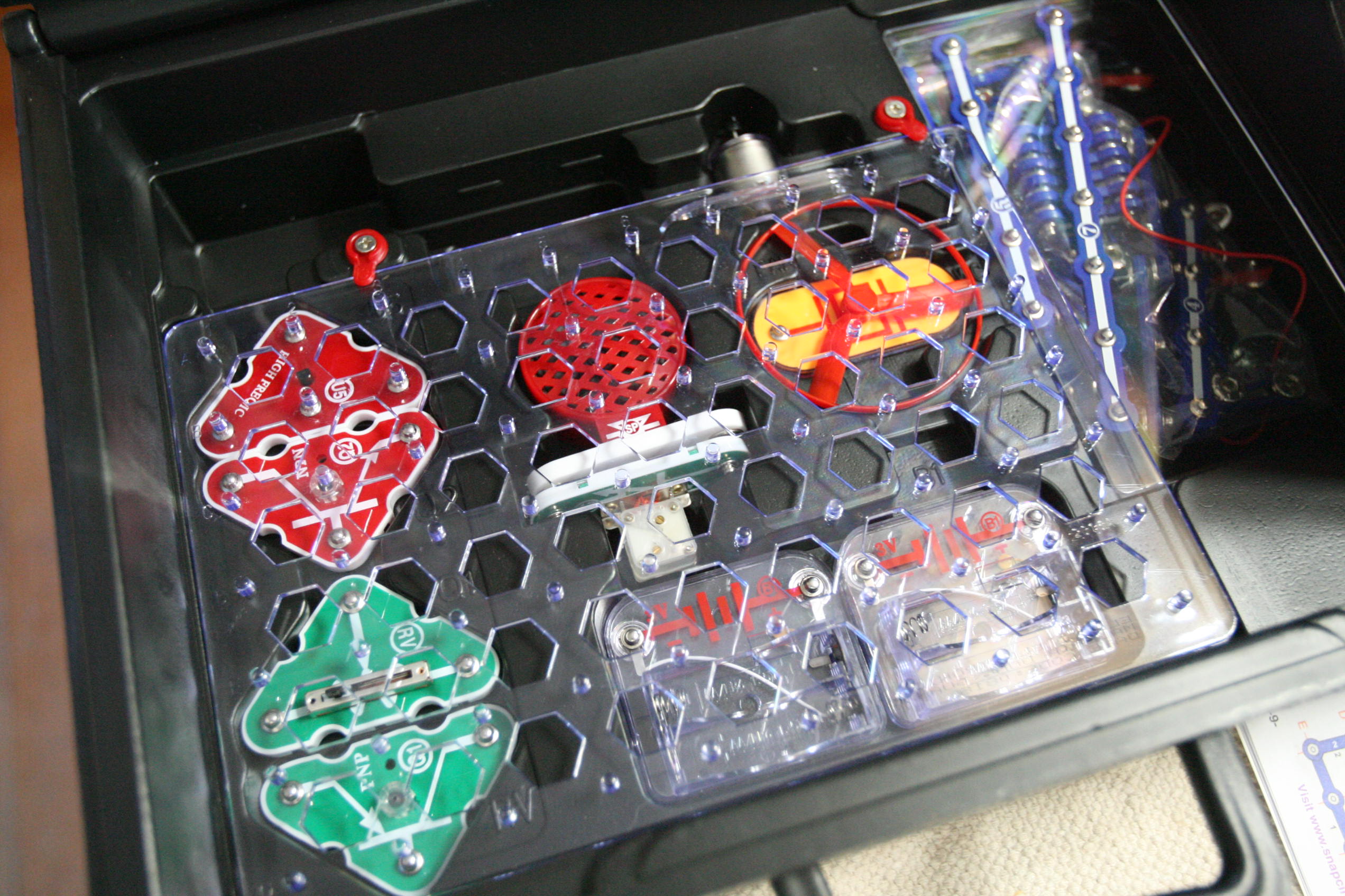 After working with grammar we took out the Snap Circuits for a good portion of the day and created various projects. Below is pictured using sound to start up a speaker to play a song using a switch, a sound sensor, wires, and a battery pack/electricity pack.