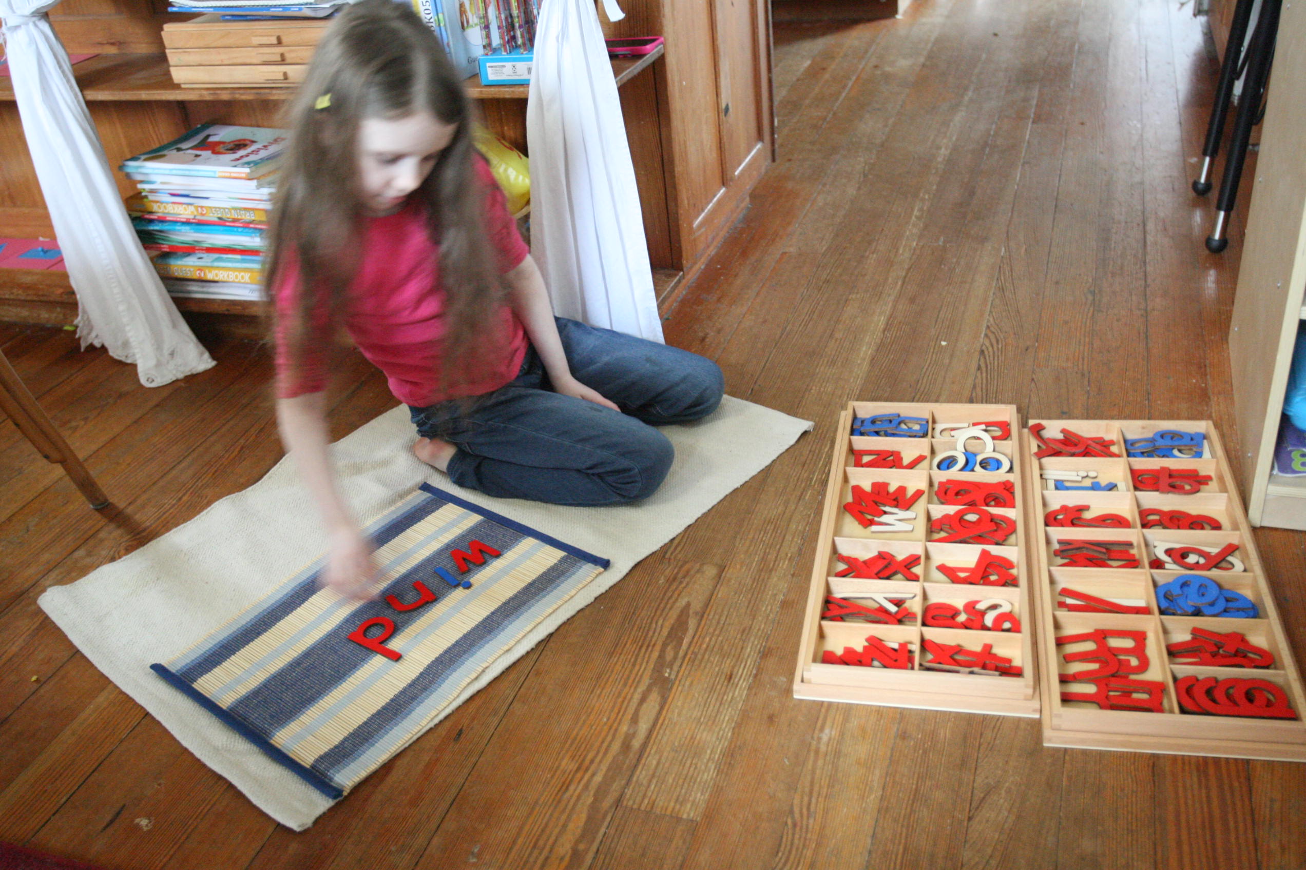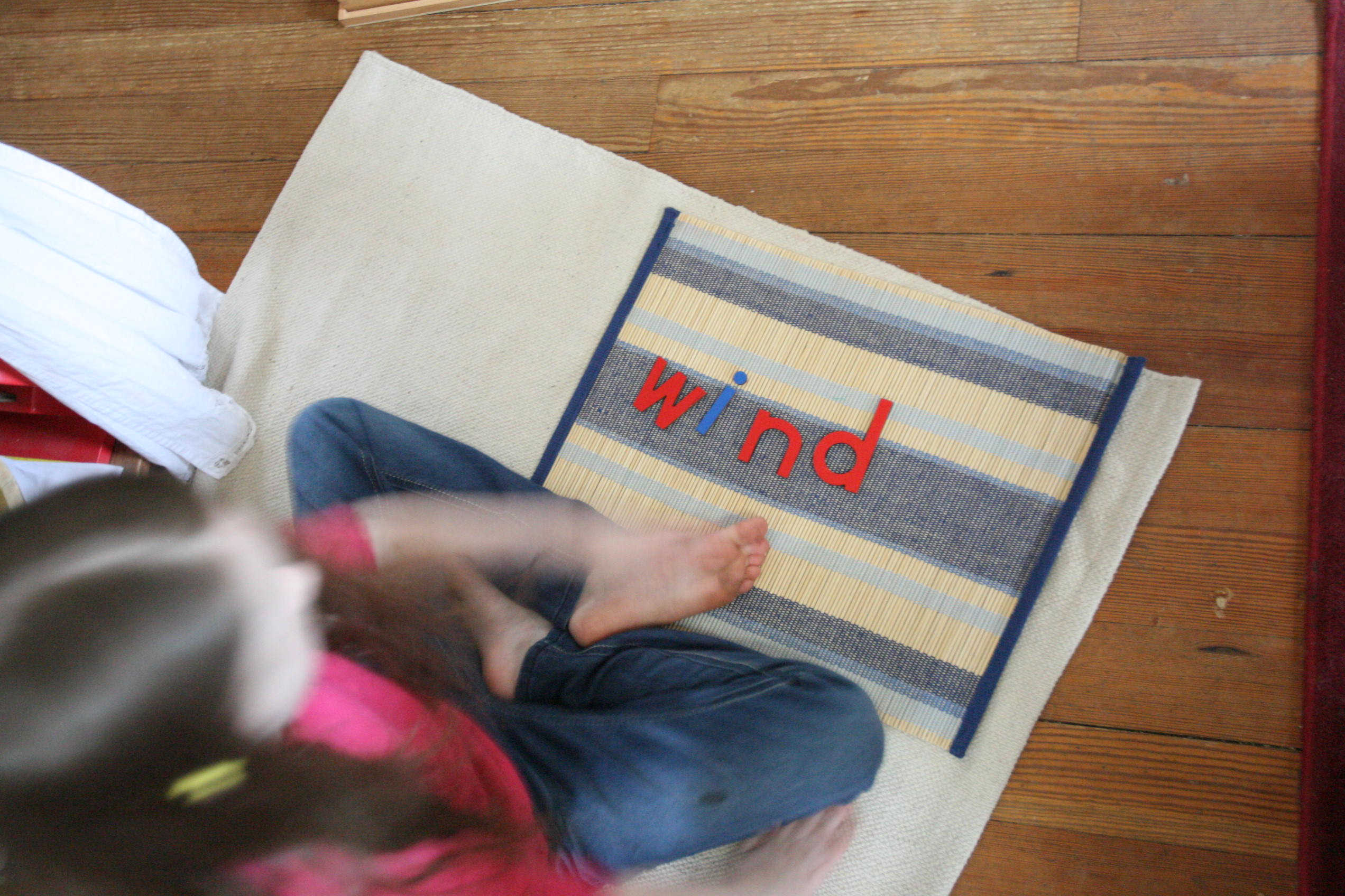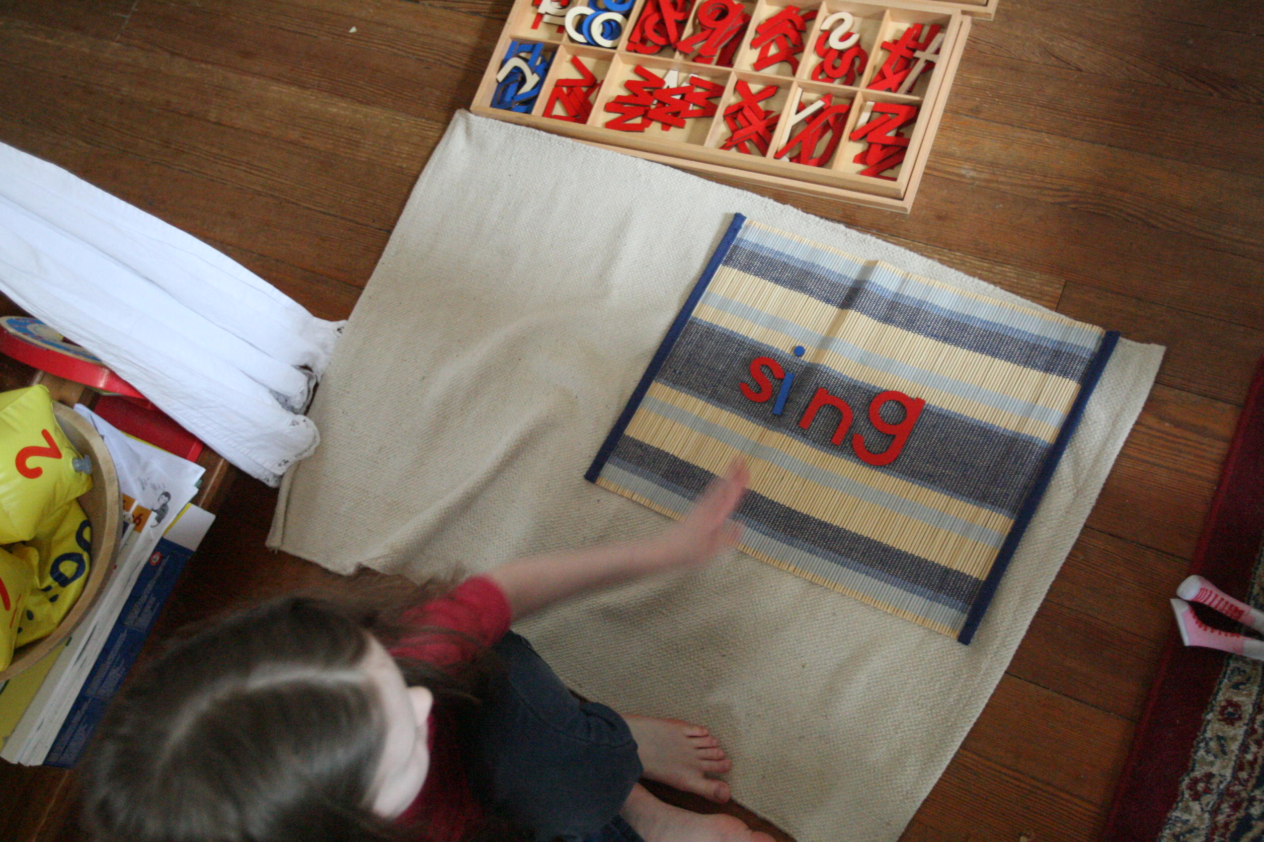 So above the girls are working on the Hooked on Phonics series and while one reads out loud the other works on matching up words to pictures according to sound sets or word relationship to picture. We used the moveable alphabet this day for spelling words too.