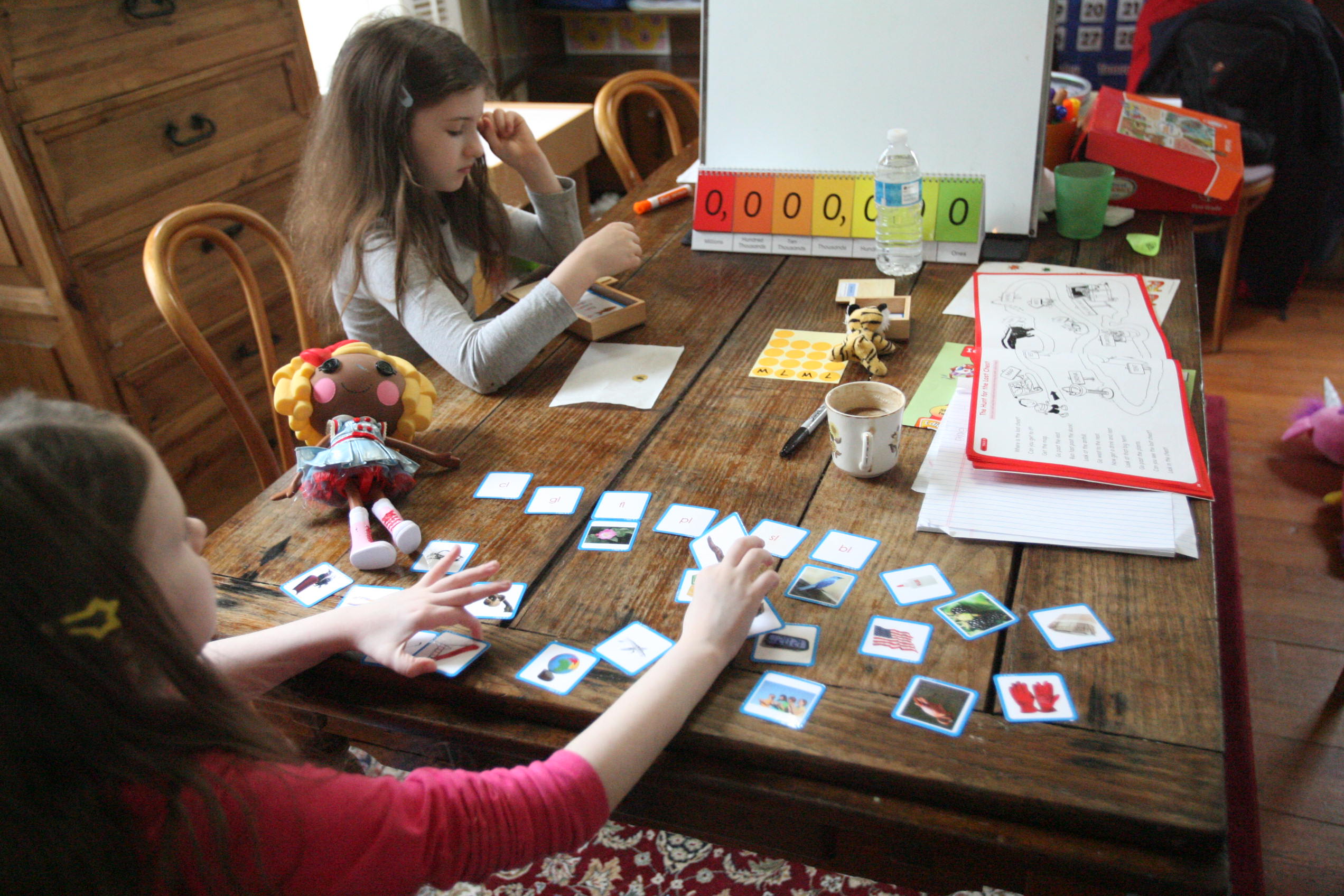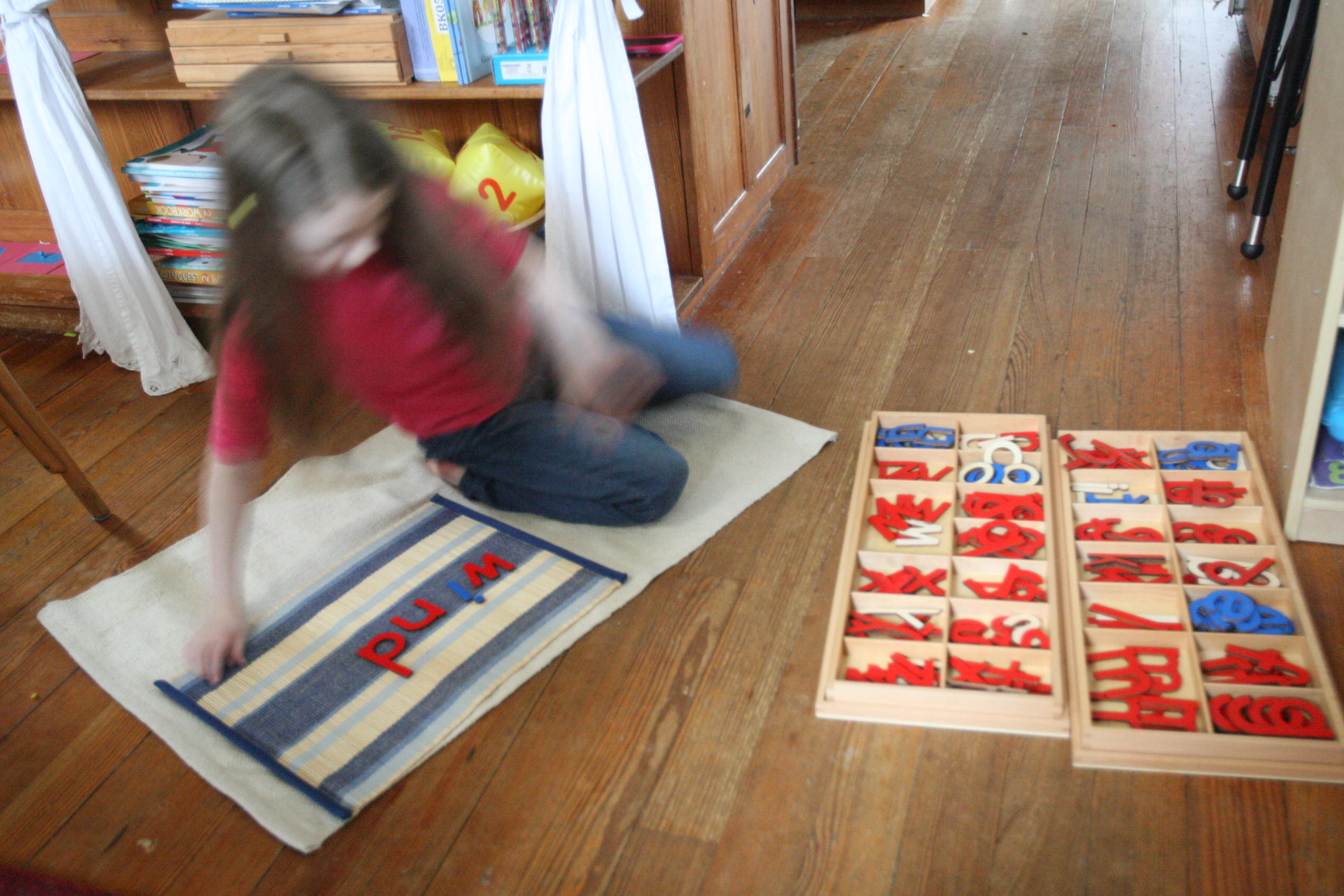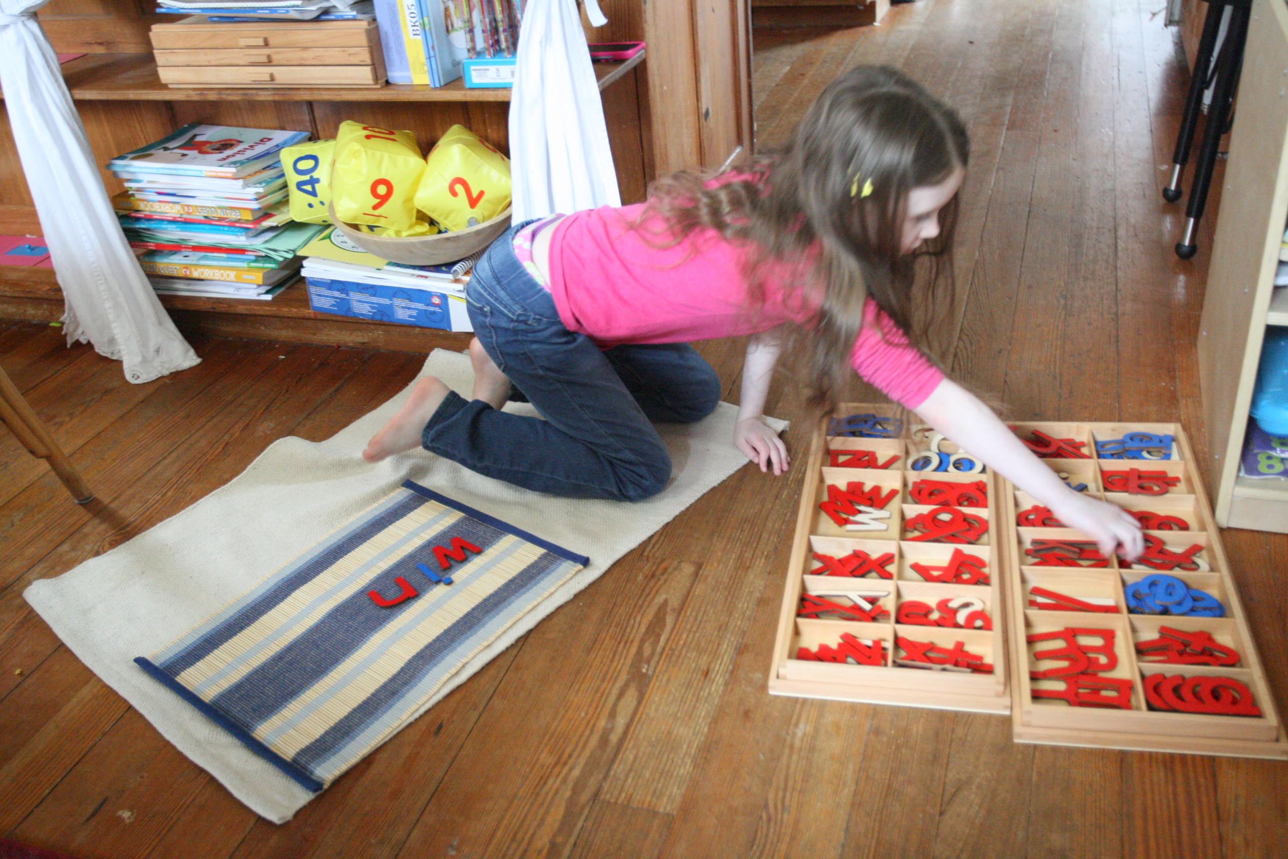 So above the girls are working on the Hooked on Phonics series and while one reads out loud the other works on matching up words to pictures according to sound sets or word relationship to picture. We used the moveable alphabet this day for spelling words too.