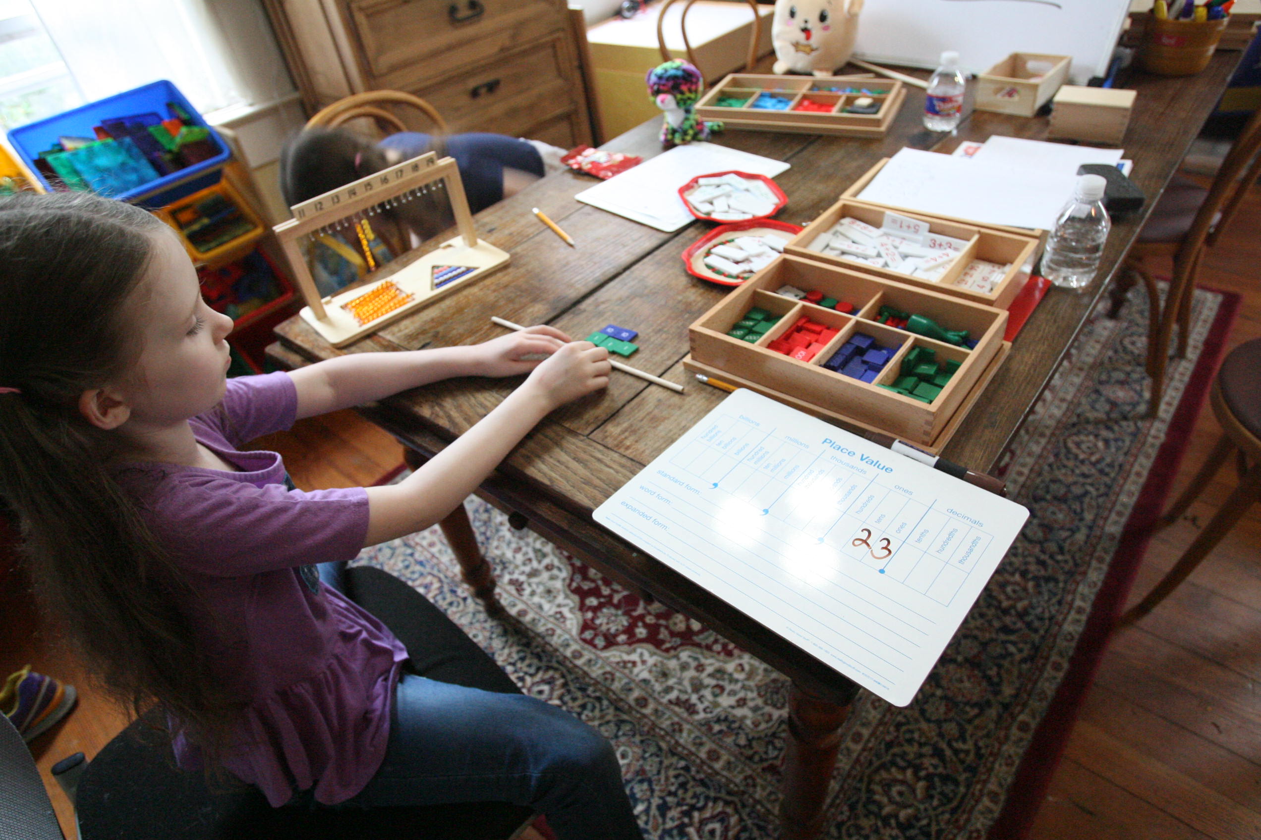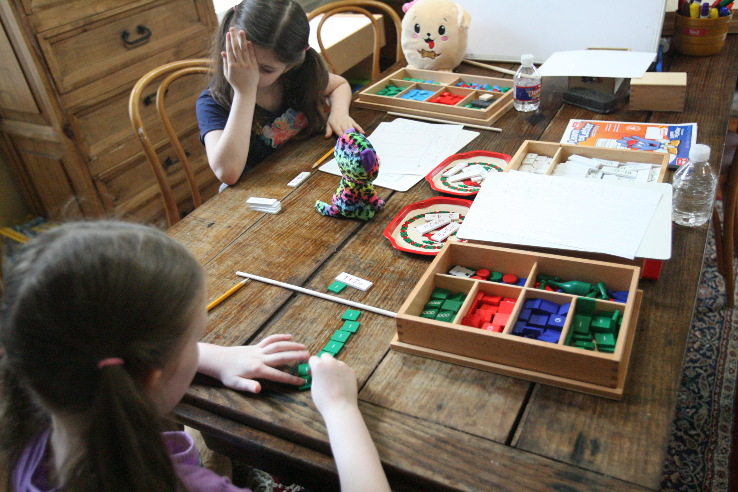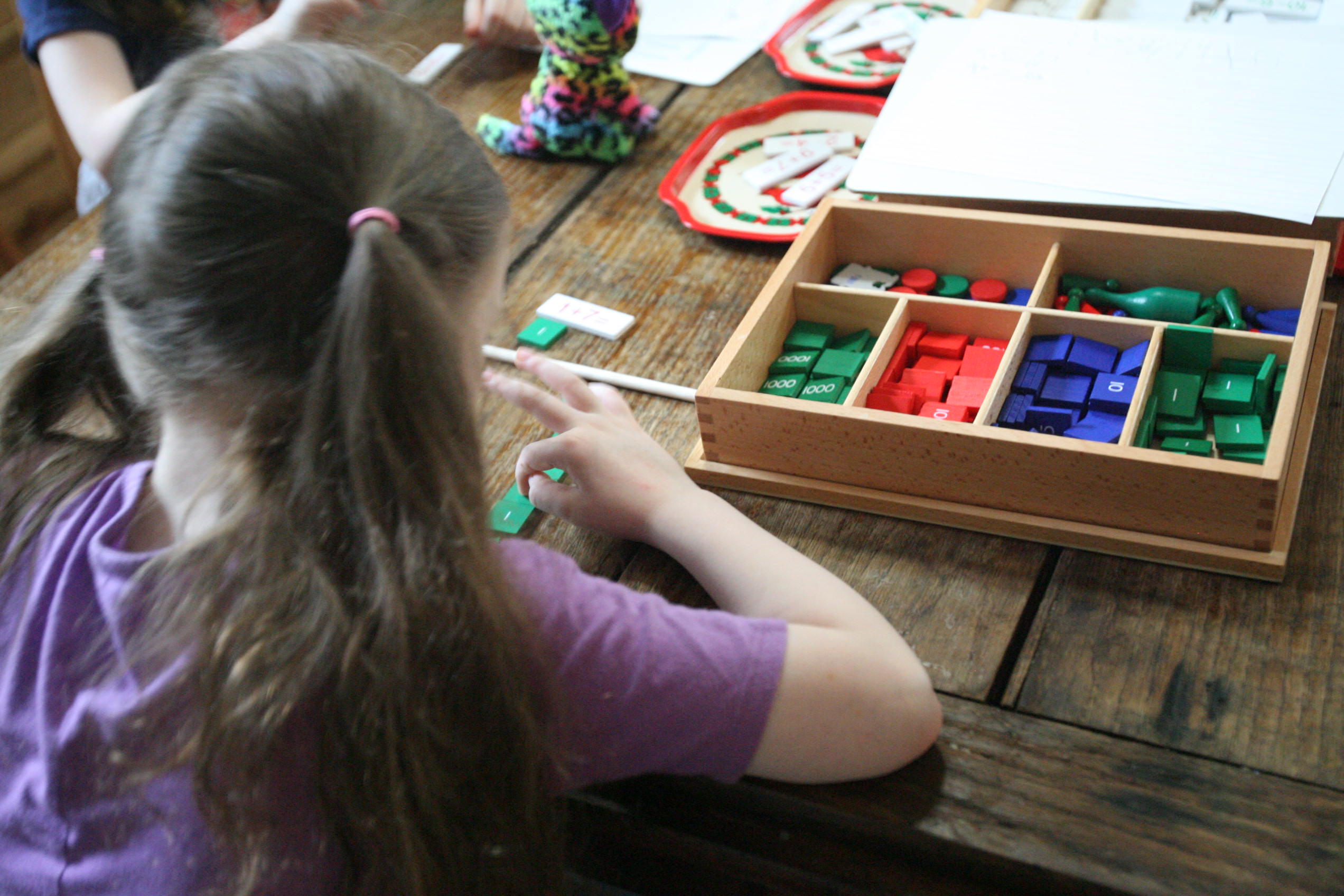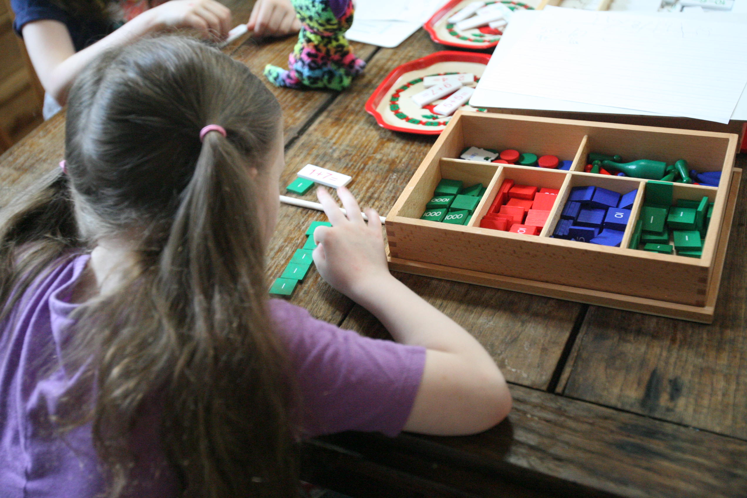Above the girls are using the Stamp Game to work simple addition and subtraction to prepare them for multiplication with the stamp game. We use our multiplication boards for multiplication quite often so working with the stamp game will be different with the option to exchange tens for ones as we do in general math (though with the stamp game you get the opportunity to see the physical reaction versus just working with the numbers on paper). We will be working with the division board after a day or two of multiplication and shortly thereafter the long division work that we are all very excited about using.