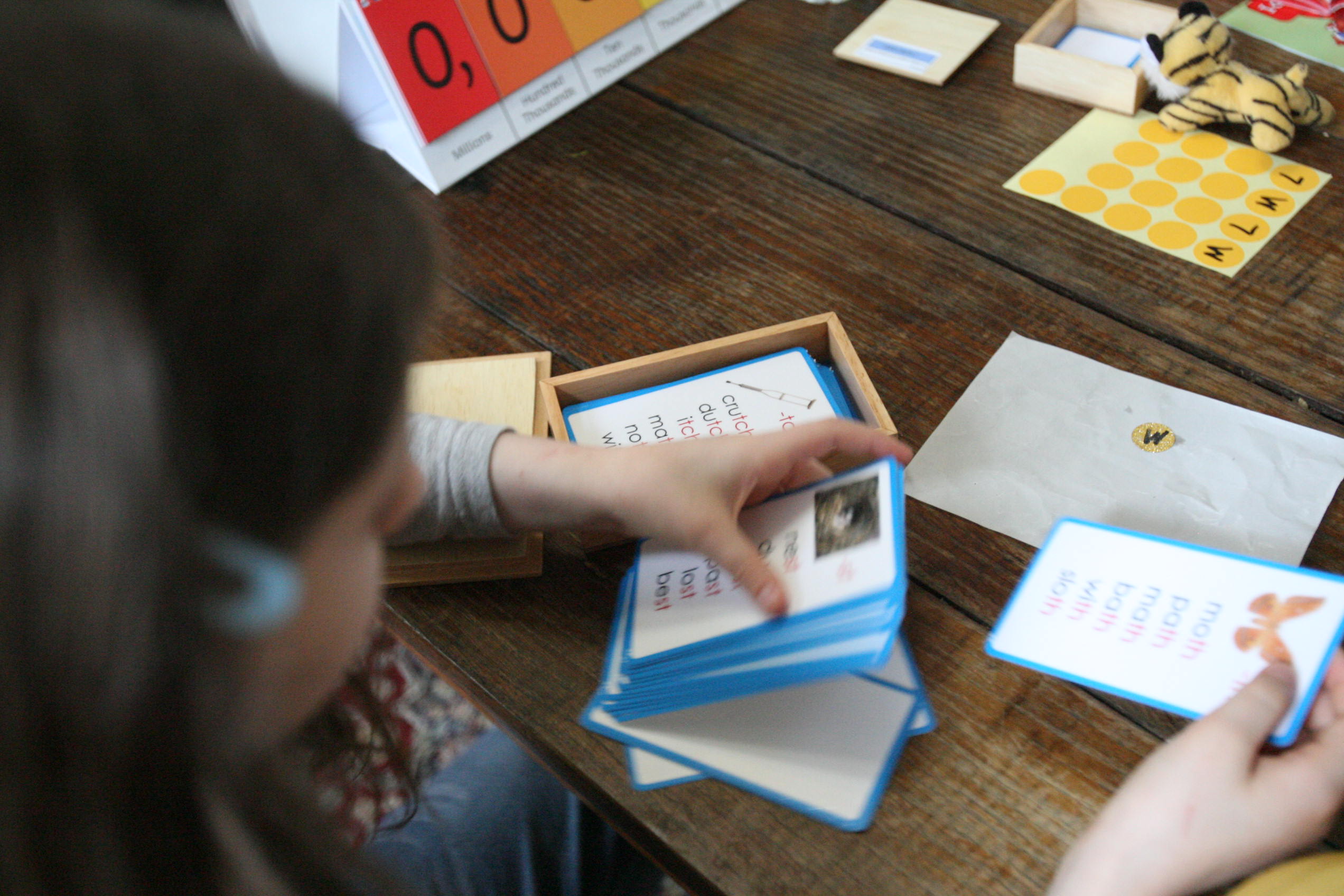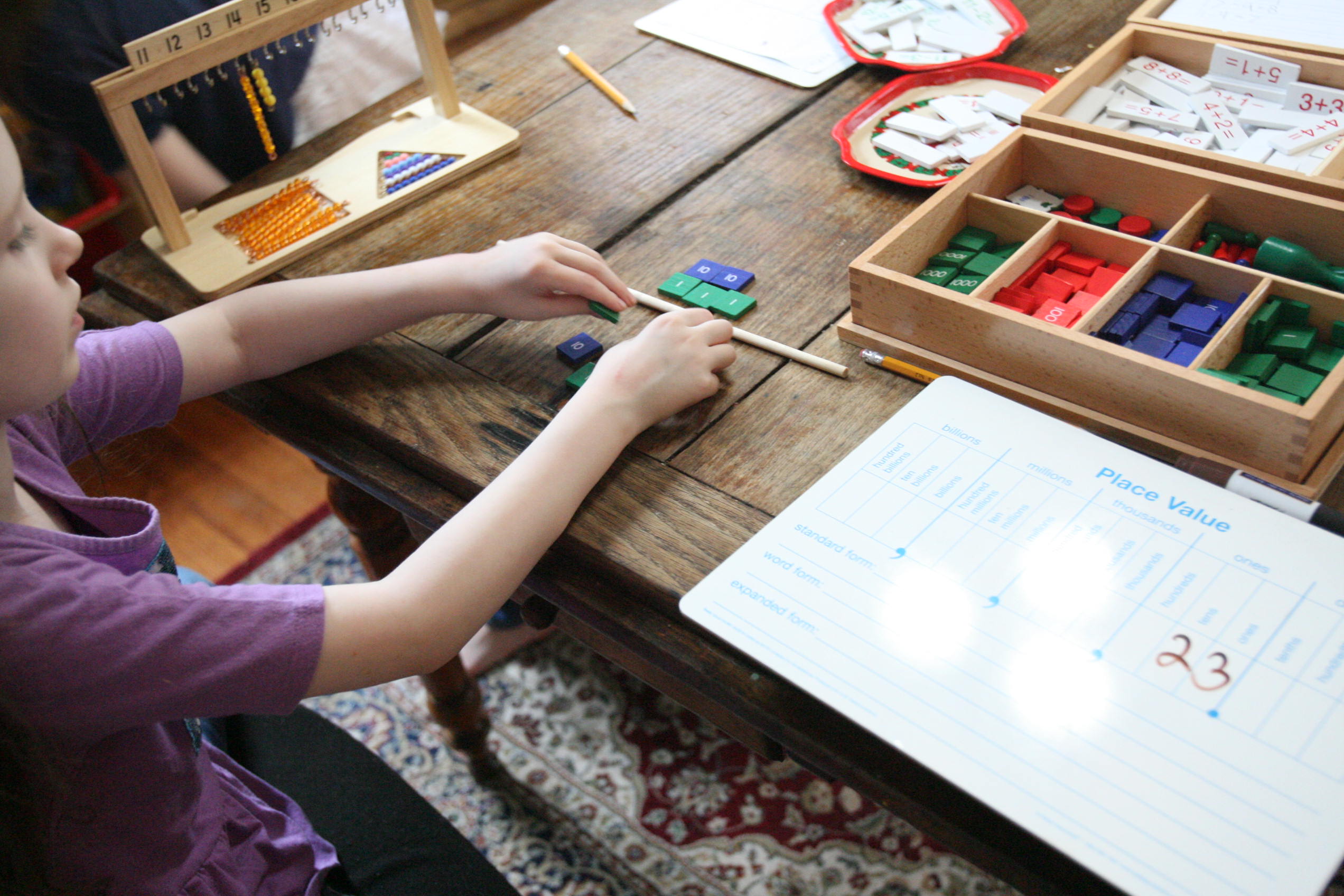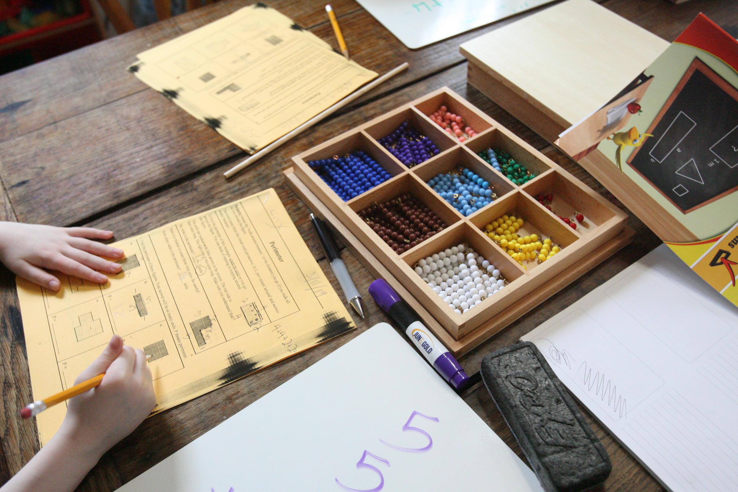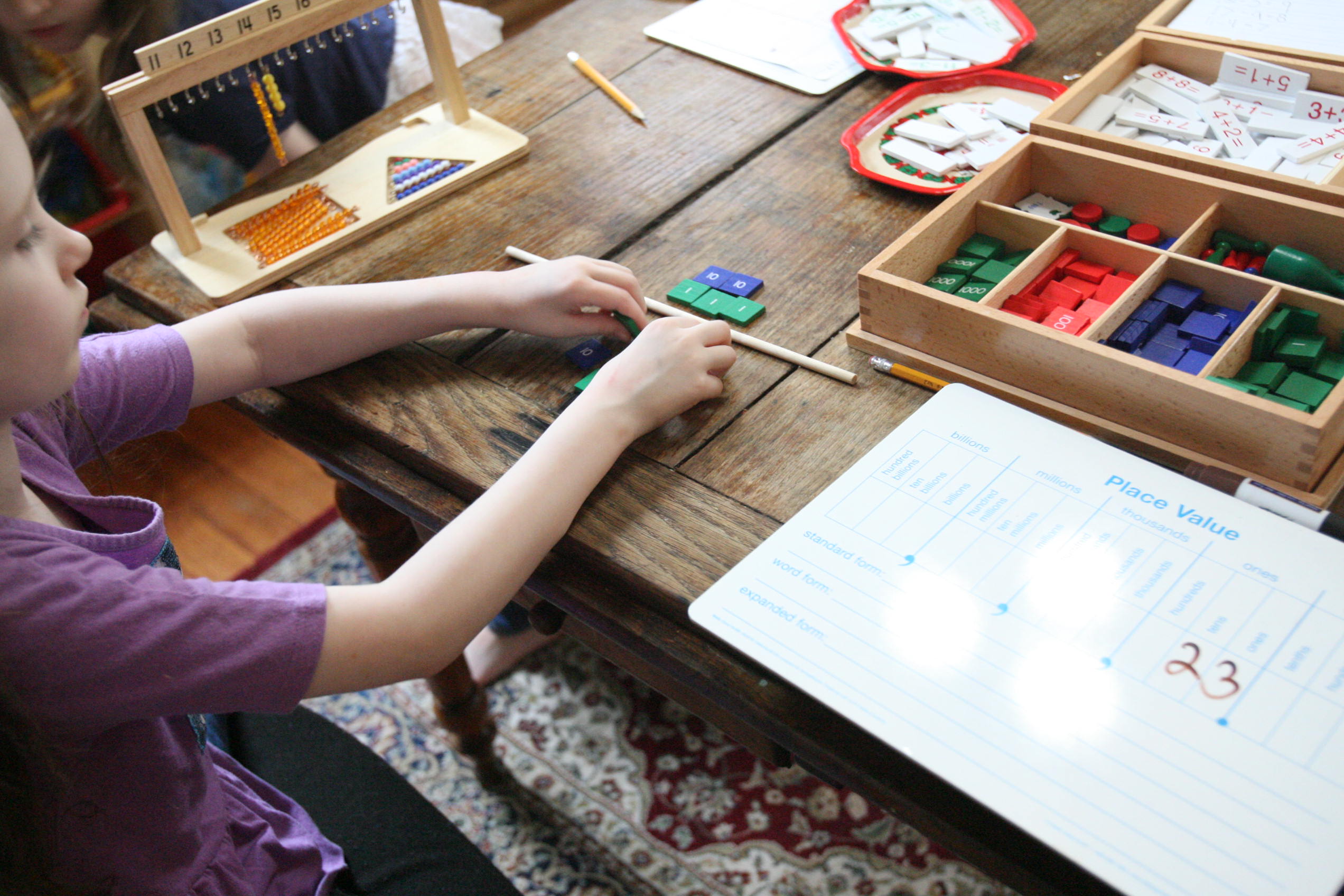 Above the girls are using the Stamp Game to work simple addition and subtraction to prepare them for multiplication with the stamp game. We use our multiplication boards for multiplication quite often so working with the stamp game will be different with the option to exchange tens for ones as we do in general math (though with the stamp game you get the opportunity to see the physical reaction versus just working with the numbers on paper). We will be working with the division board after a day or two of multiplication and shortly thereafter the long division work that we are all very excited about using.