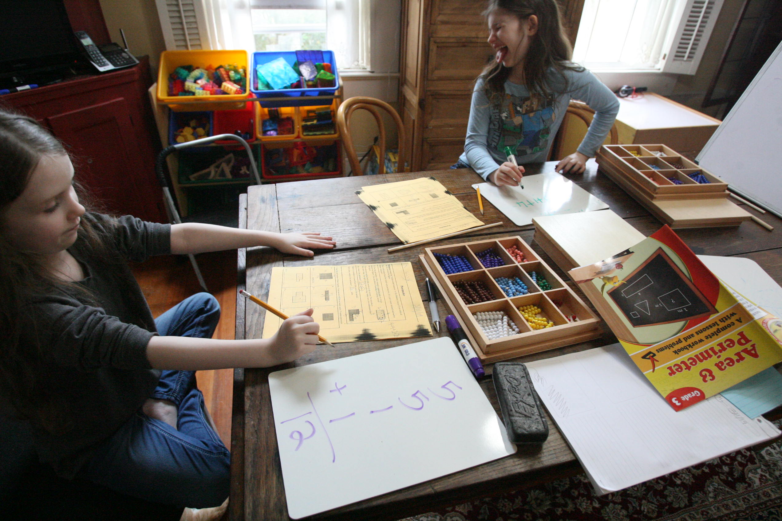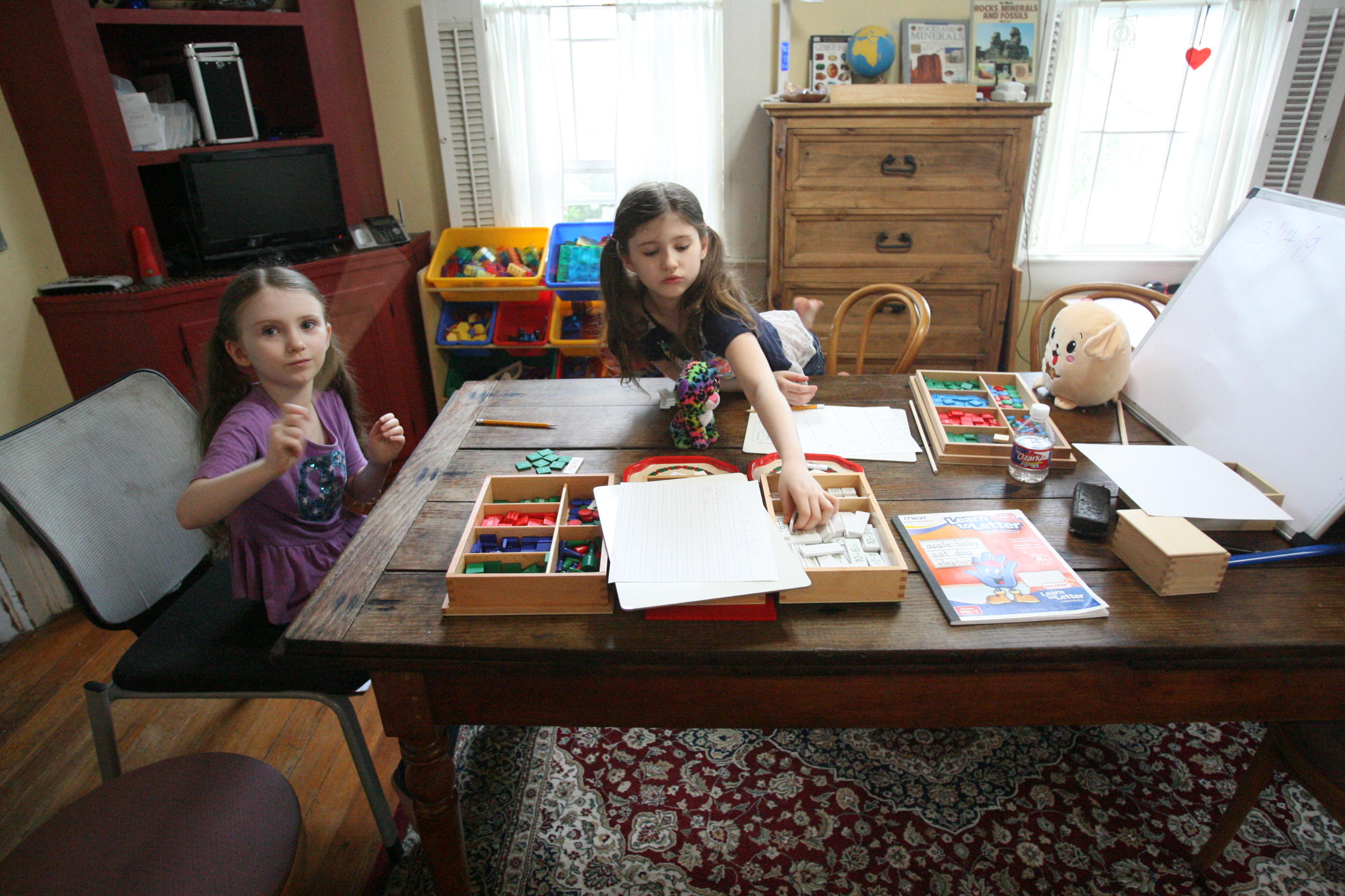 Above the girls are working on learning perimeter. After working on geometry I added the element of addition to help combine subjects while still keeping in track with the geometrical figures they love.