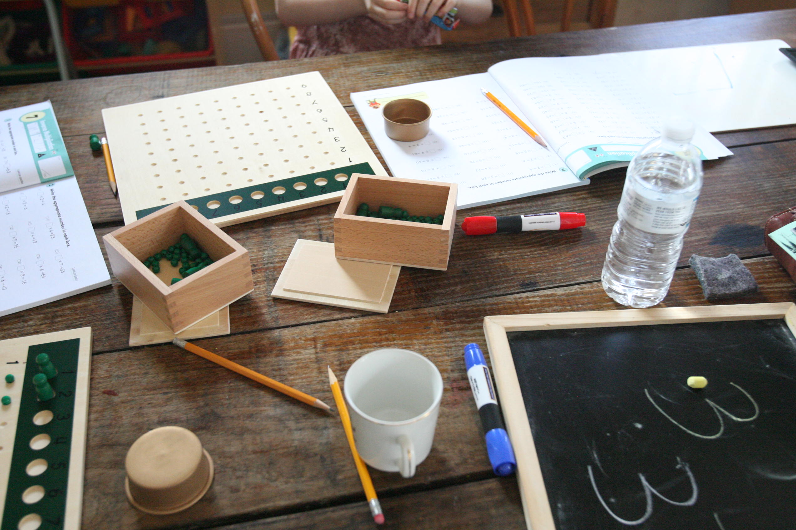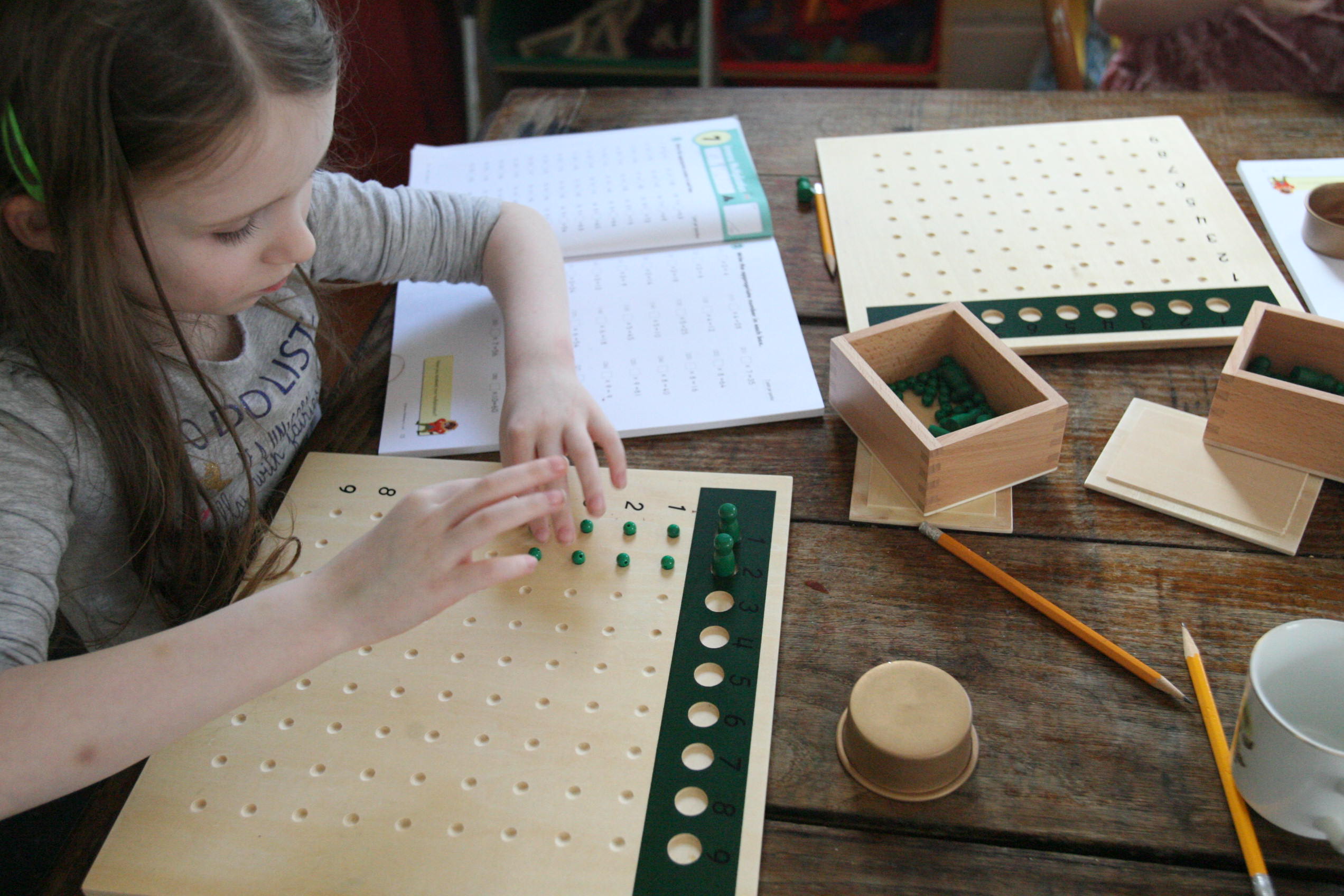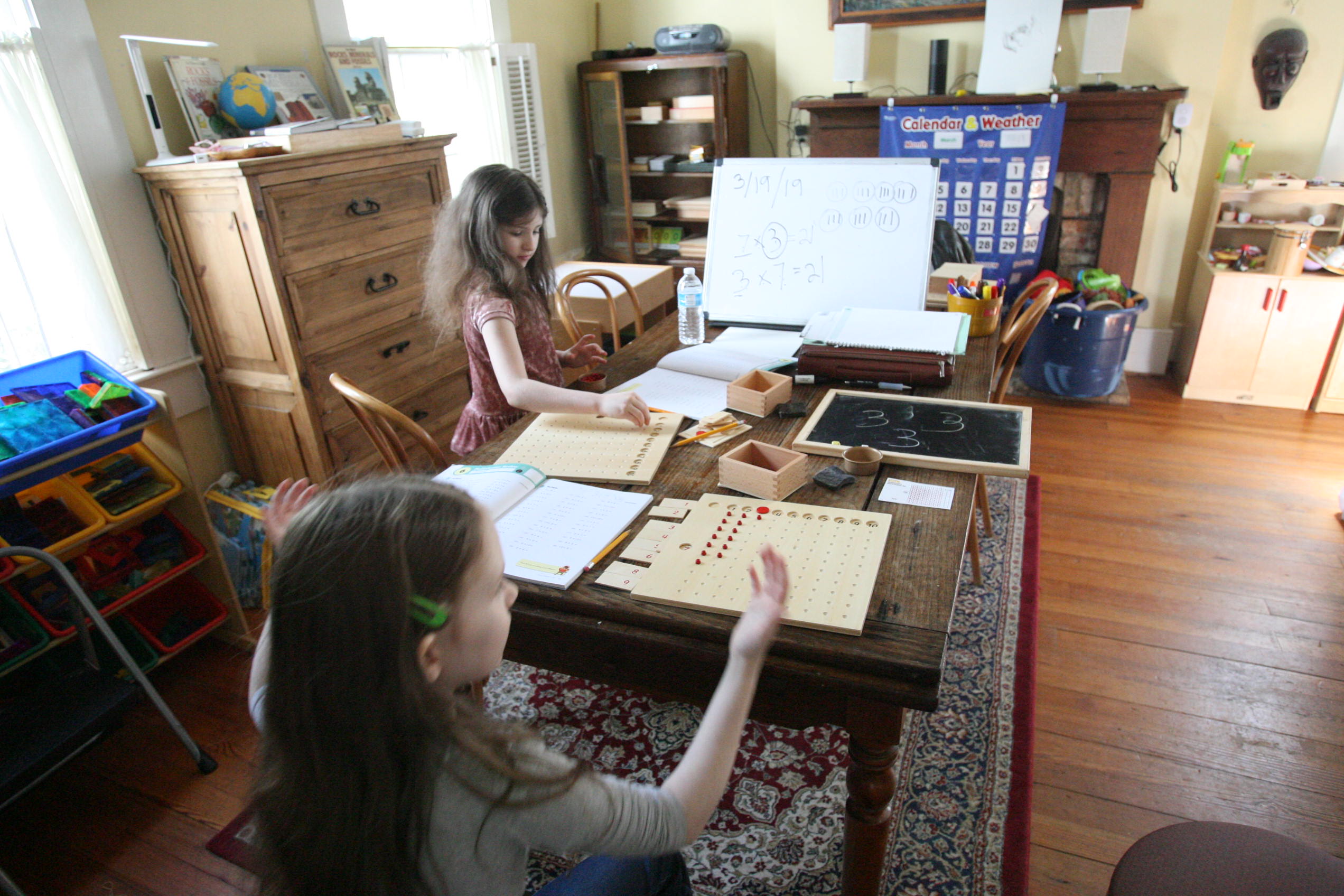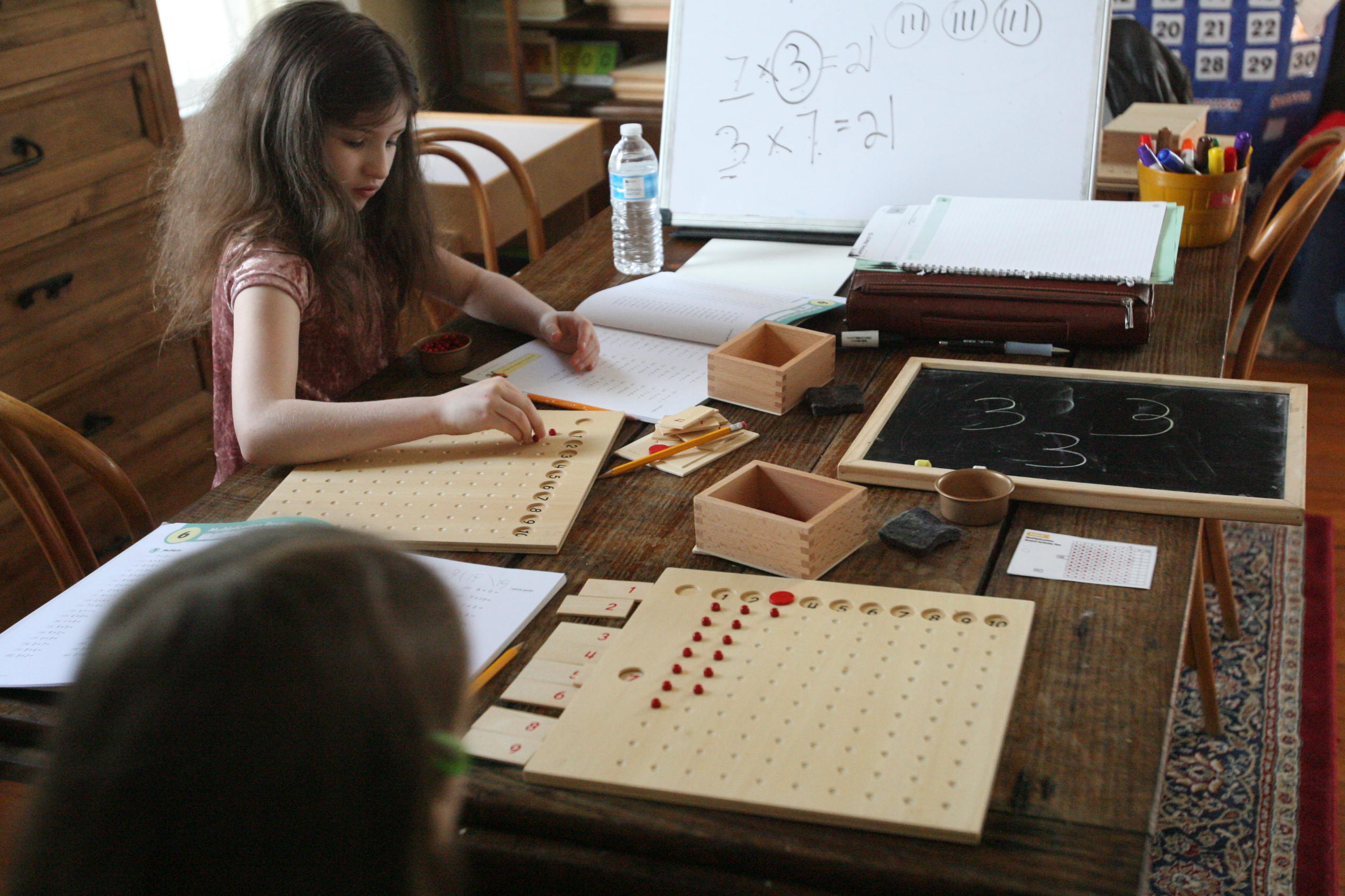 Pictured above are the girls working on multiplication with their multiplication boards. We started out with multiplication before we continued onto division by using reverse multiplication in problem solving missing numbers to multiplication equations. Then we focused on division with the division boards.