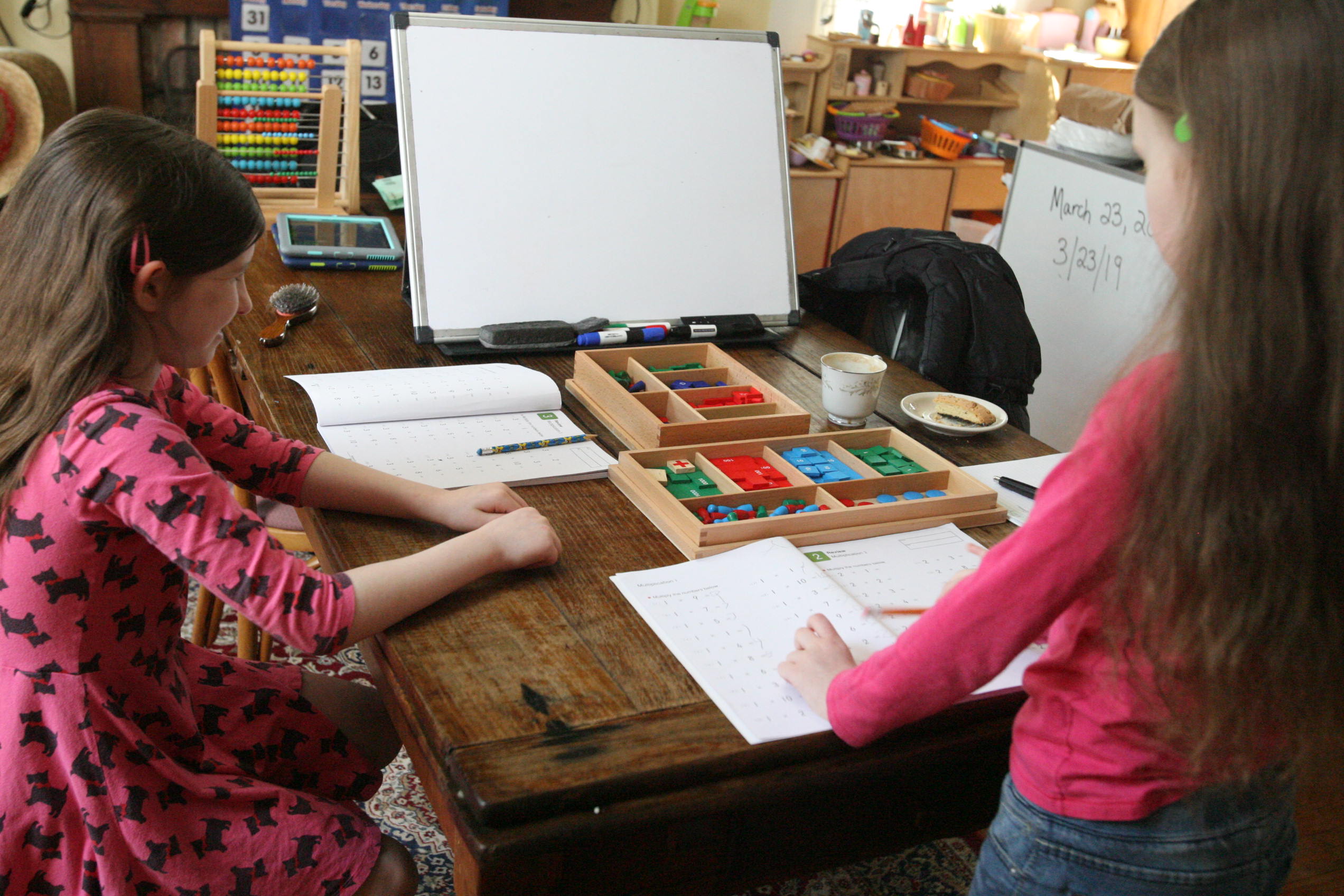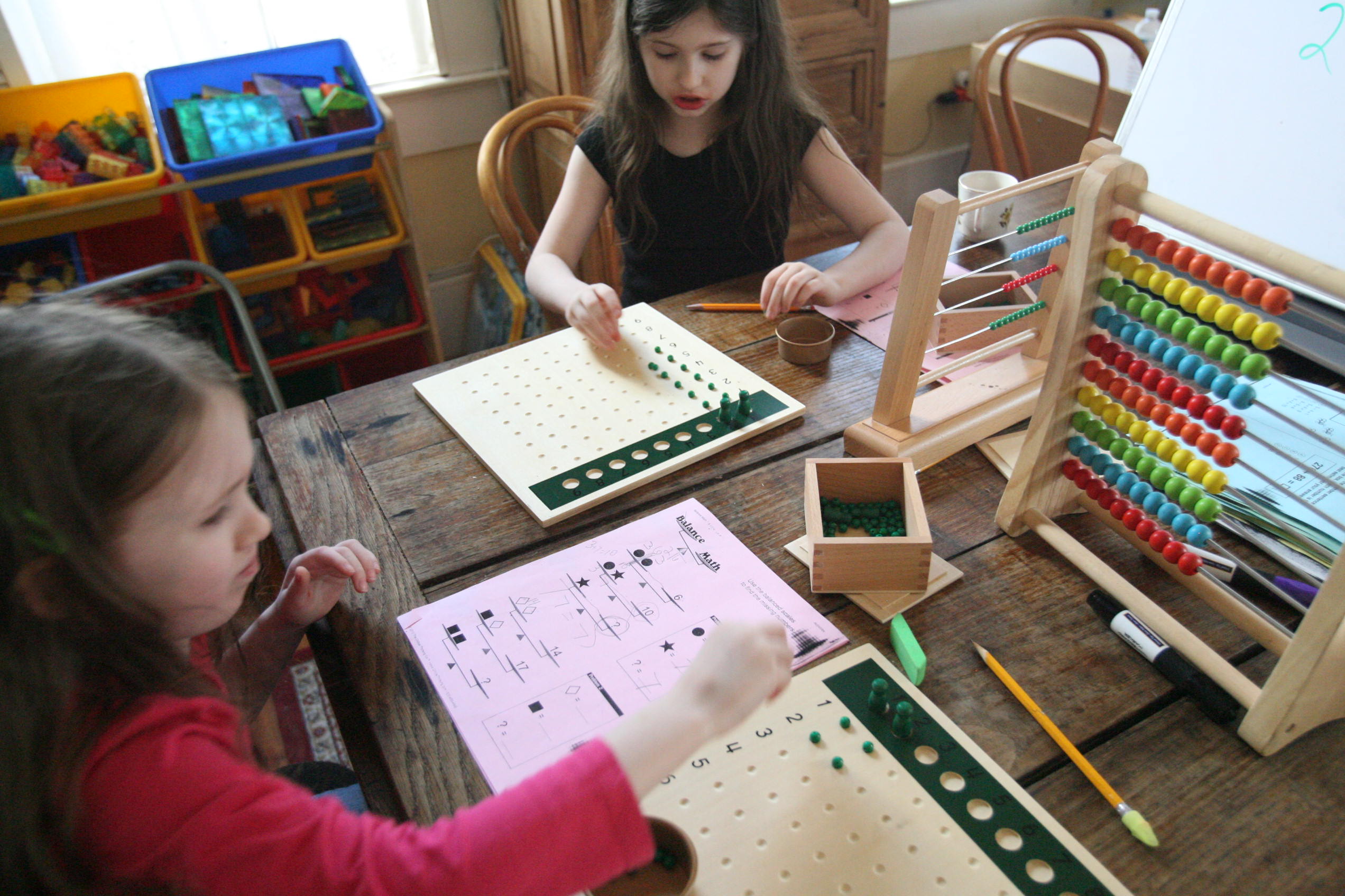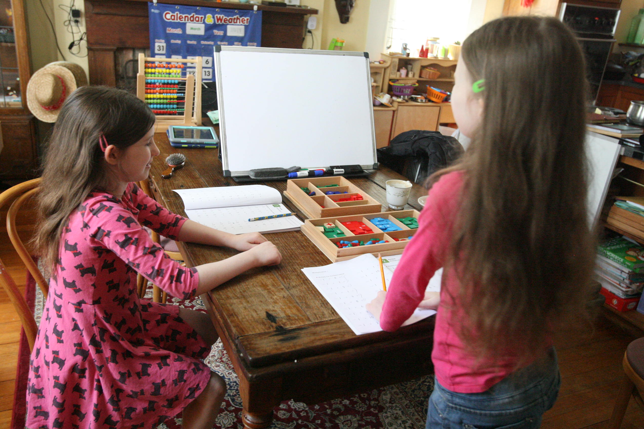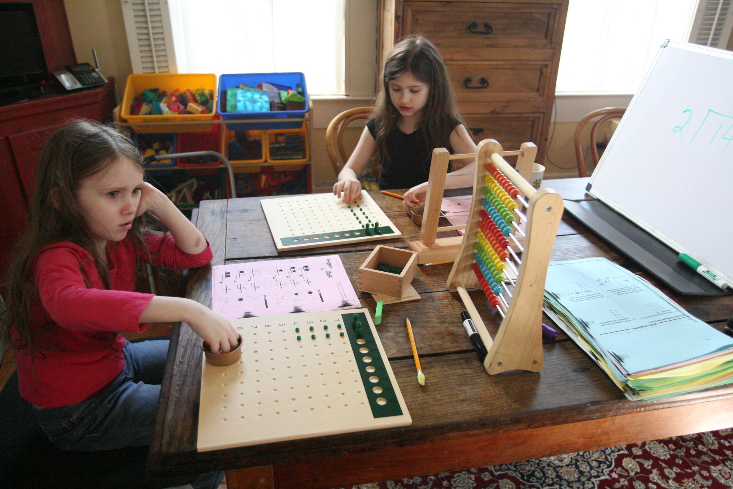 Above and below the girls work on the division board with simple division problems.