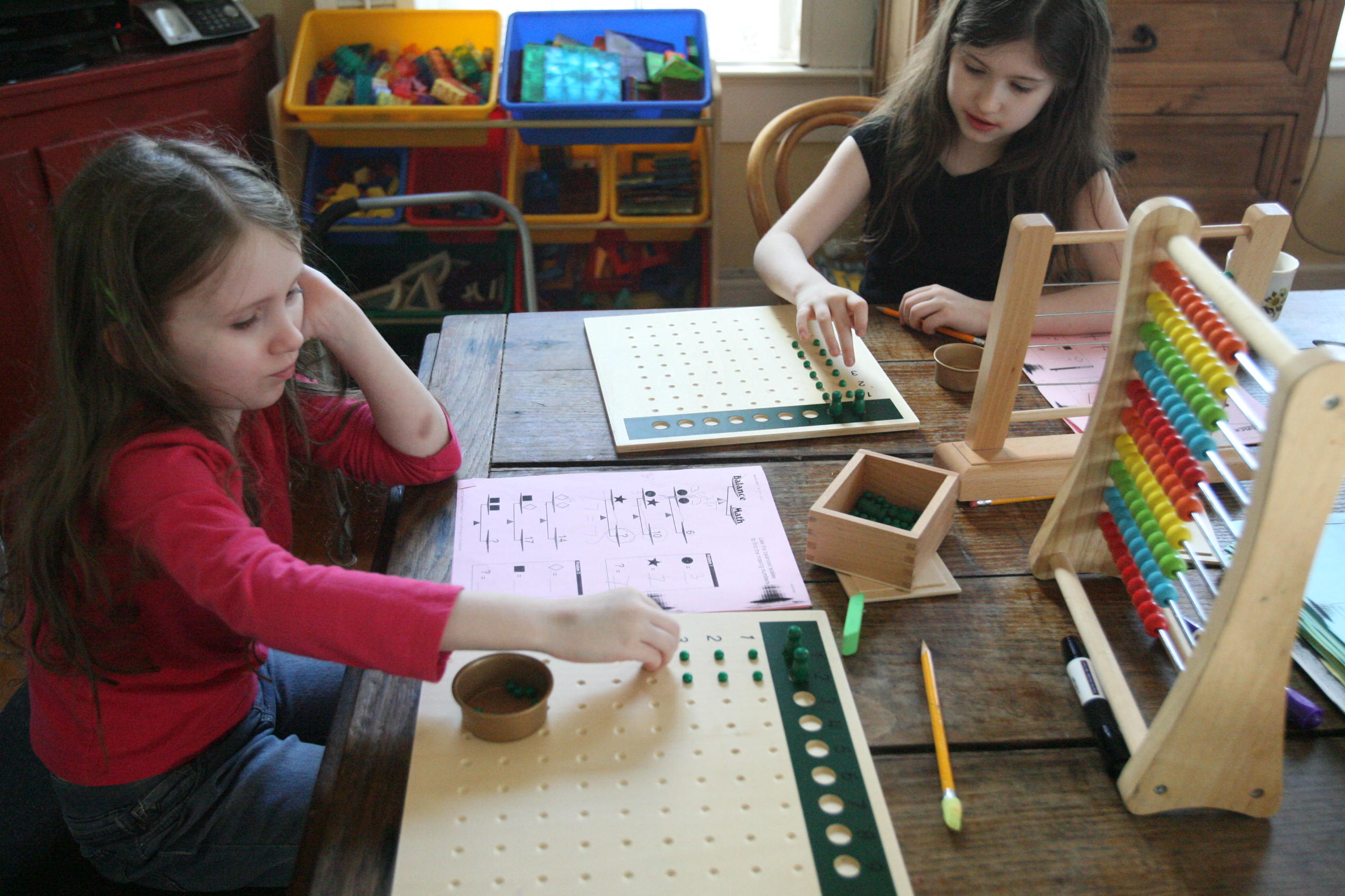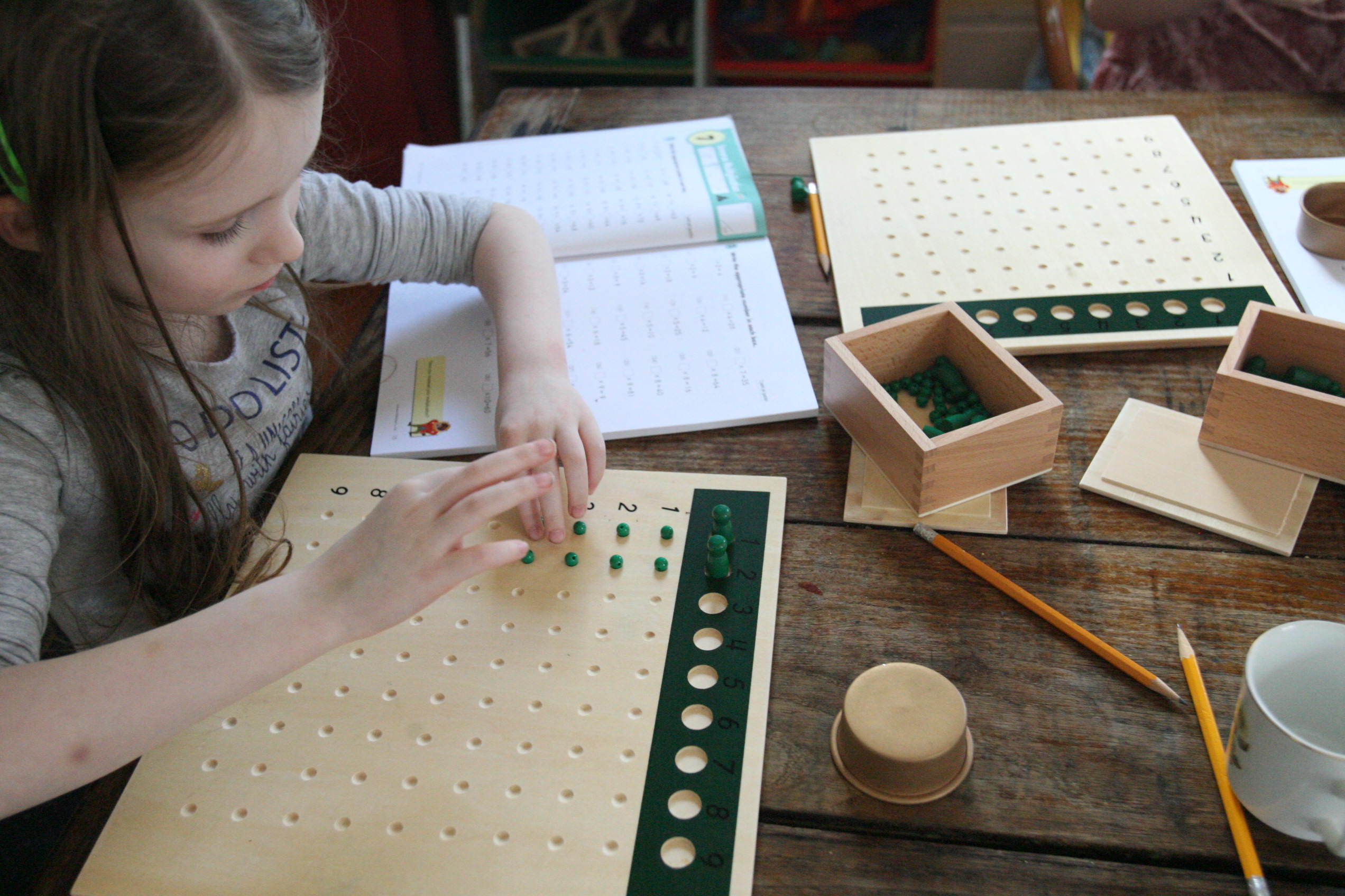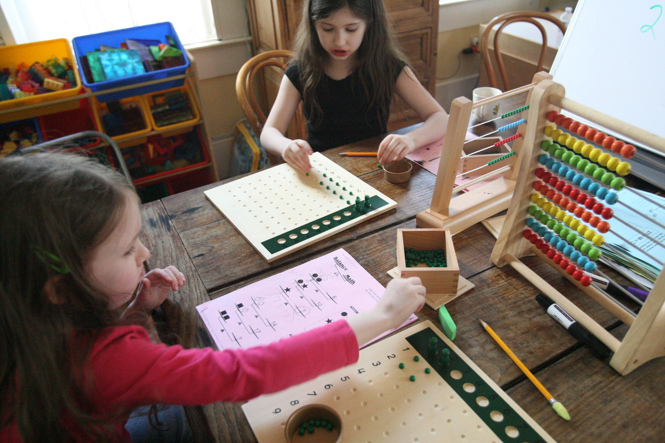 Above and below the girls work on the division board with simple division problems.