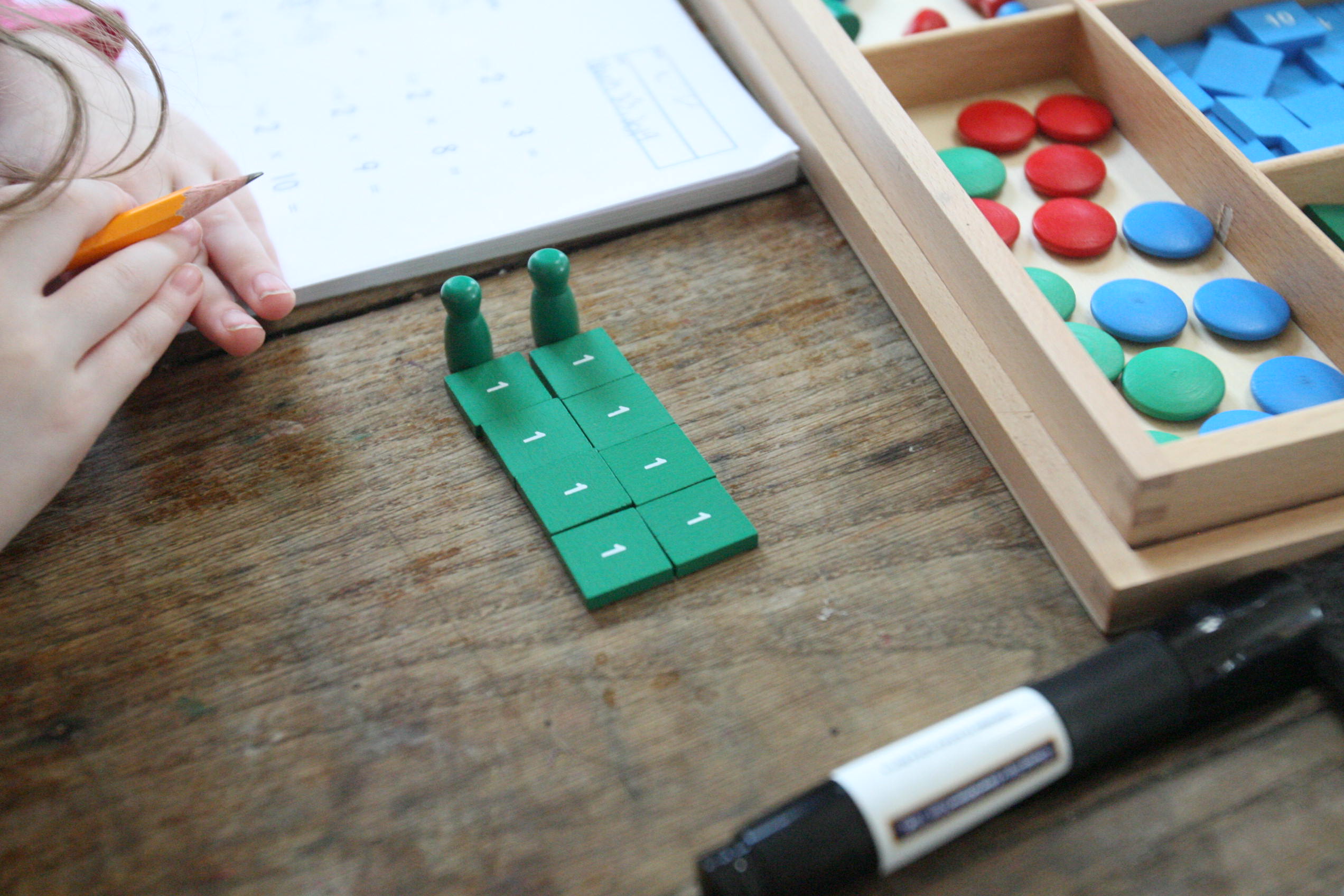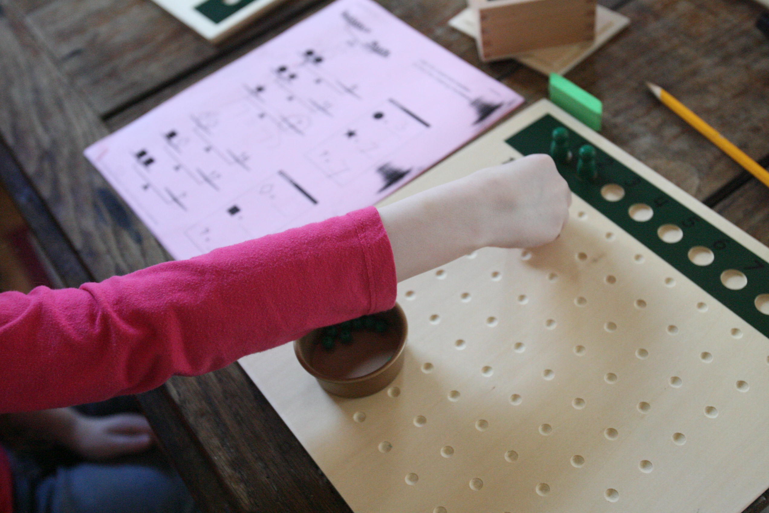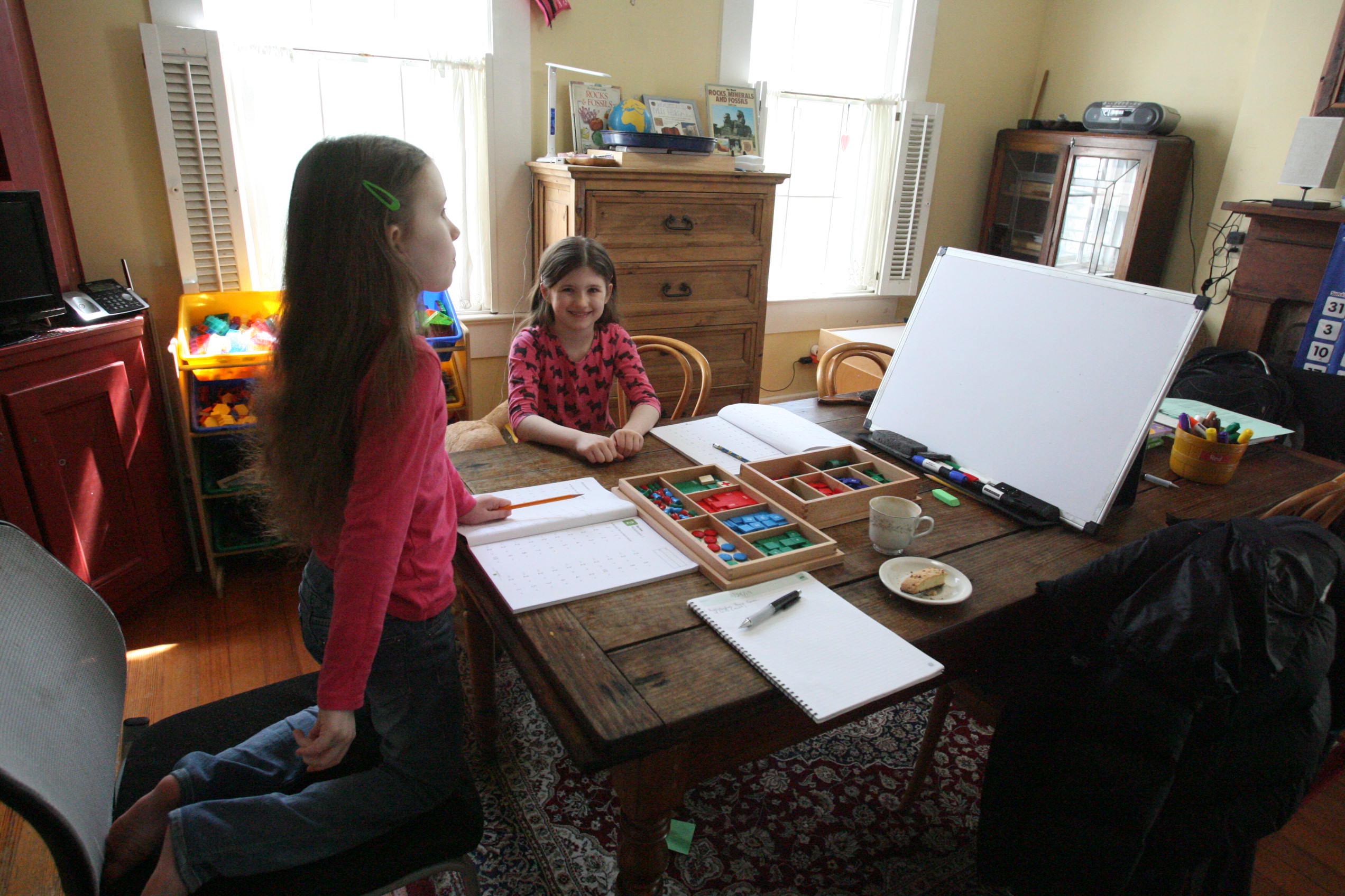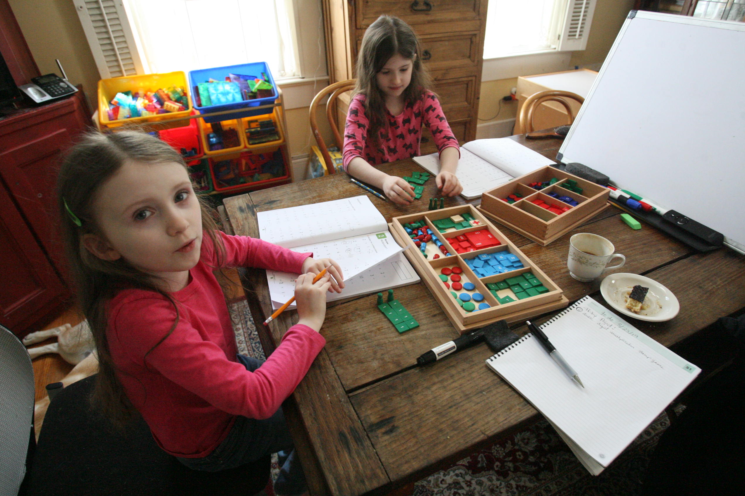 Above and below the girls work on the division board with simple division problems.