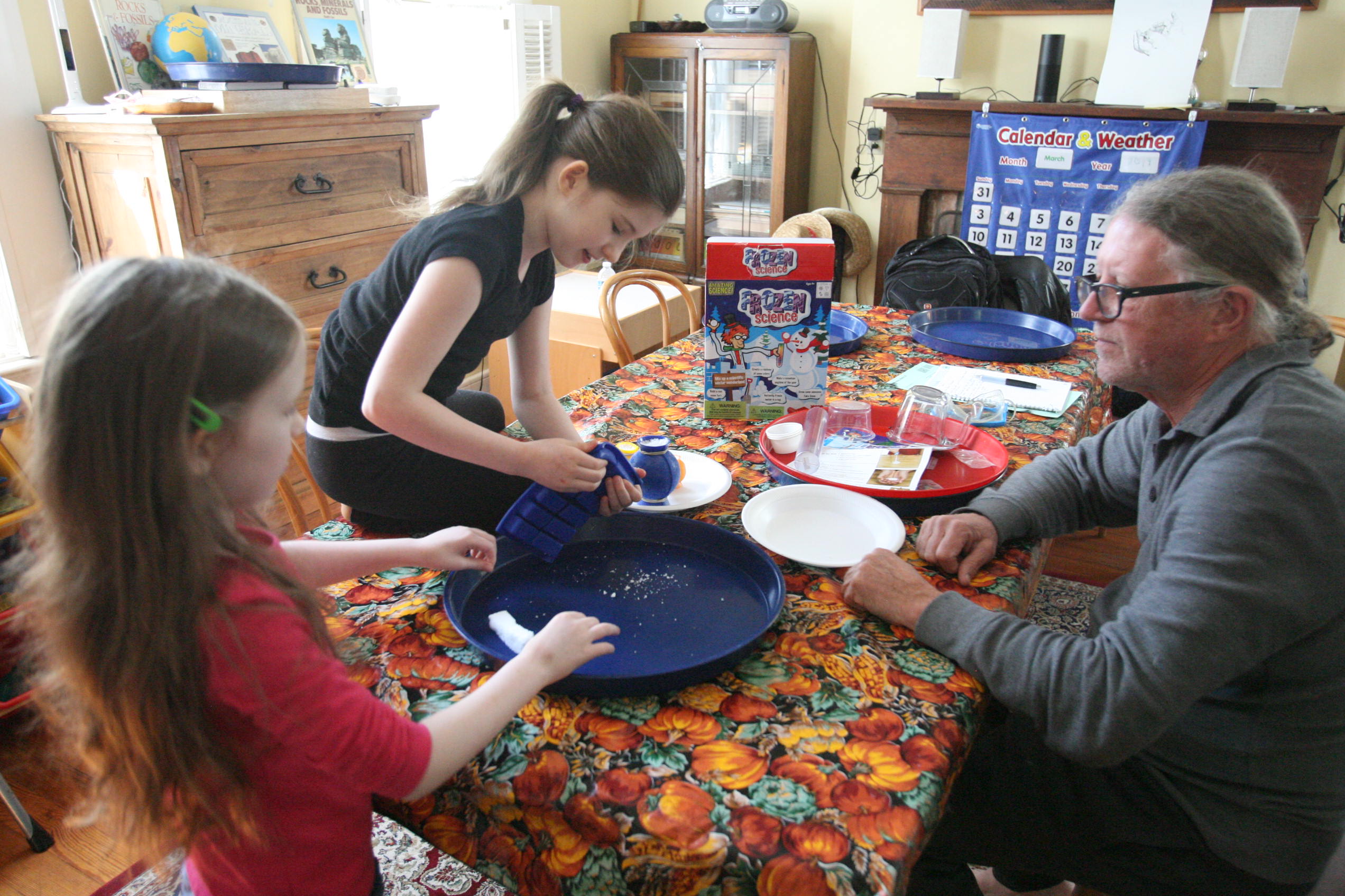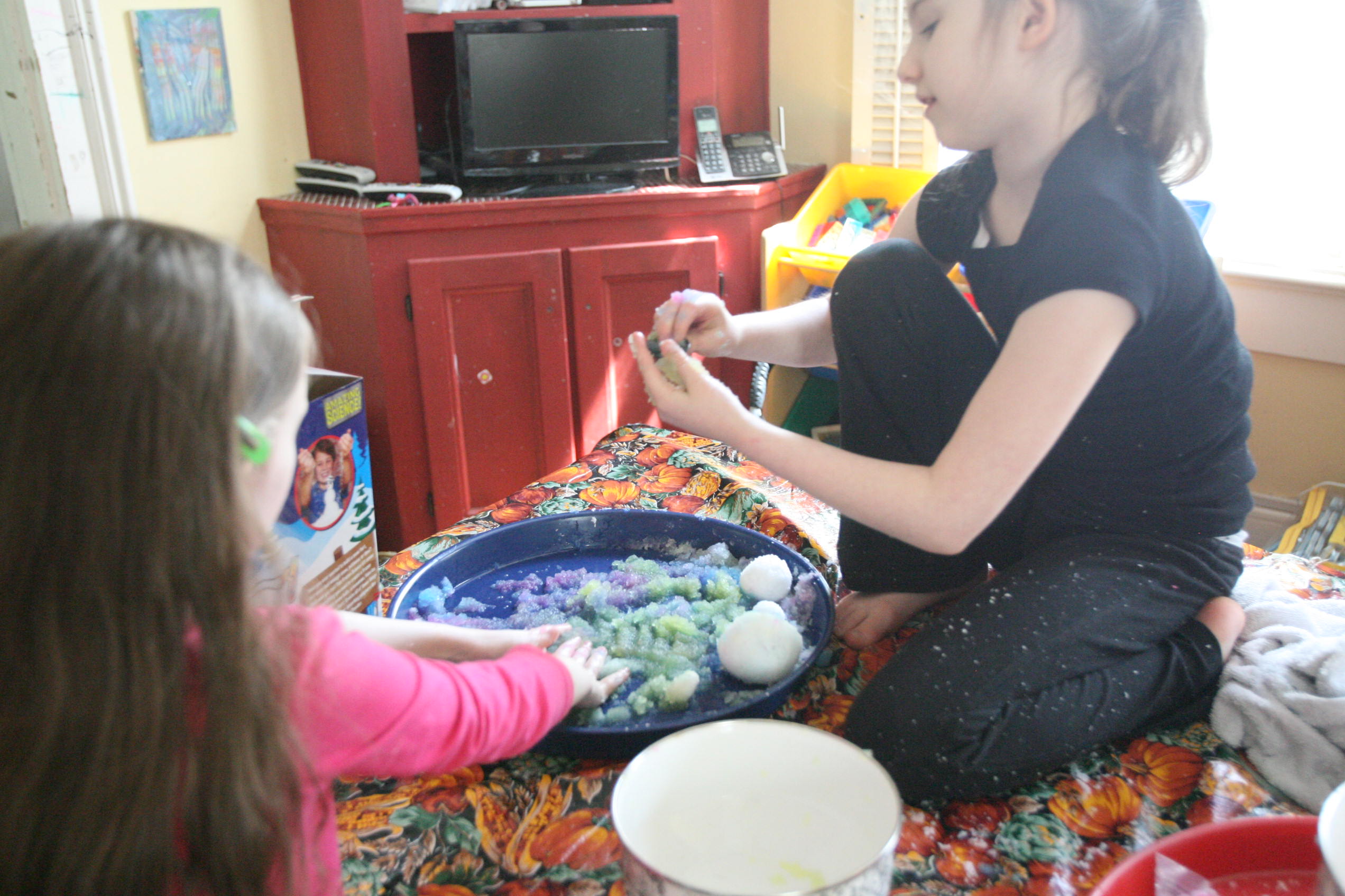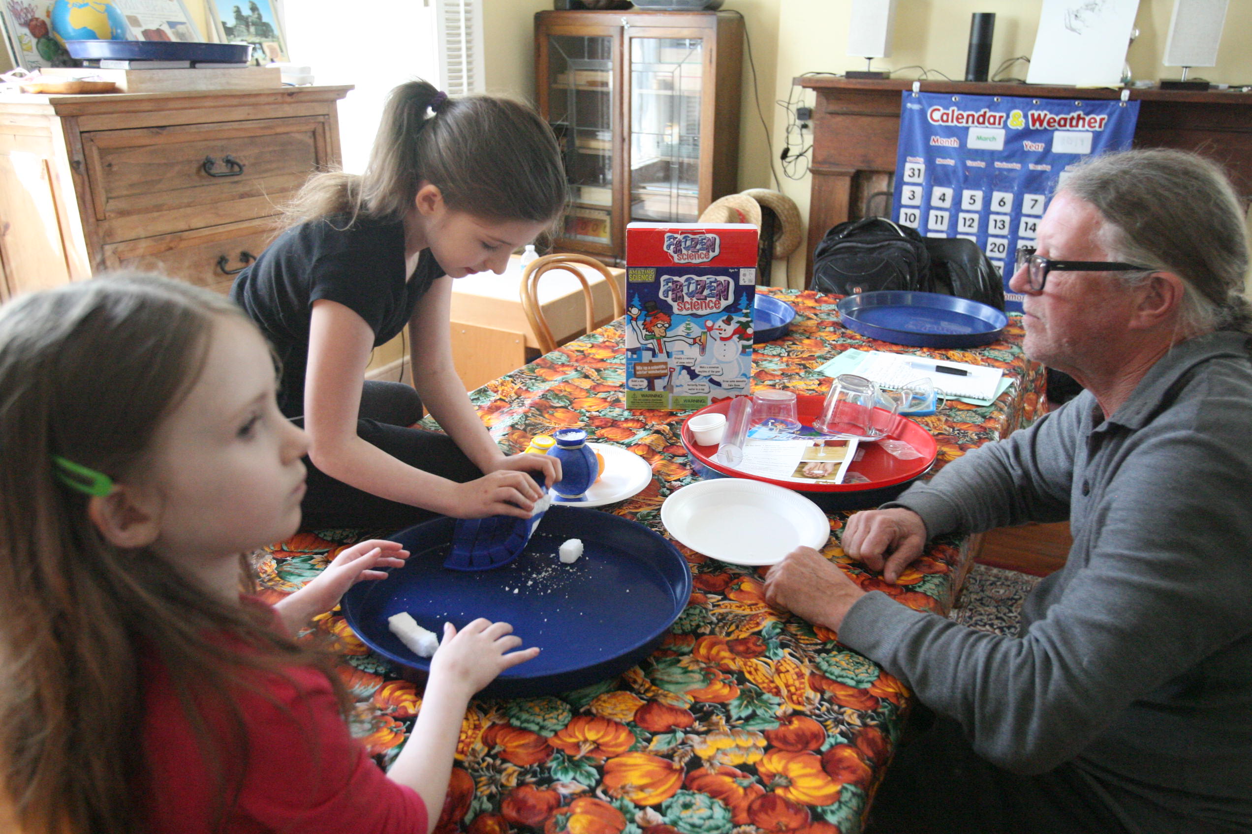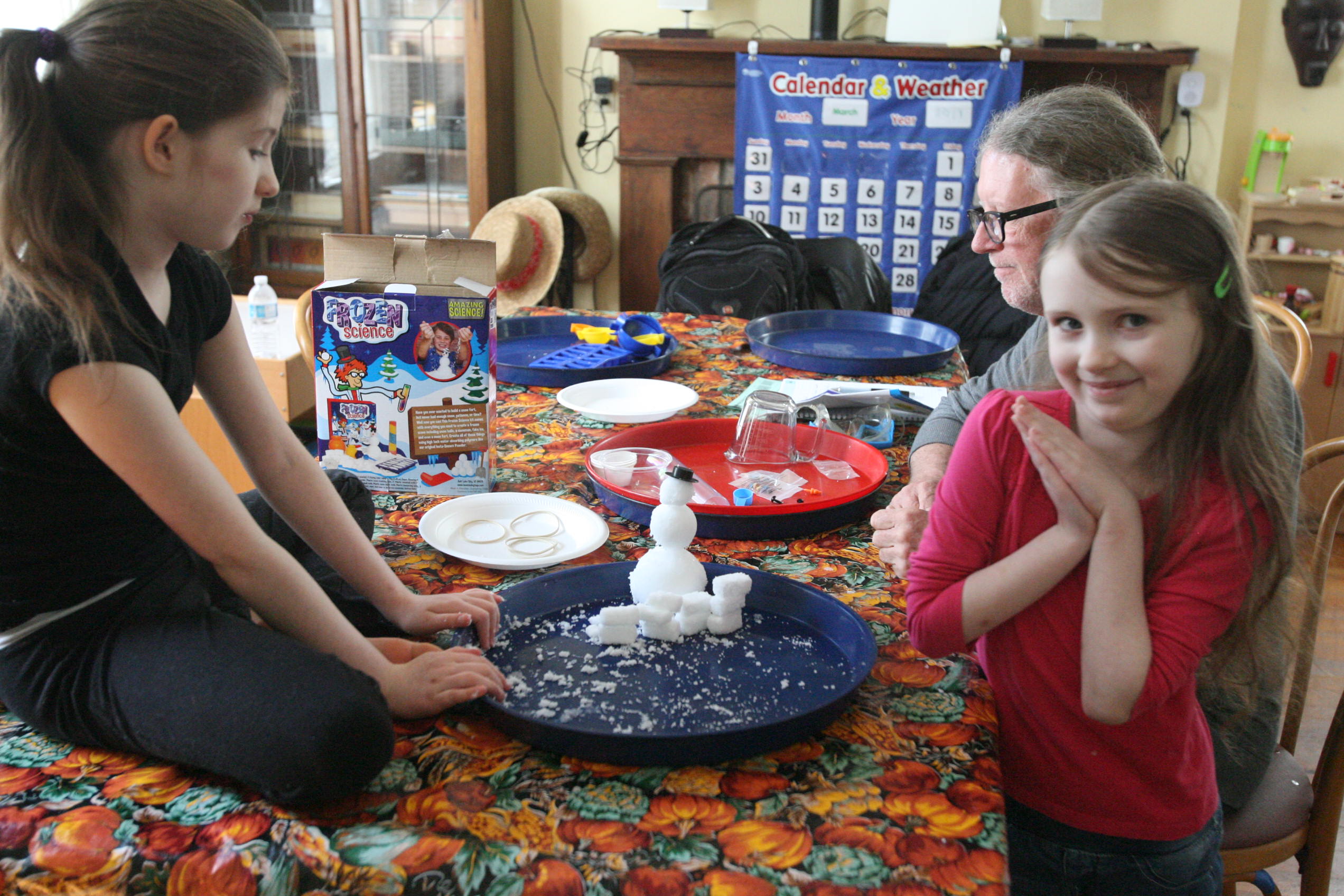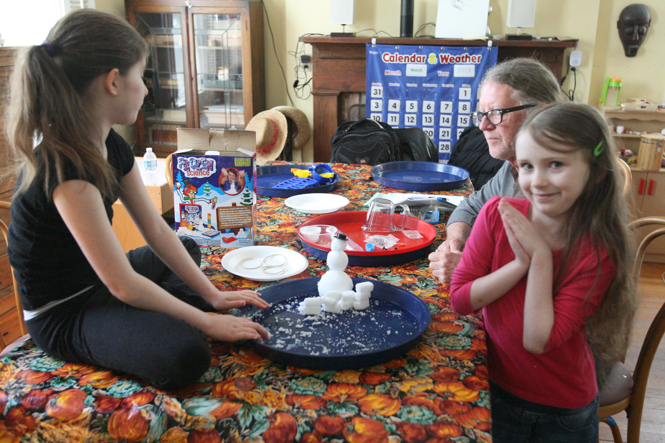 Dad sits in to help with the snow experiment above which the girls loved. We have been talking a lot about matter in science and how matter has different forms and can change different forms. So we did a few things in this experiment in that respect. We changed our dry matter powder into a wet substance that grew right before their eyes. We froze some of the product and made a mini snowman out of it. In another experiment the girls learned and explored more about osmosis by adding color to the snow and placing it into a tube to see what the result would be with time (as the colors bled into eachother to create a rainbow effect). We are learning more about this idea by placing dried moss on a plate and adding water and watching the moss soak up that water and turn green the following day. We are doing the same with some tree moss and I’m still looking for a bit of resurrection fern to show them the magic of that plant too.