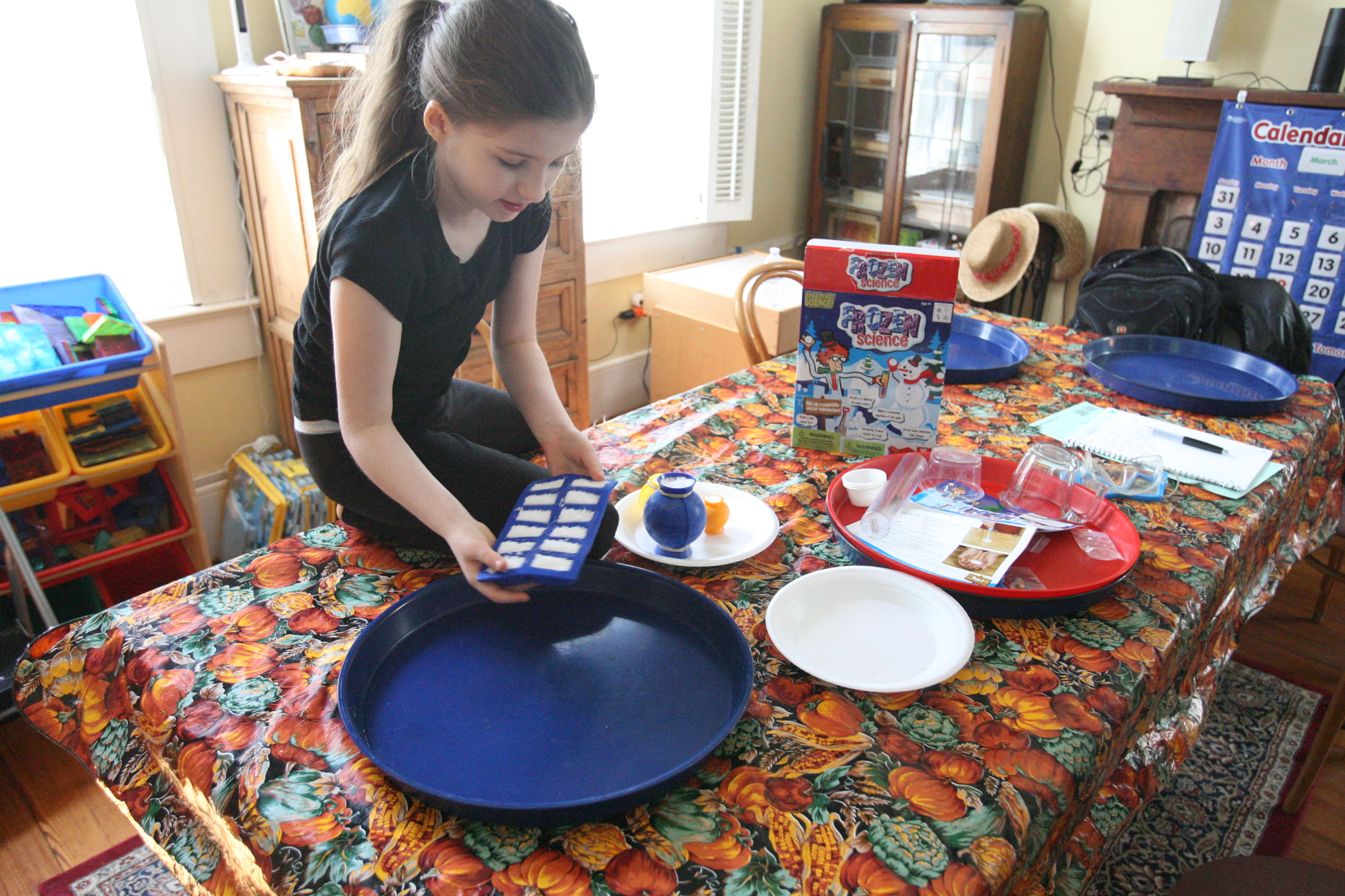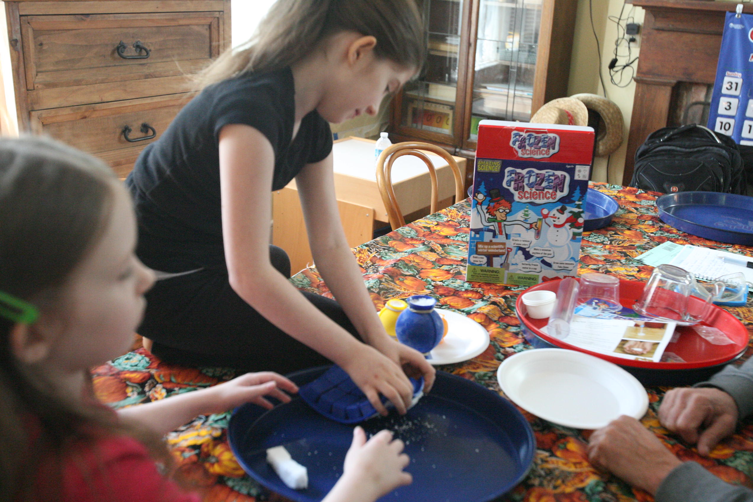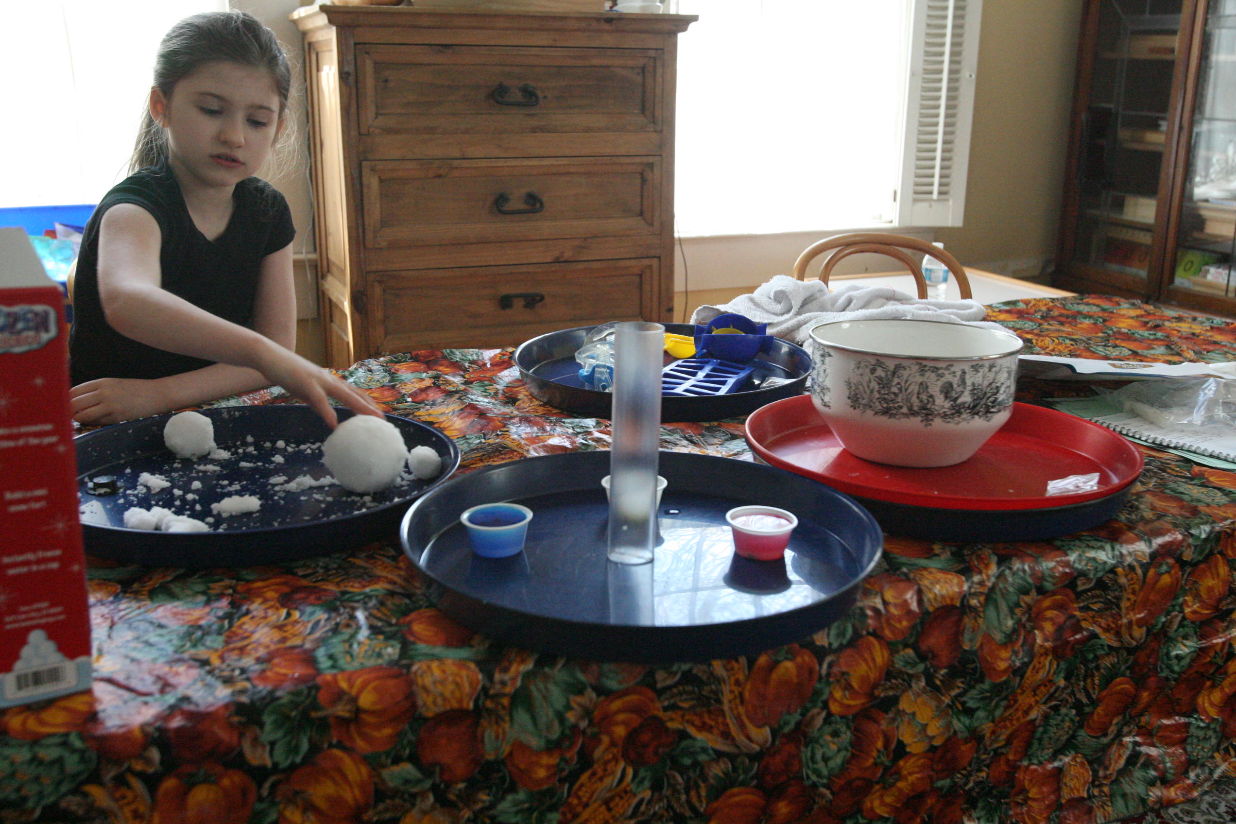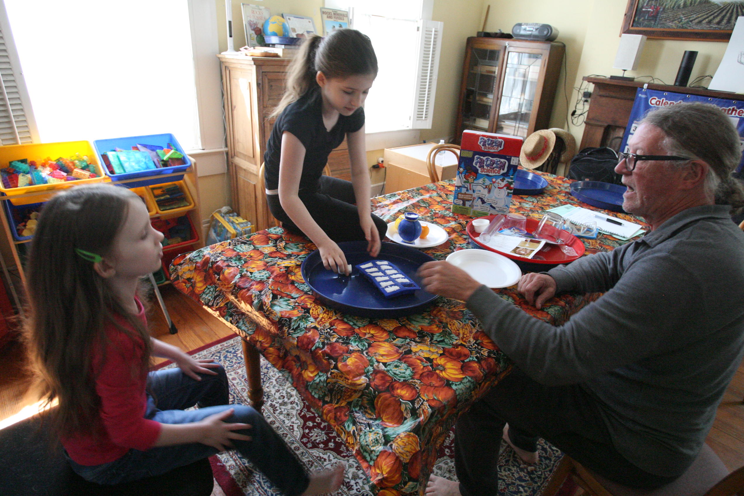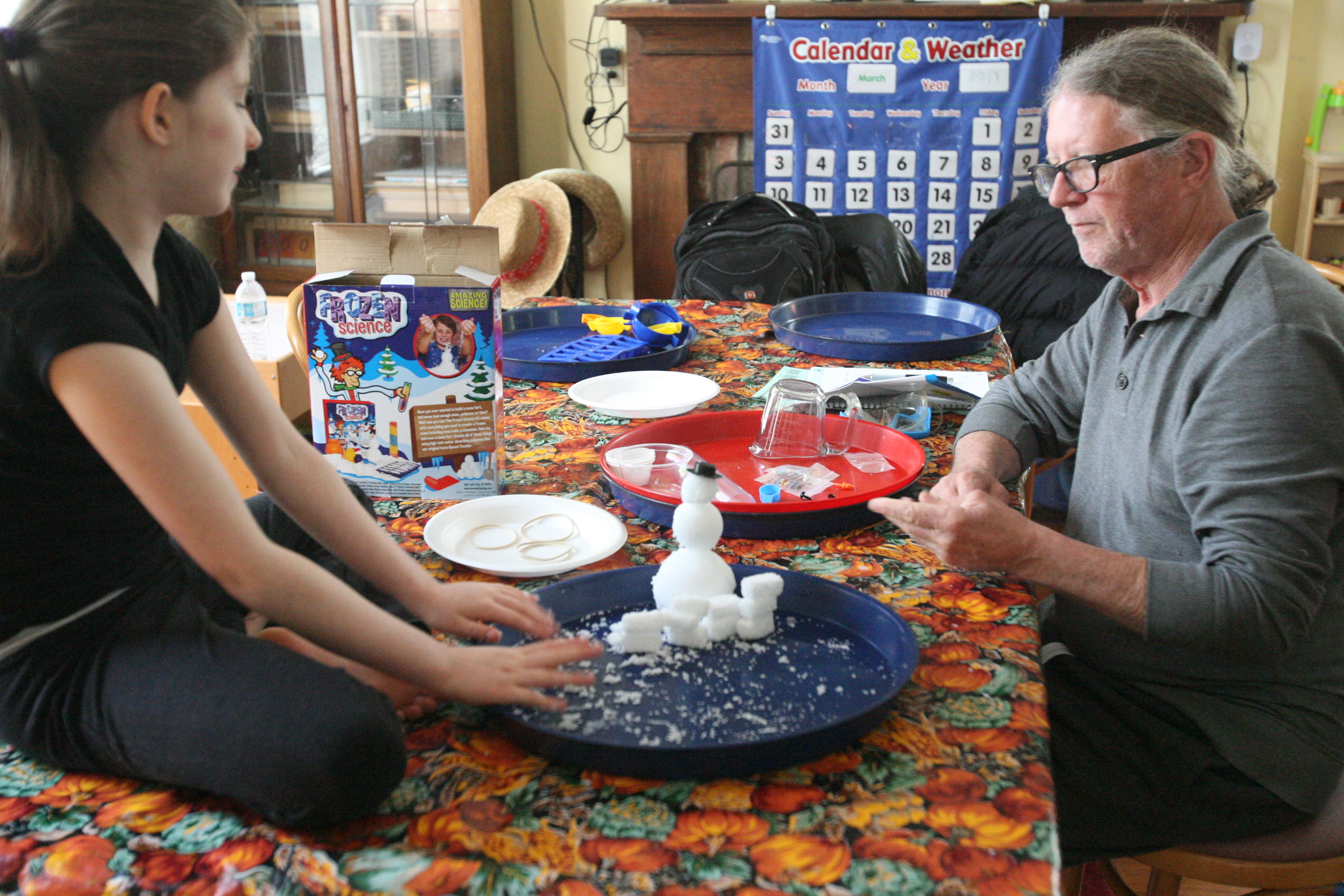 Dad sits in to help with the snow experiment above which the girls loved. We have been talking a lot about matter in science and how matter has different forms and can change different forms. So we did a few things in this experiment in that respect. We changed our dry matter powder into a wet substance that grew right before their eyes. We froze some of the product and made a mini snowman out of it. In another experiment the girls learned and explored more about osmosis by adding color to the snow and placing it into a tube to see what the result would be with time (as the colors bled into eachother to create a rainbow effect). We are learning more about this idea by placing dried moss on a plate and adding water and watching the moss soak up that water and turn green the following day. We are doing the same with some tree moss and I’m still looking for a bit of resurrection fern to show them the magic of that plant too.