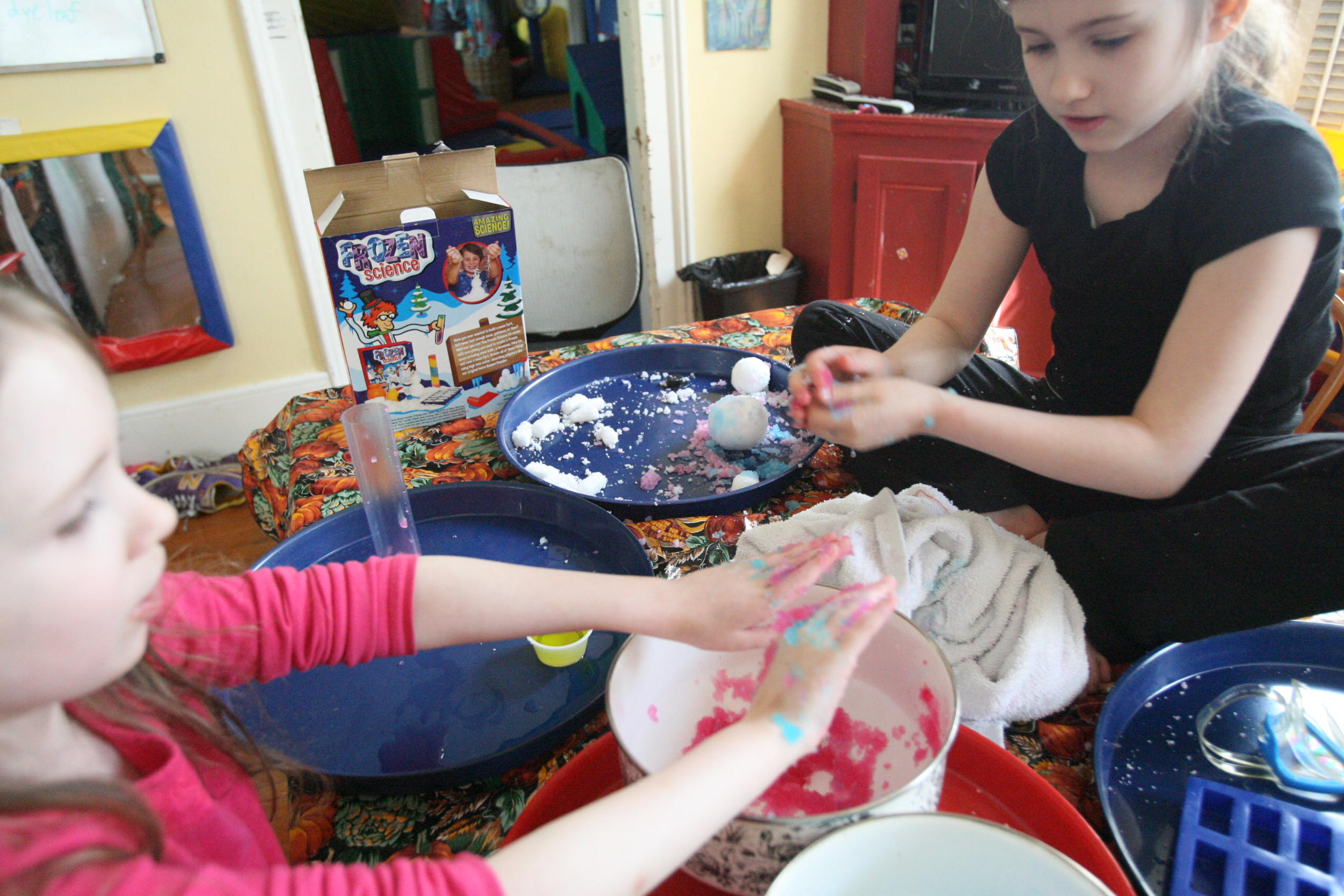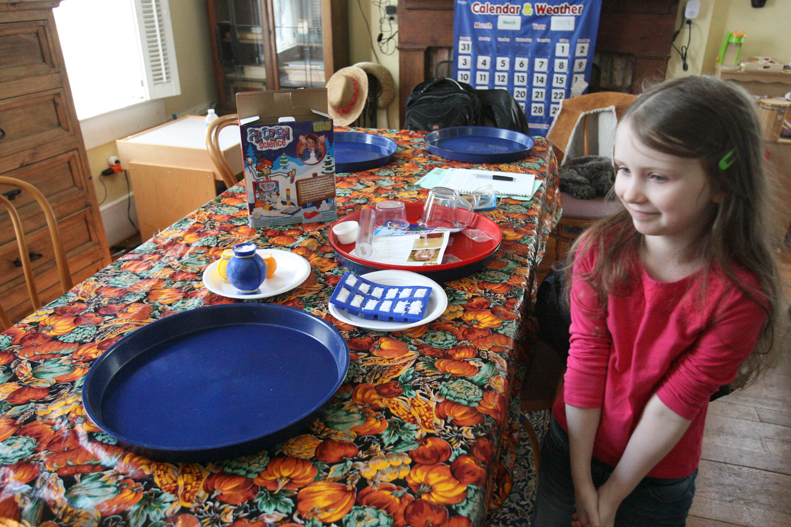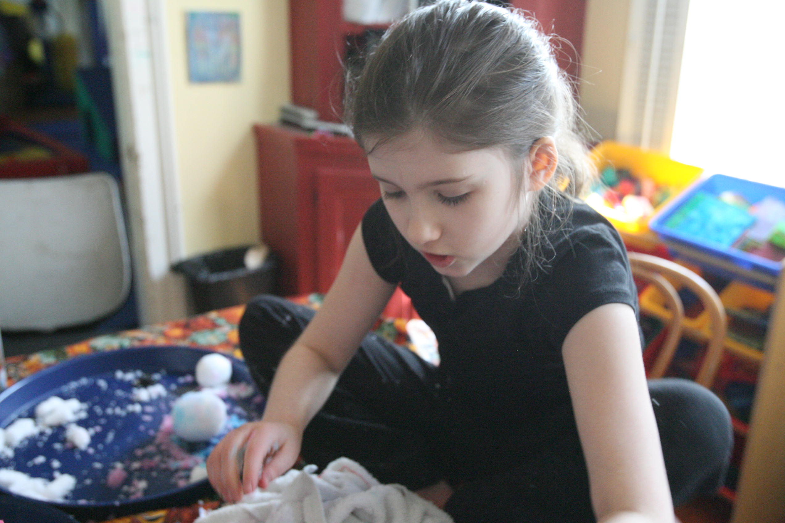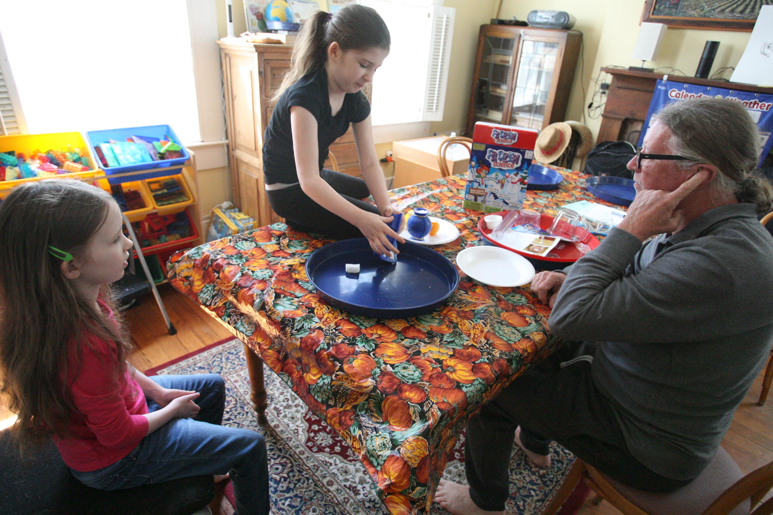 Dad sits in to help with the snow experiment above which the girls loved. We have been talking a lot about matter in science and how matter has different forms and can change different forms. So we did a few things in this experiment in that respect. We changed our dry matter powder into a wet substance that grew right before their eyes. We froze some of the product and made a mini snowman out of it. In another experiment the girls learned and explored more about osmosis by adding color to the snow and placing it into a tube to see what the result would be with time (as the colors bled into eachother to create a rainbow effect). We are learning more about this idea by placing dried moss on a plate and adding water and watching the moss soak up that water and turn green the following day. We are doing the same with some tree moss and I’m still looking for a bit of resurrection fern to show them the magic of that plant too.
