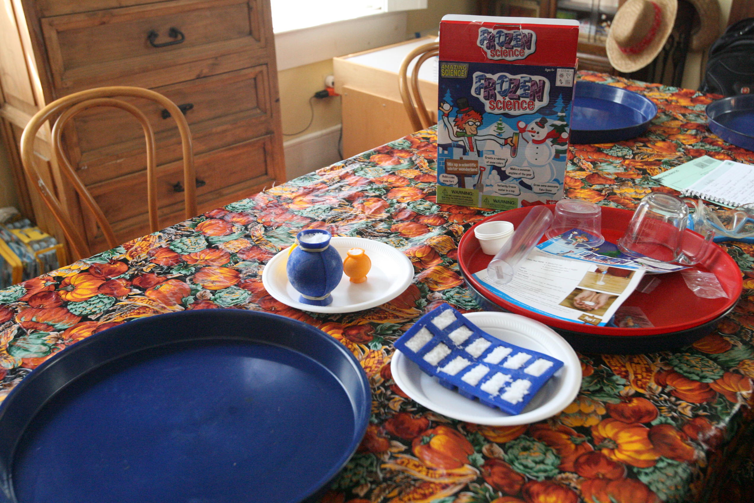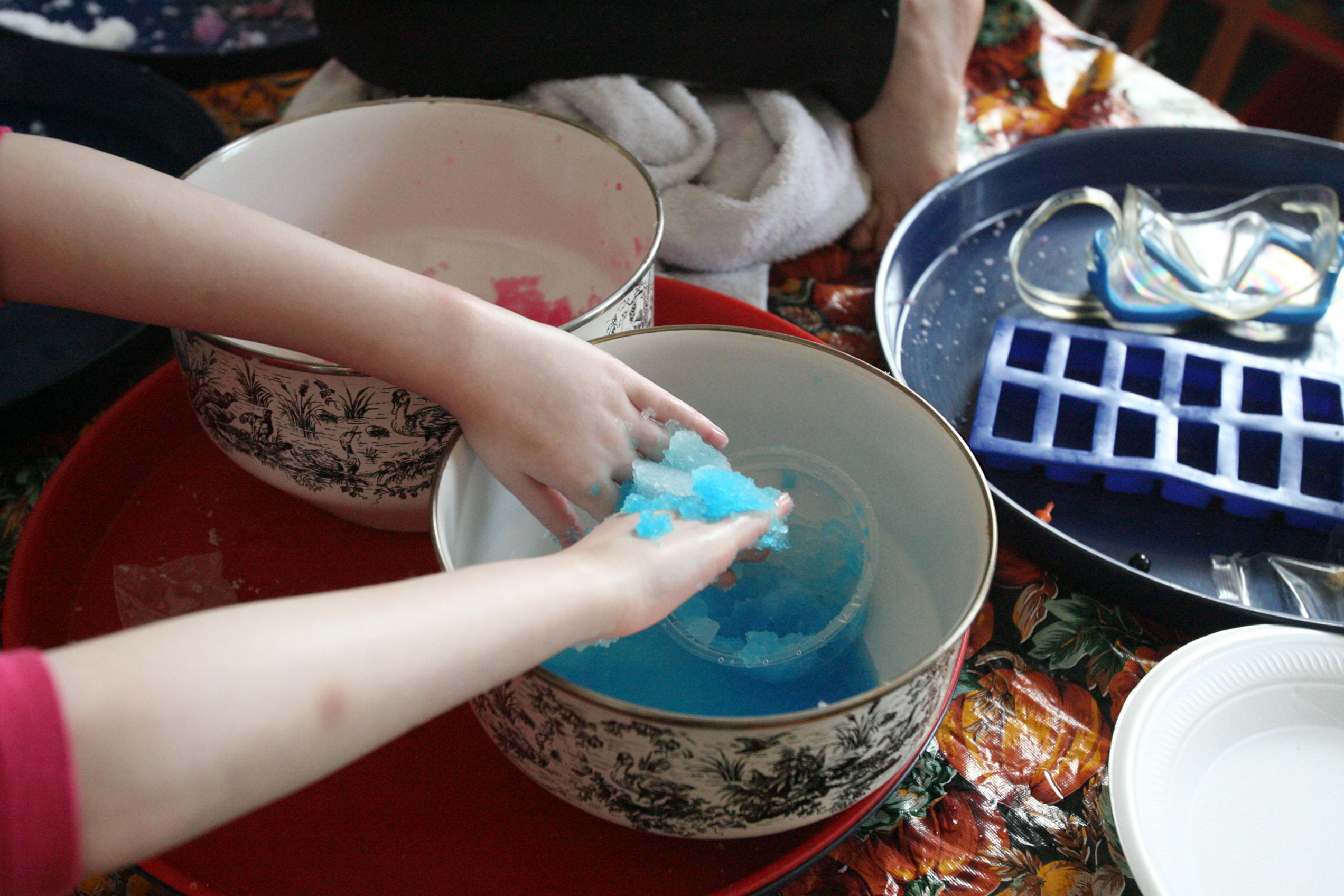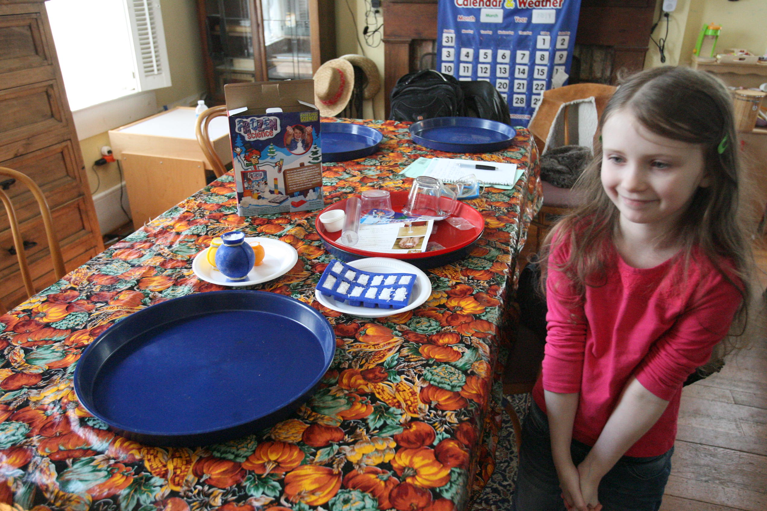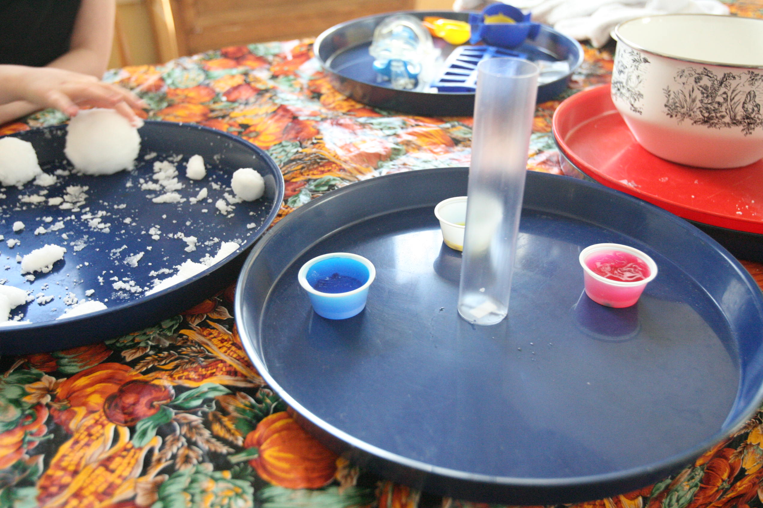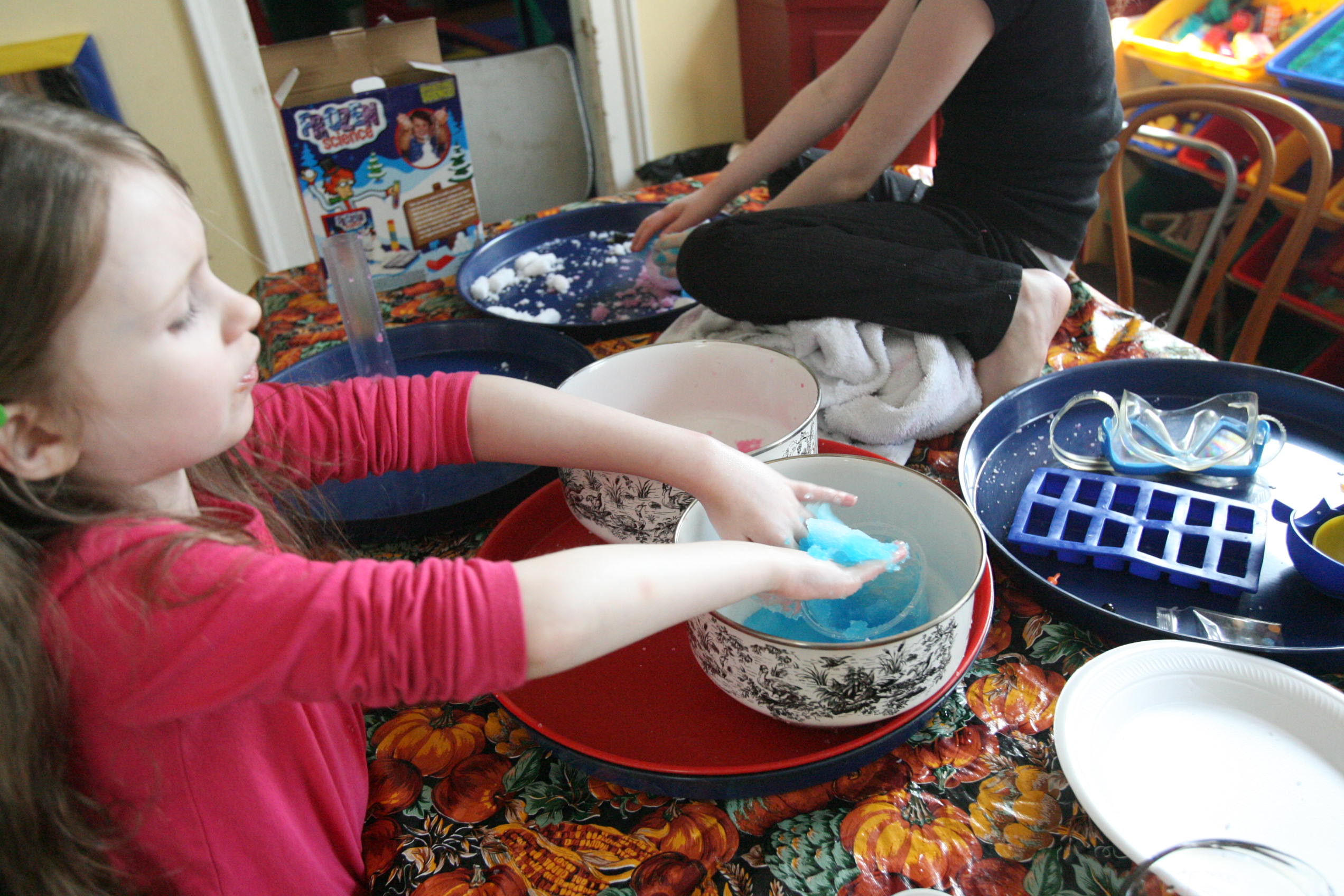 Dad sits in to help with the snow experiment above which the girls loved. We have been talking a lot about matter in science and how matter has different forms and can change different forms. So we did a few things in this experiment in that respect. We changed our dry matter powder into a wet substance that grew right before their eyes. We froze some of the product and made a mini snowman out of it. In another experiment the girls learned and explored more about osmosis by adding color to the snow and placing it into a tube to see what the result would be with time (as the colors bled into eachother to create a rainbow effect). We are learning more about this idea by placing dried moss on a plate and adding water and watching the moss soak up that water and turn green the following day. We are doing the same with some tree moss and I’m still looking for a bit of resurrection fern to show them the magic of that plant too.