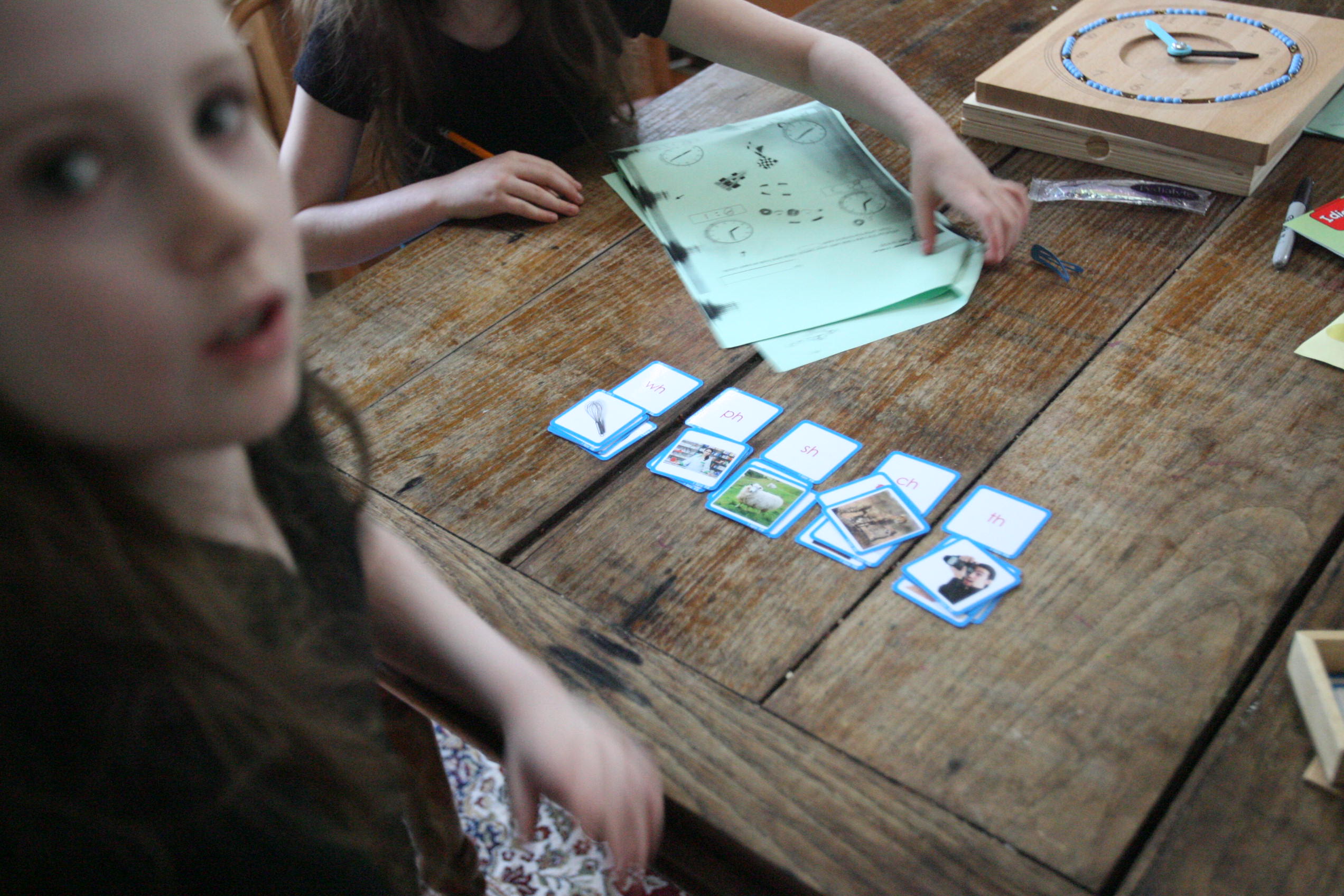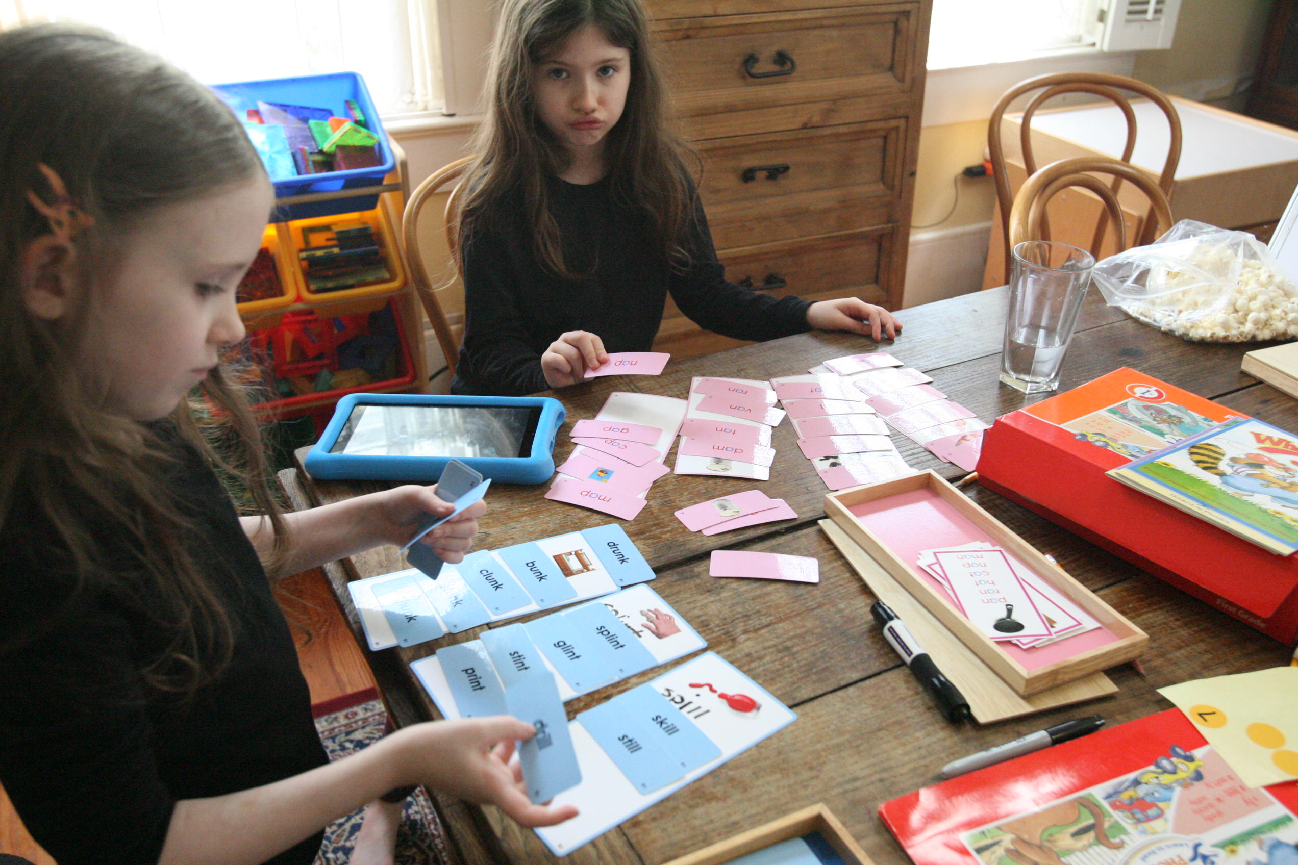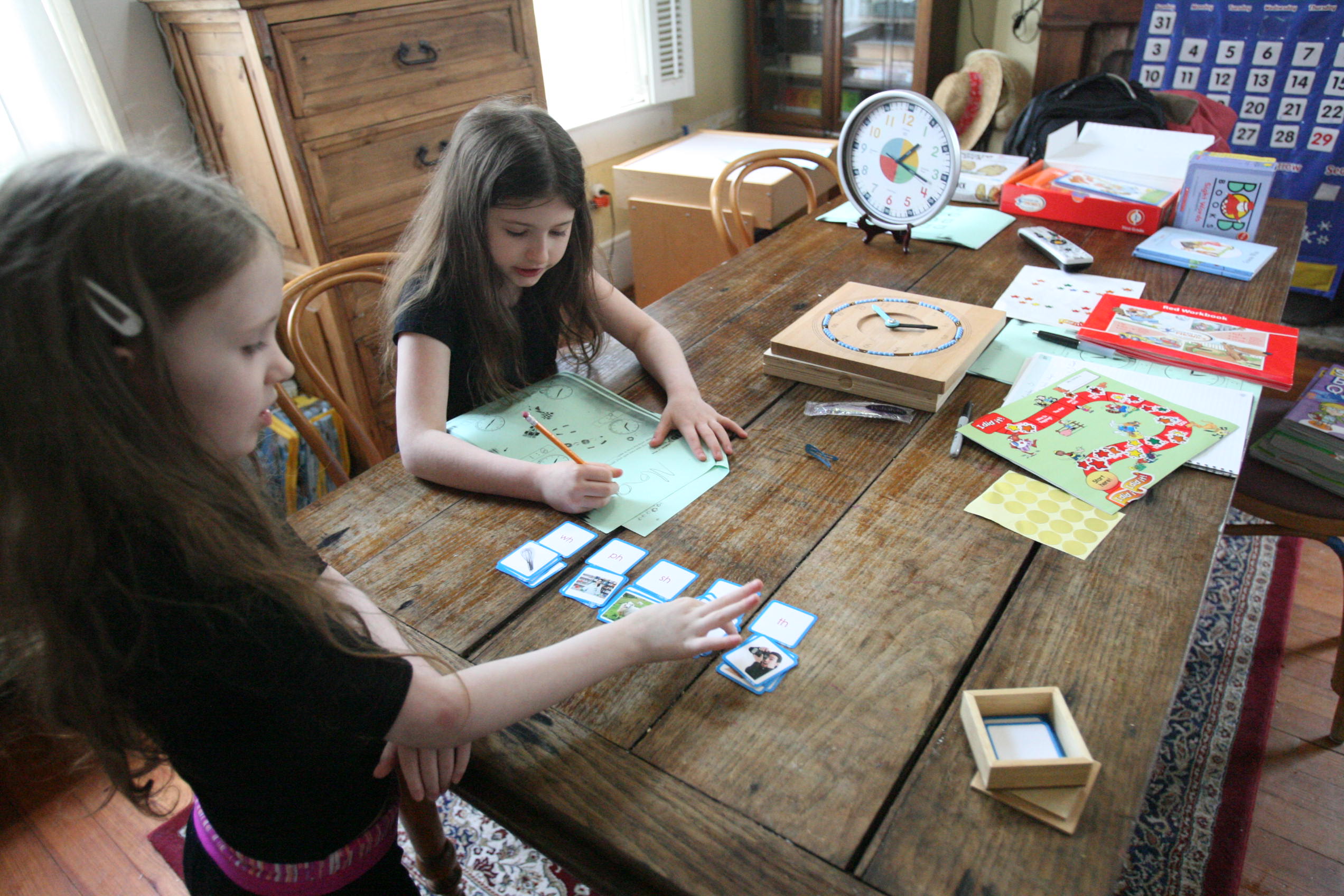 Above is a mix of Hooked on Phonics work, time sheets, Montessori language materials and Bob Books for reading.