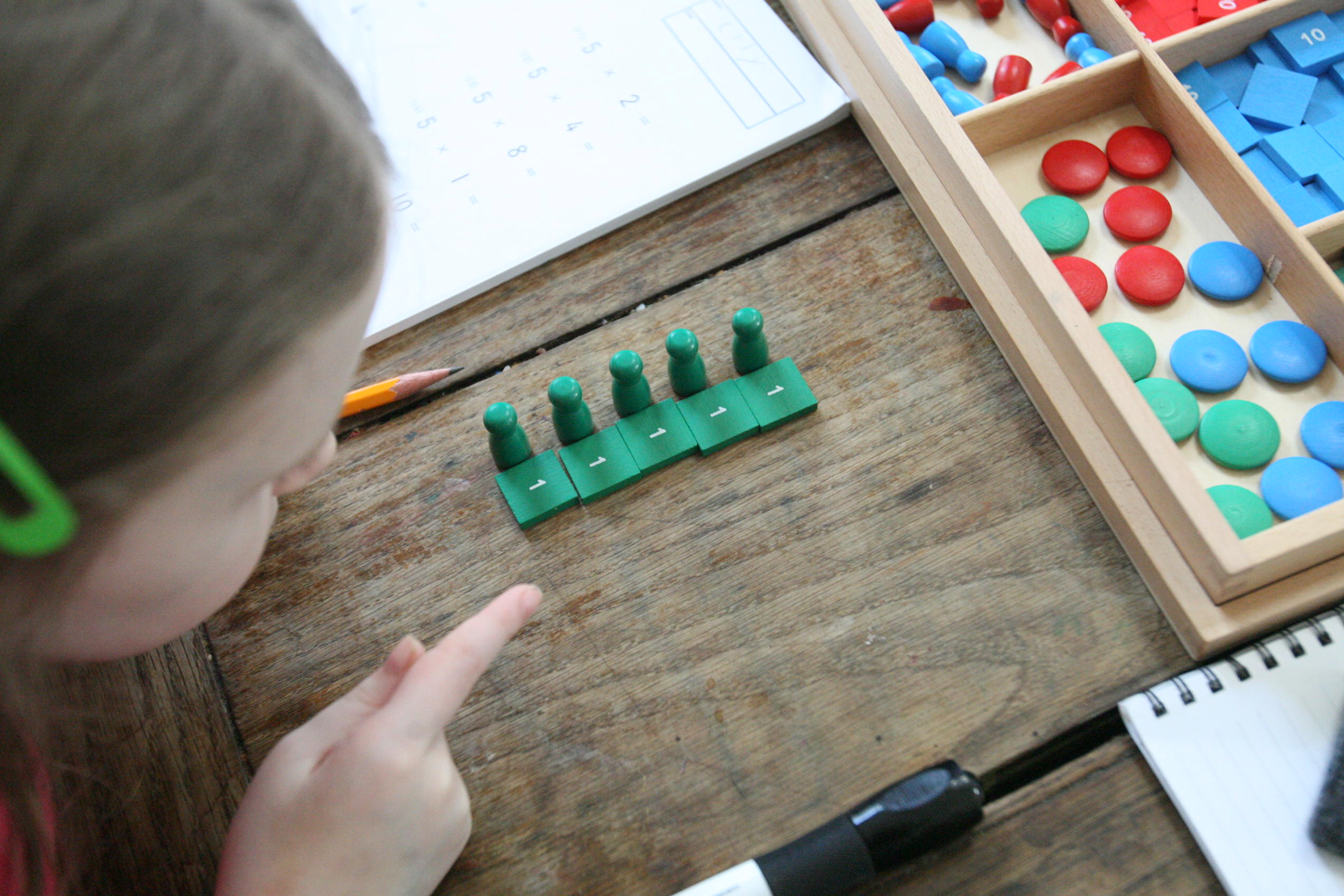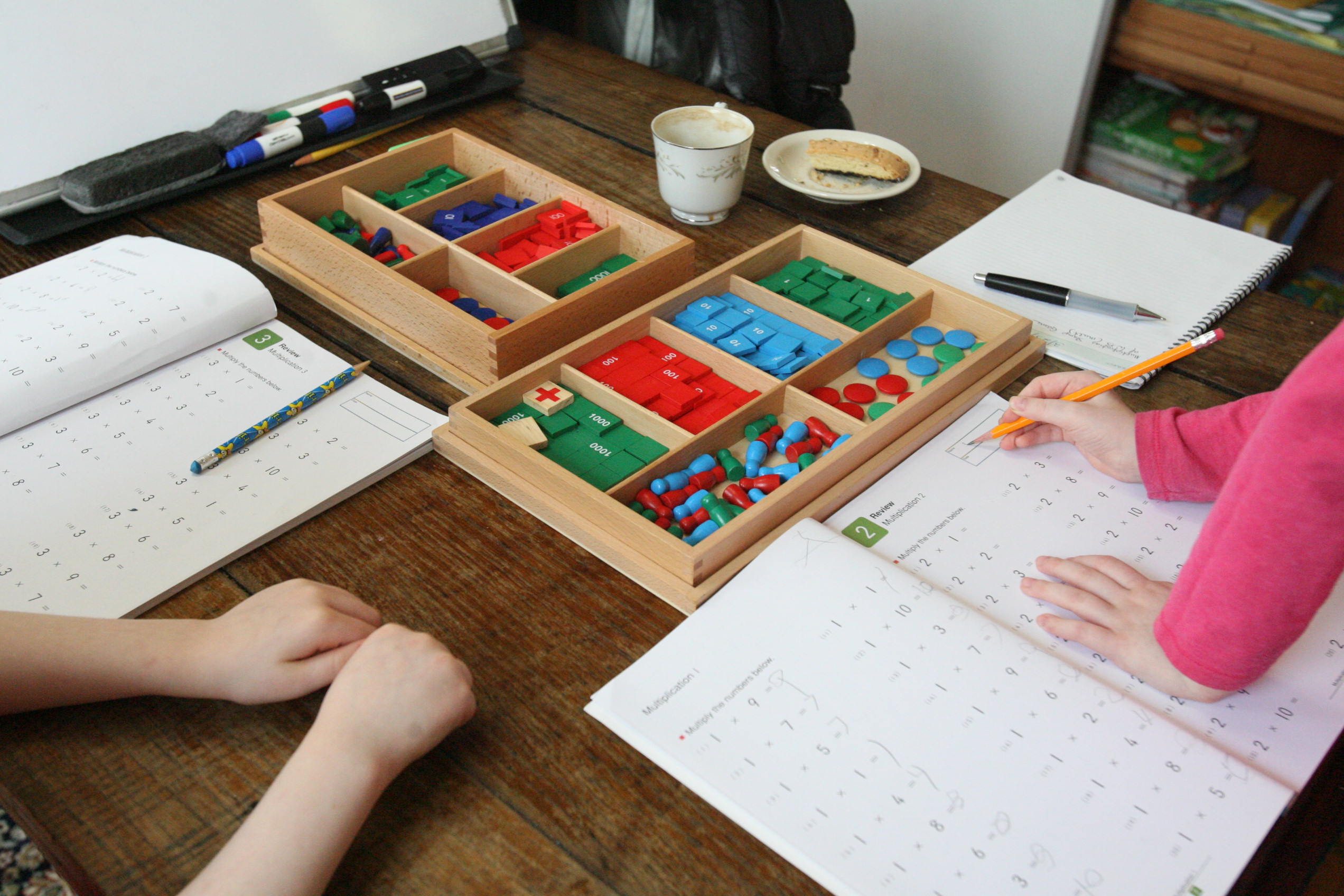 Above the girls work on the multiplication stamp game to help them fill out their workbooks.