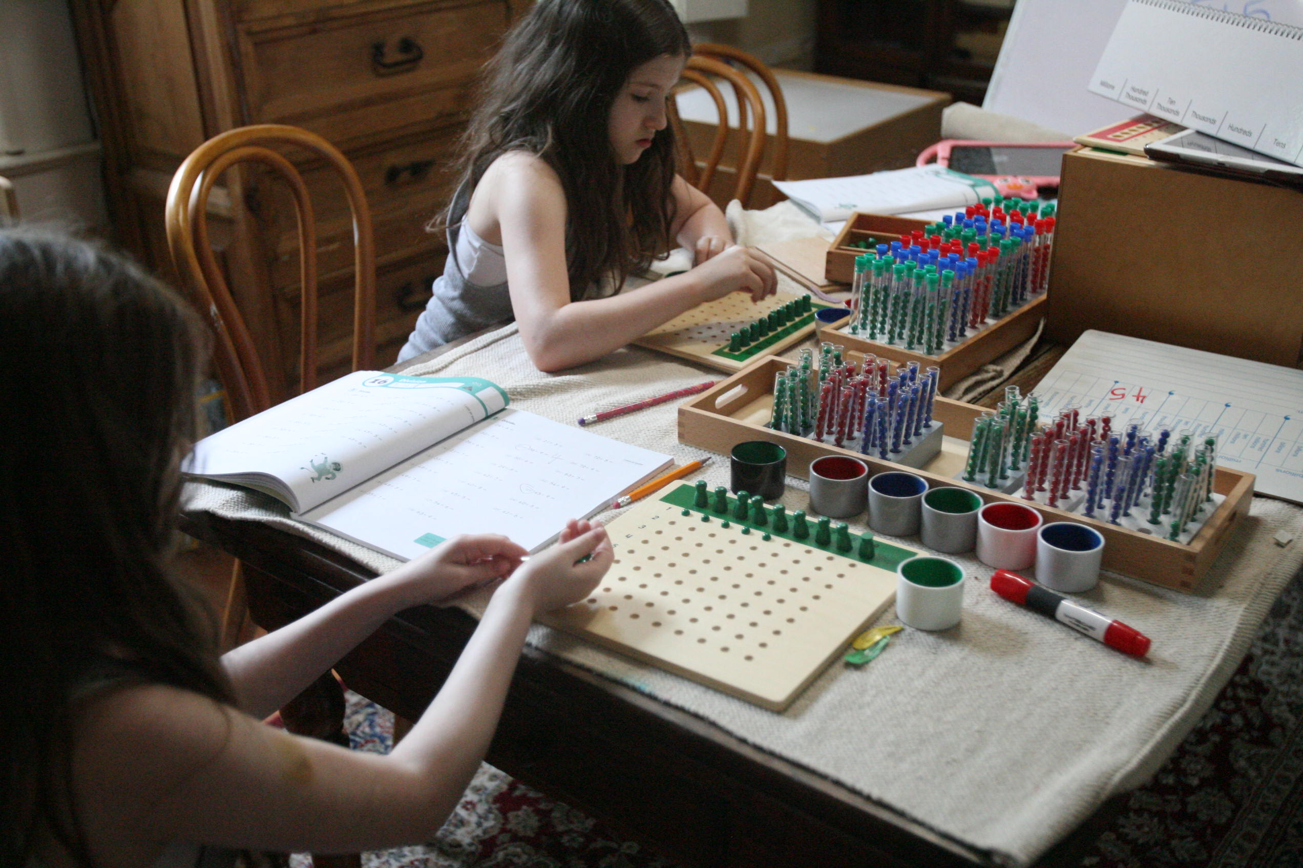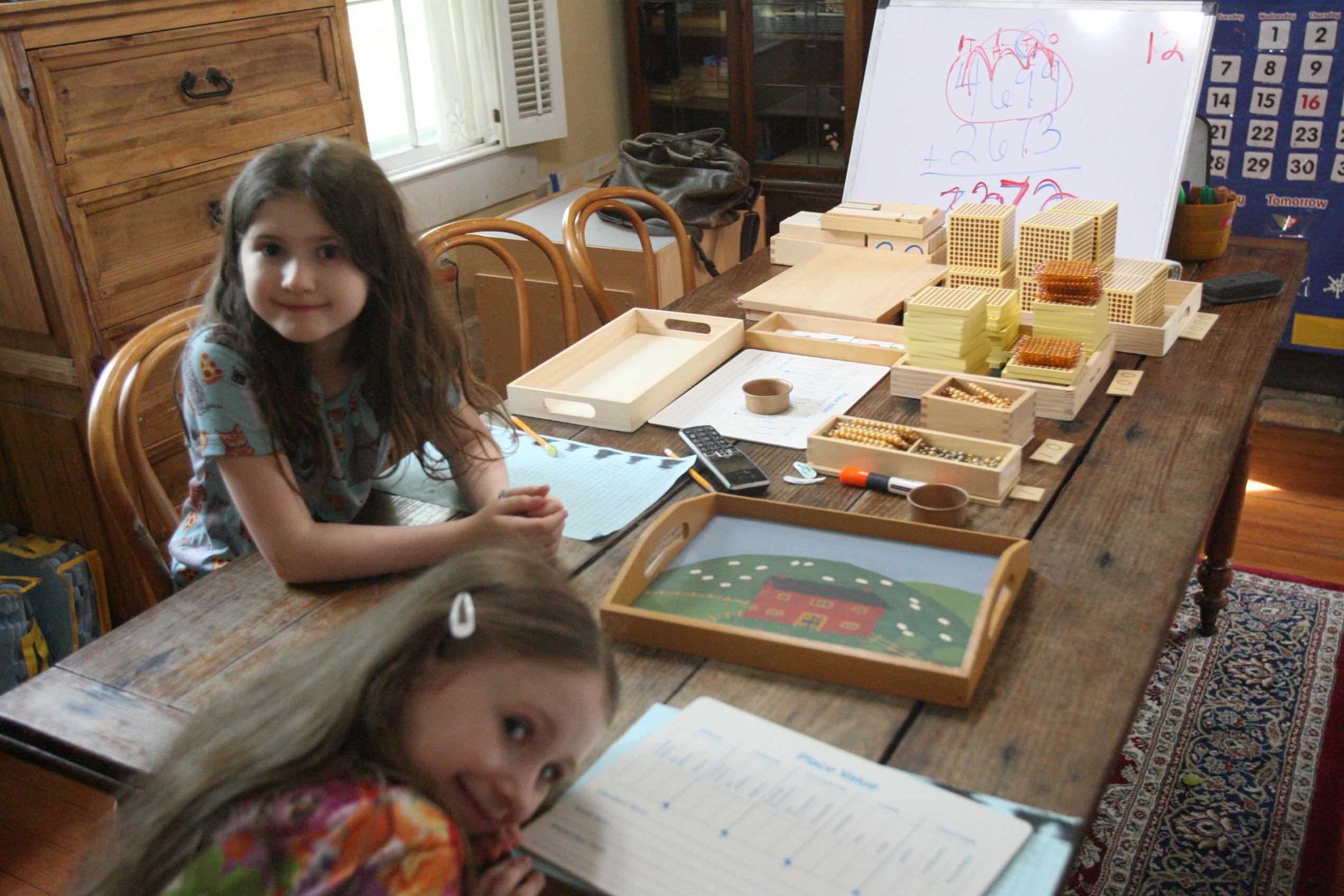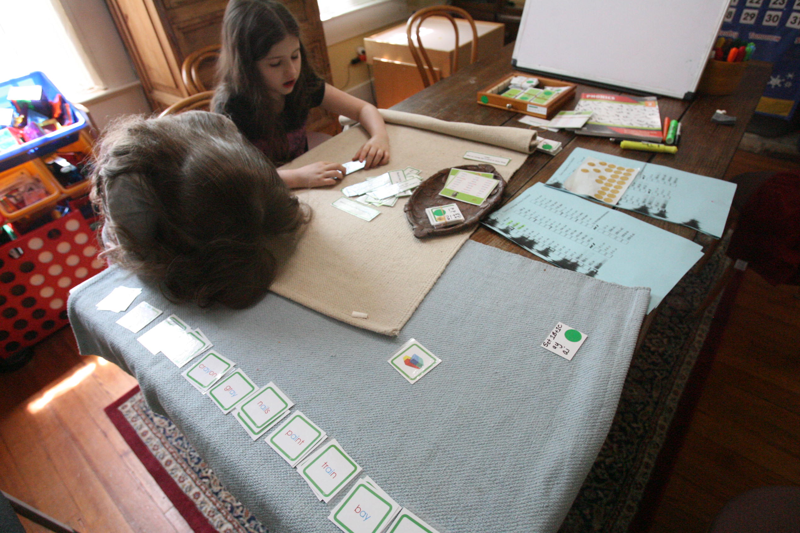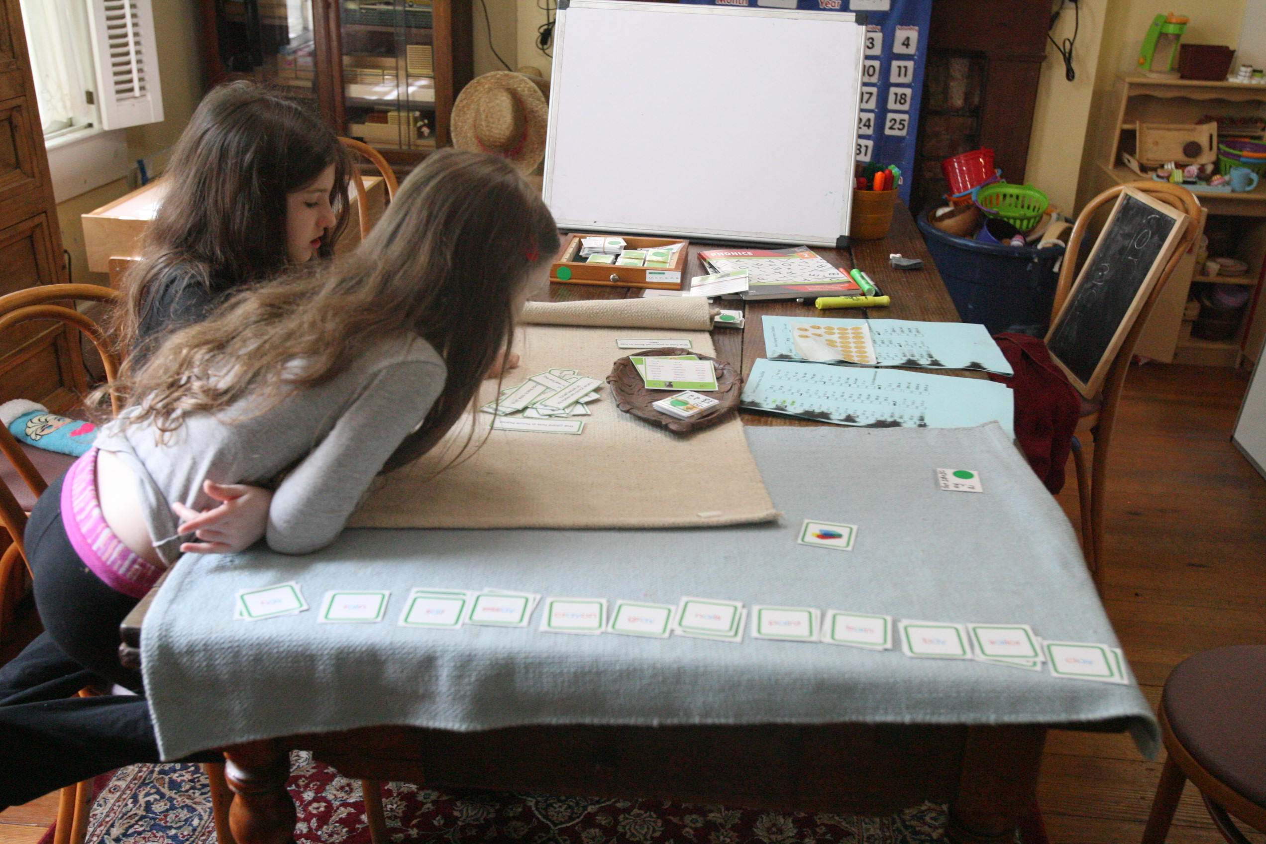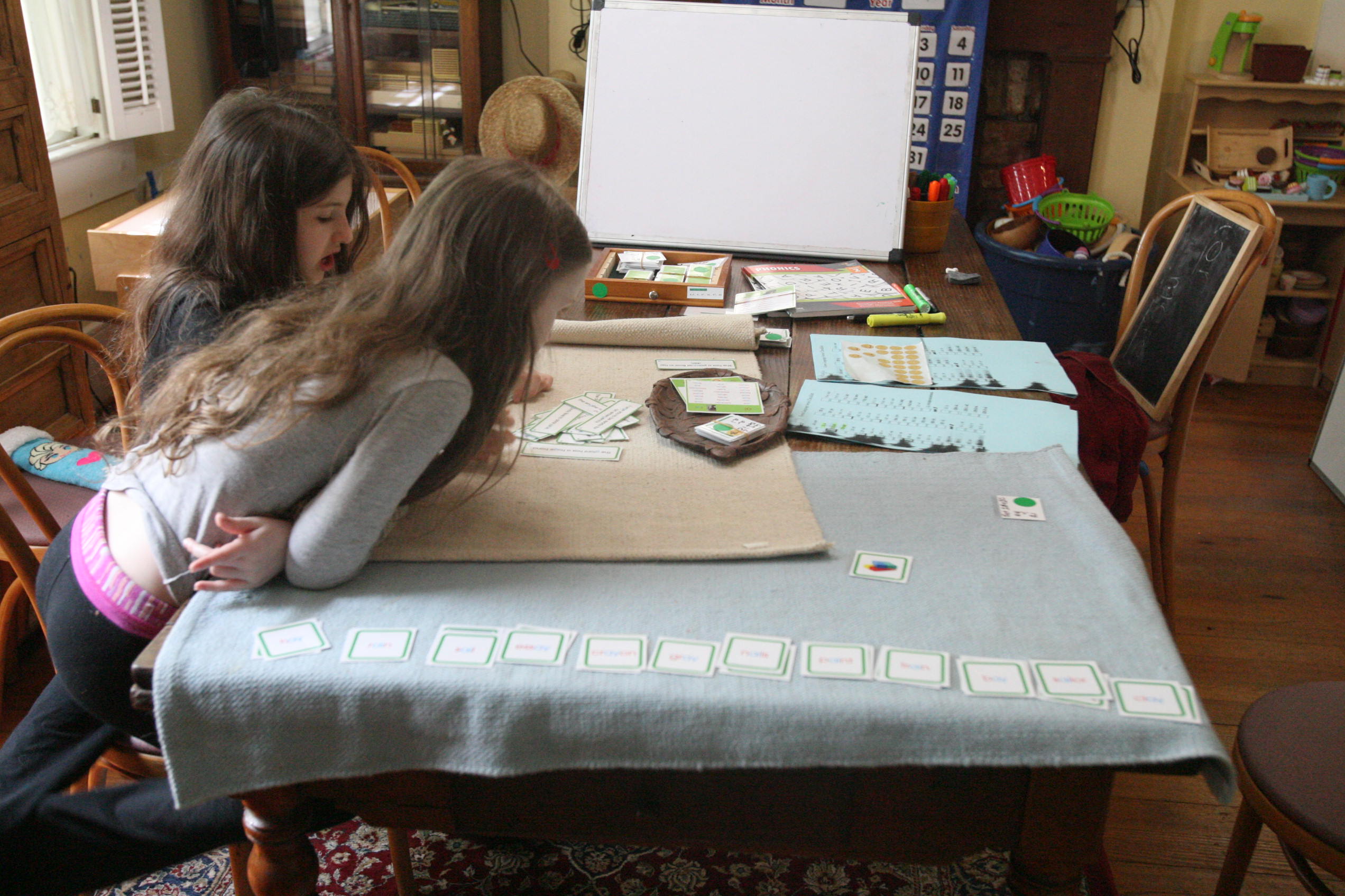 Above shows the girls doing division with racks and tubes and working on the green language series (montessori).