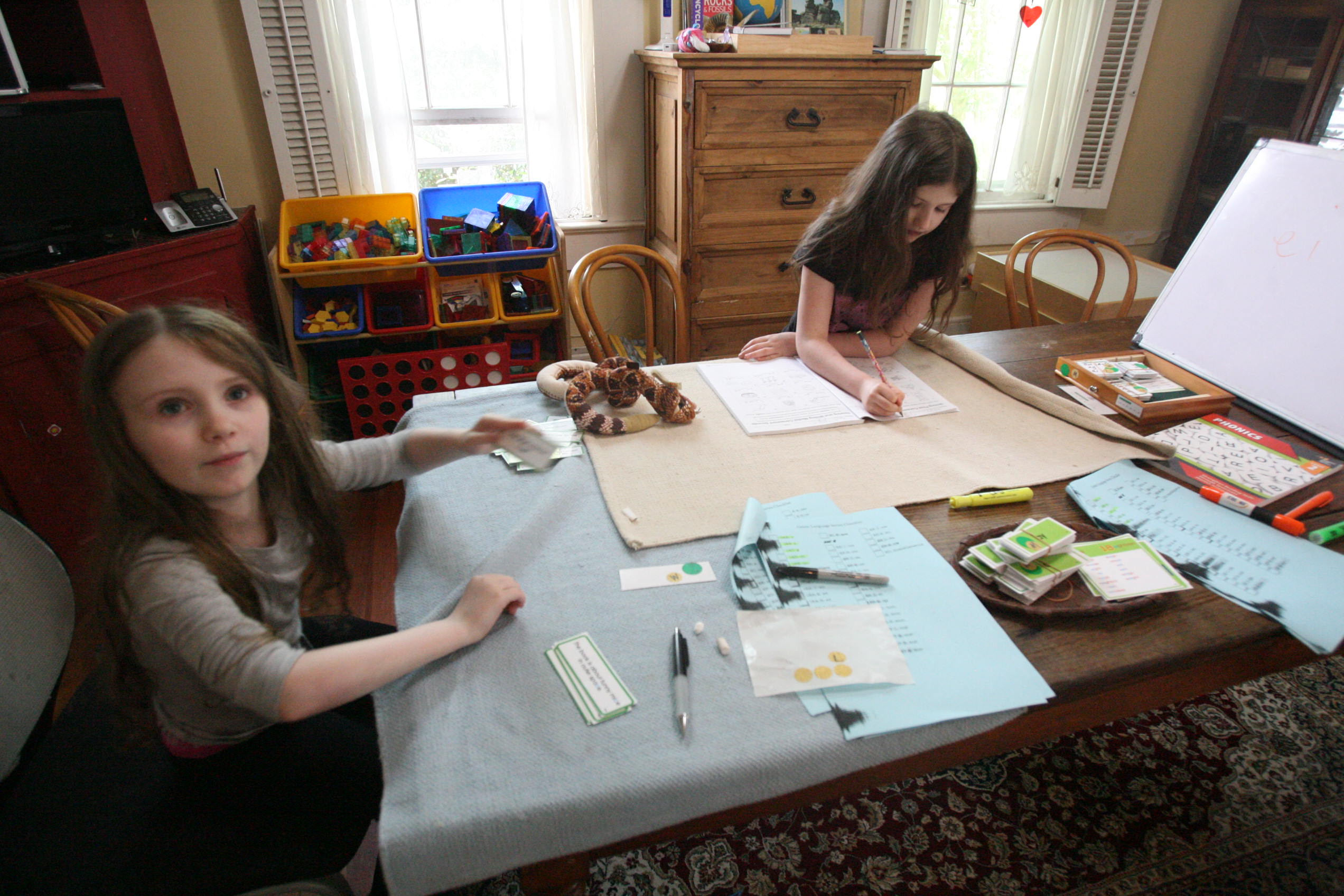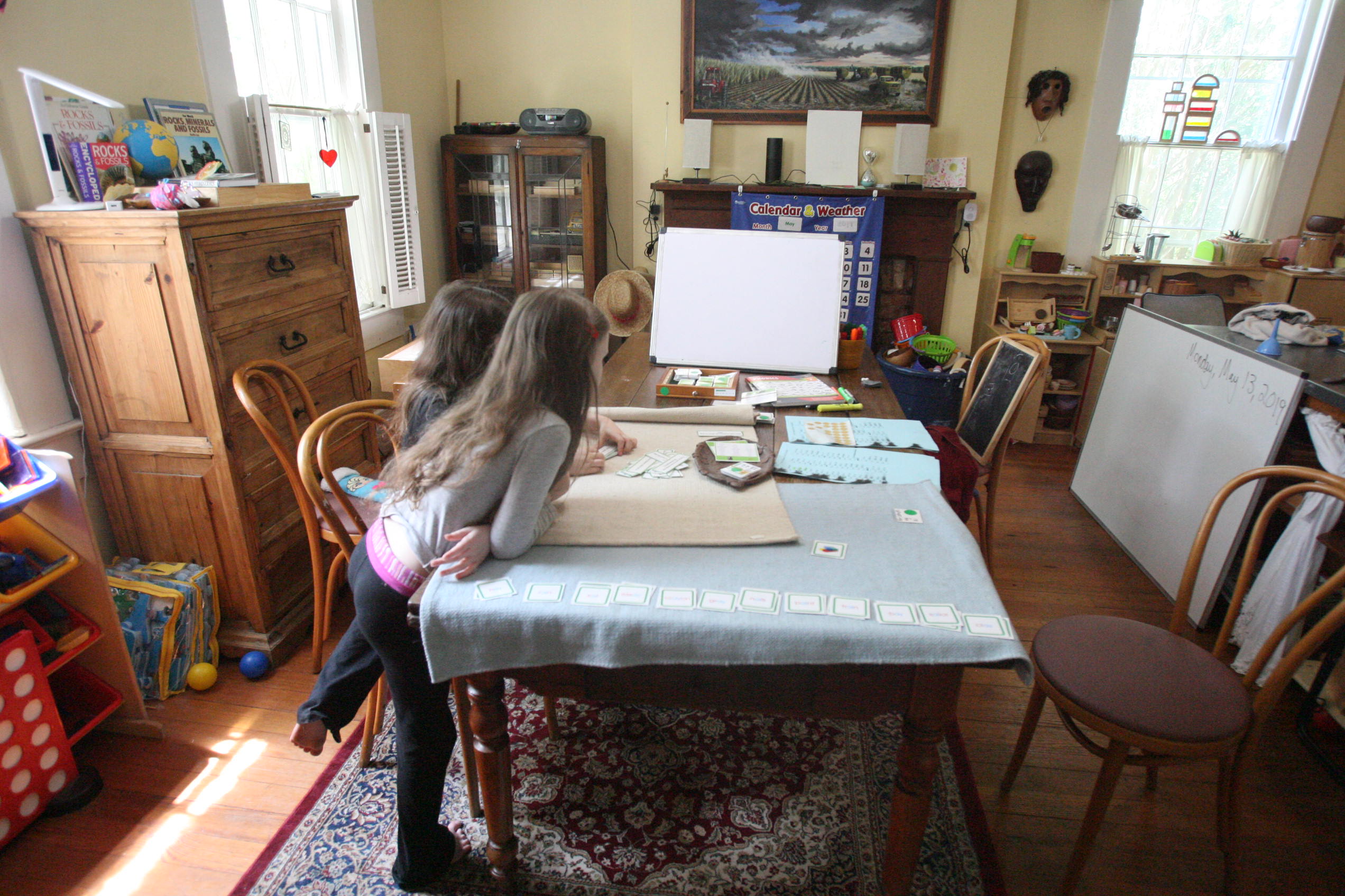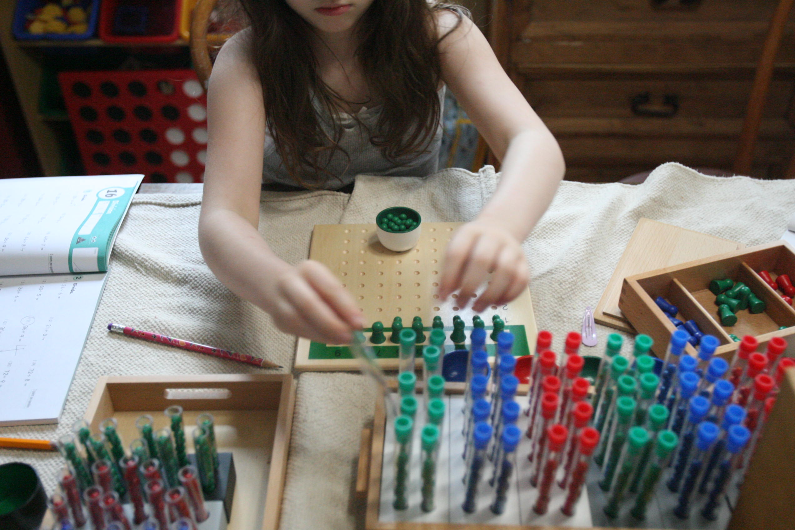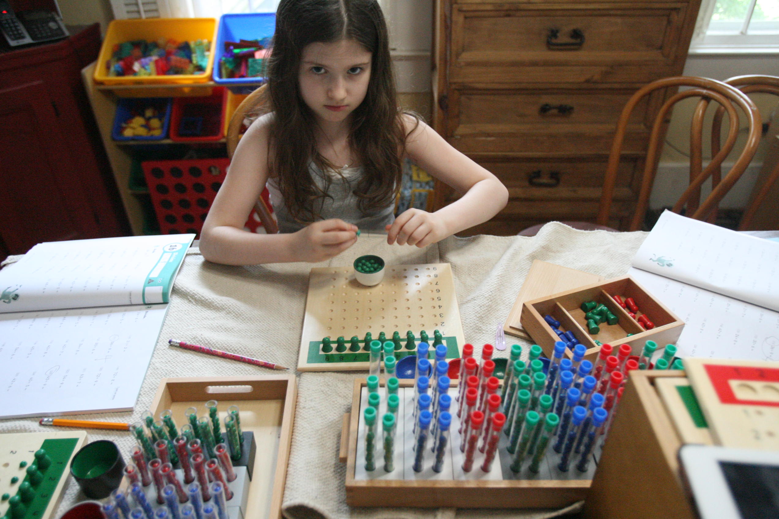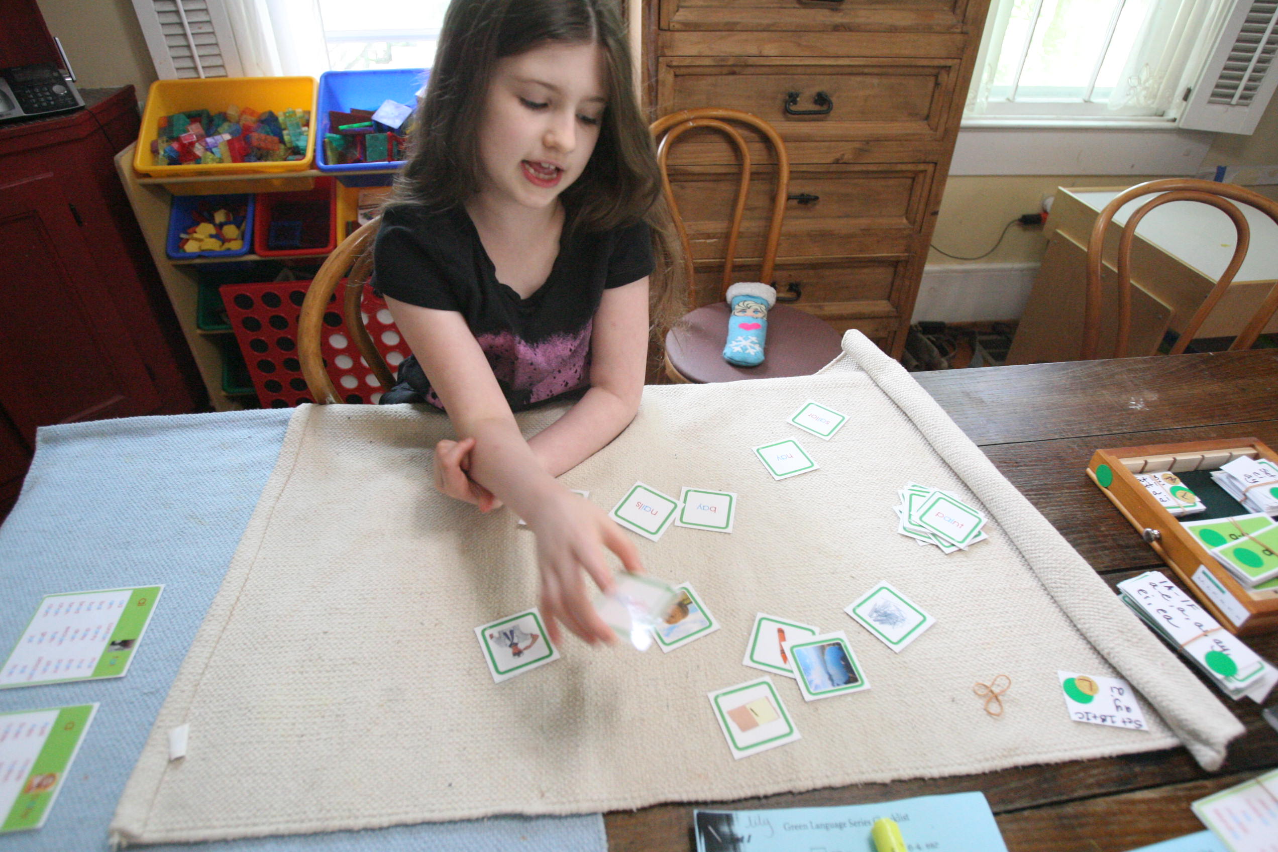 Above shows the girls doing division with racks and tubes and working on the green language series (montessori).