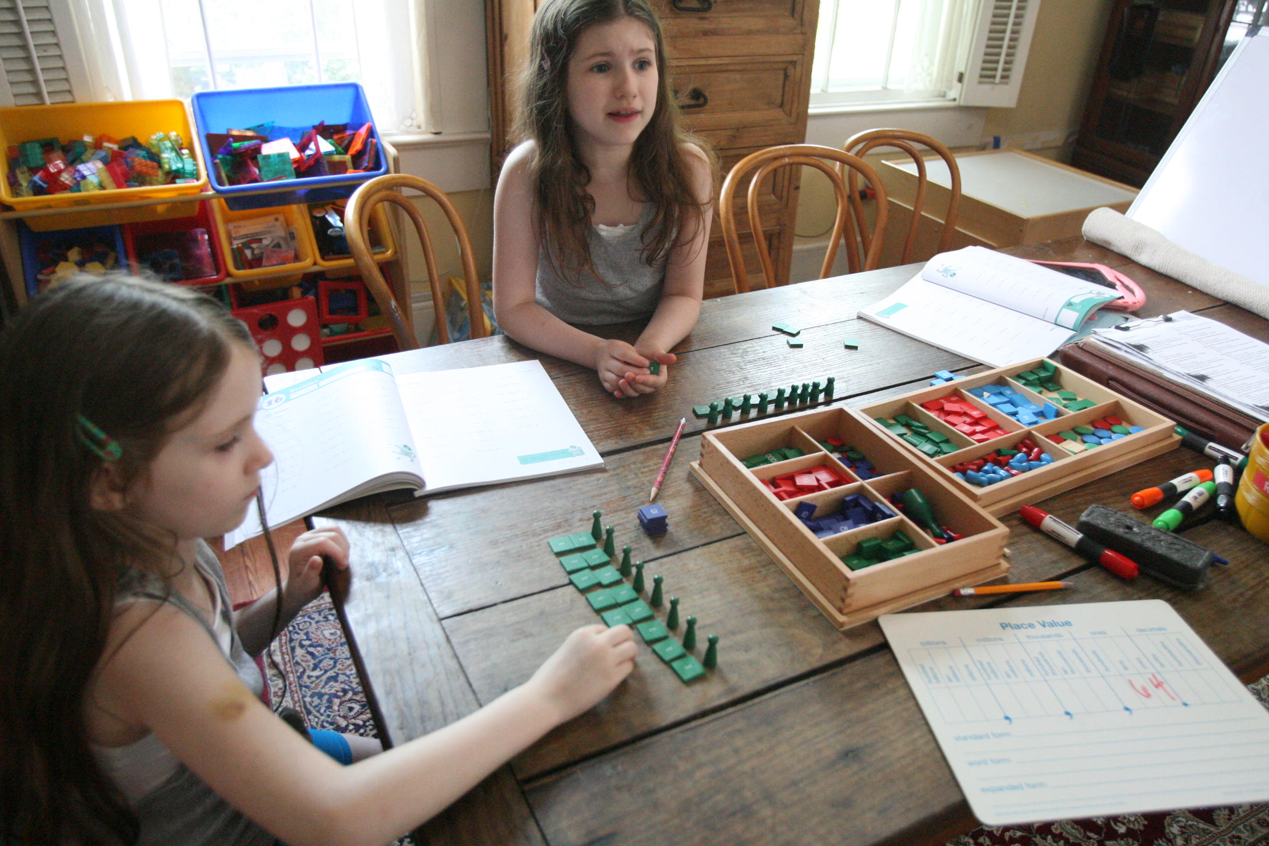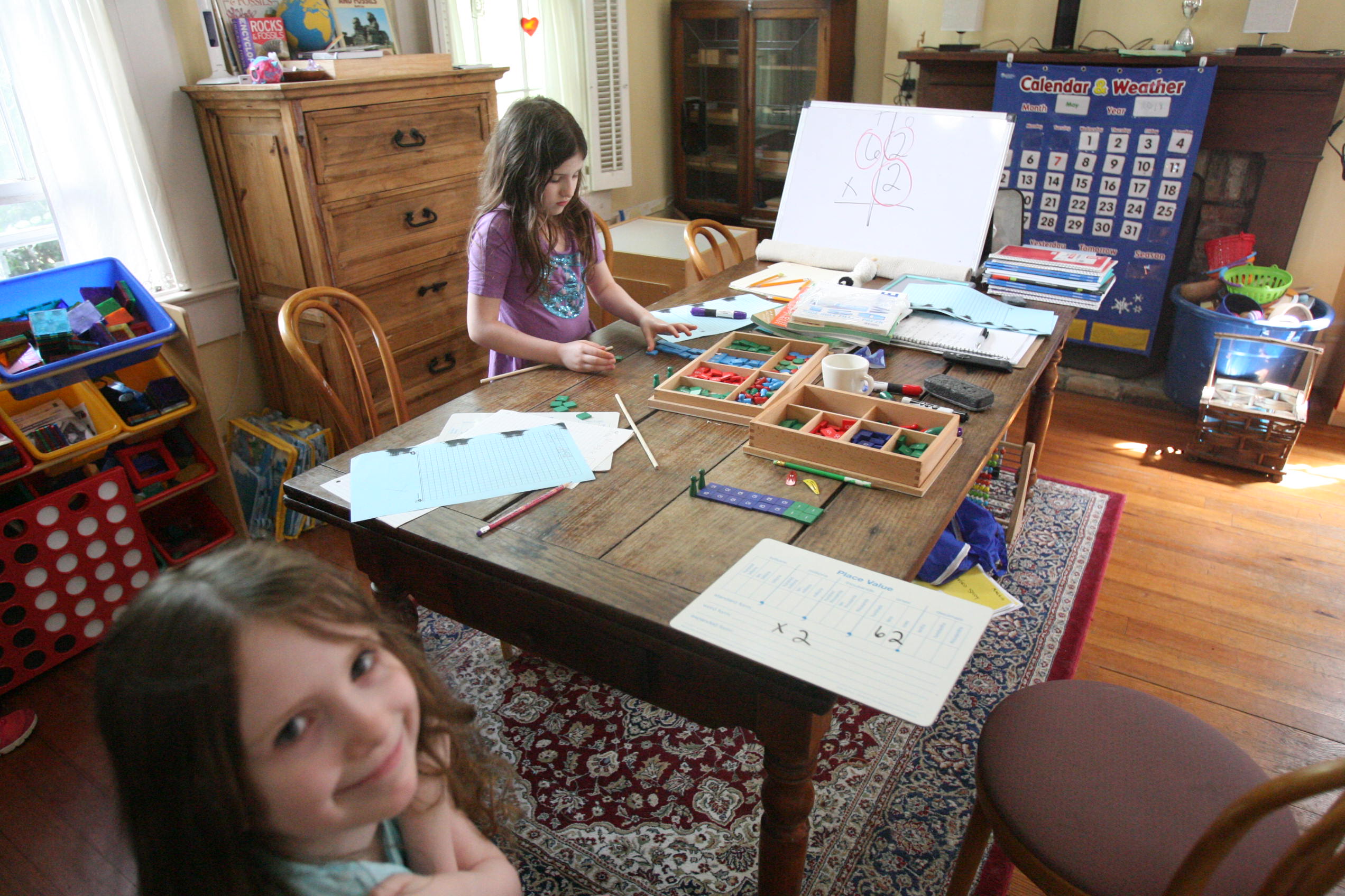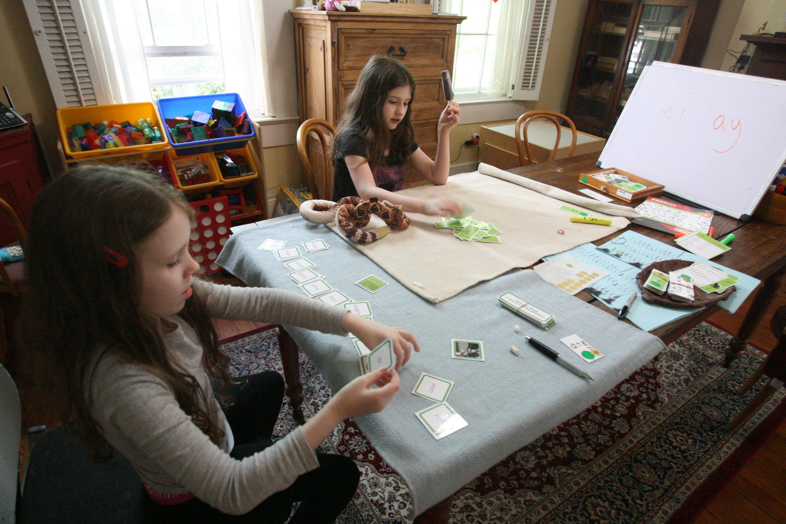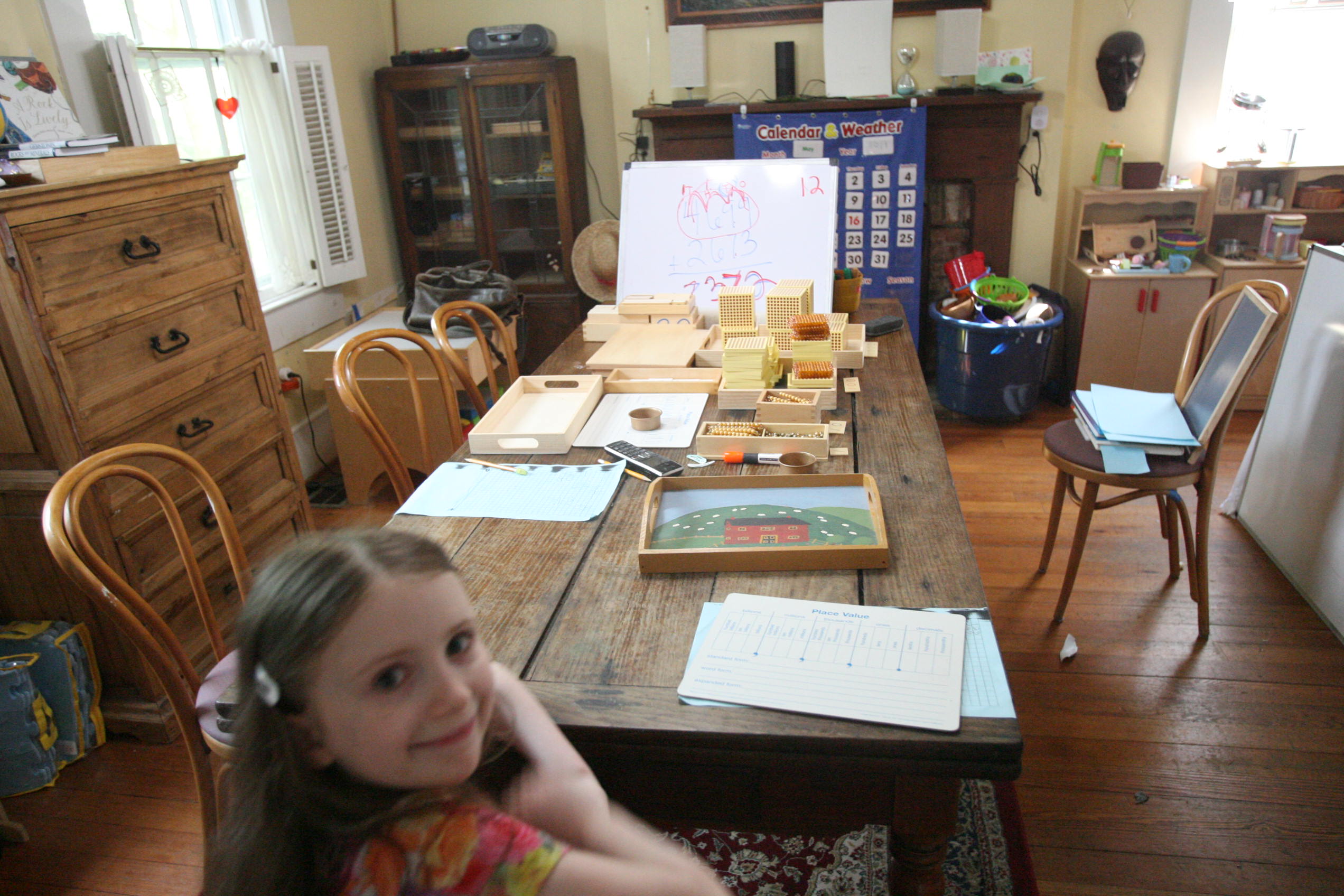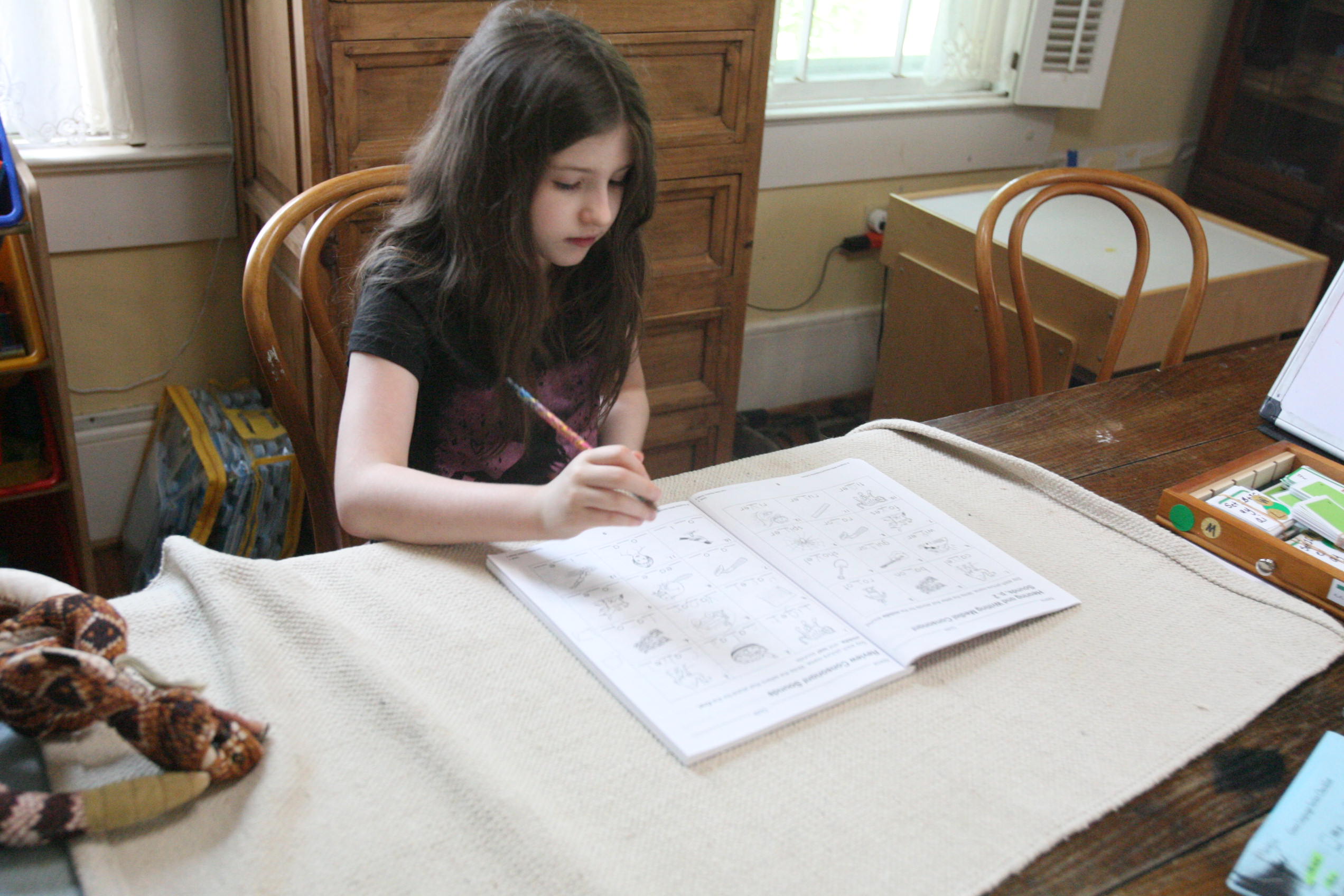 Above shows the girls doing division with racks and tubes and working on the green language series (montessori).