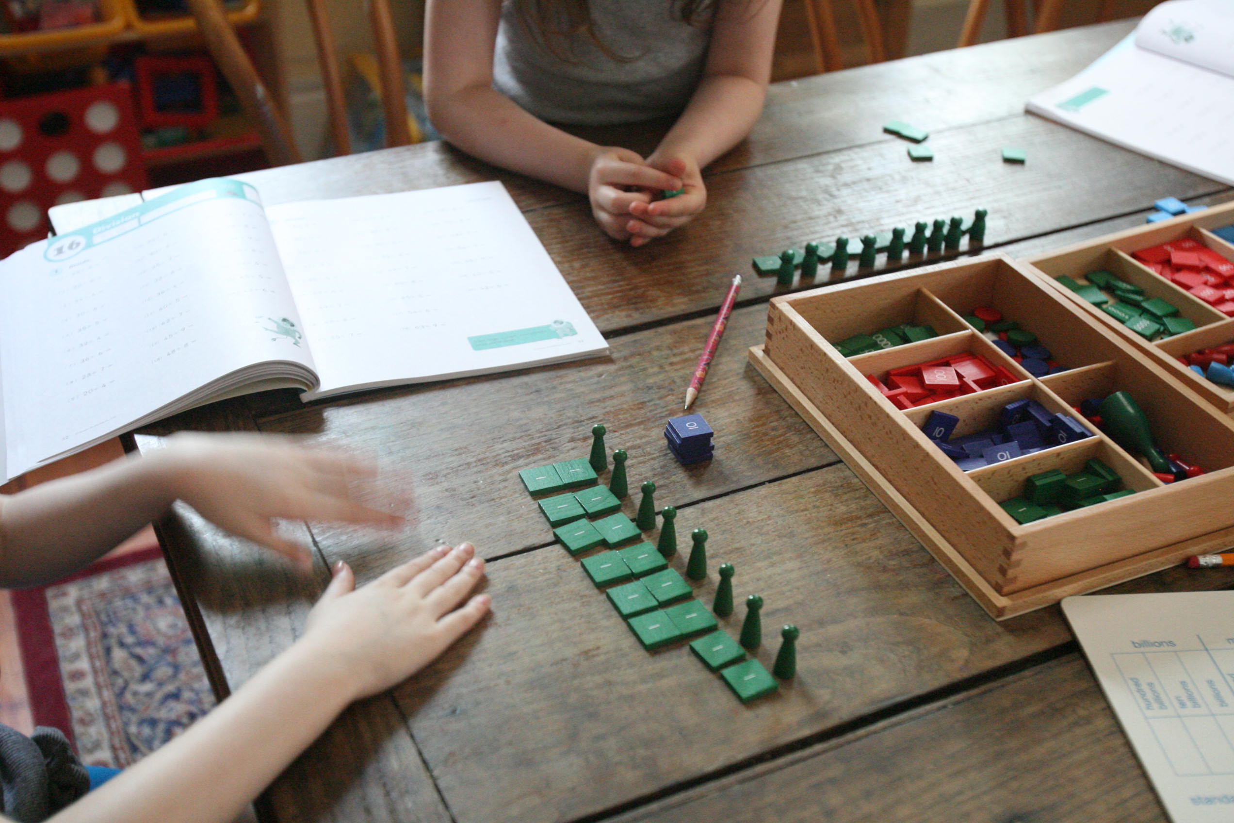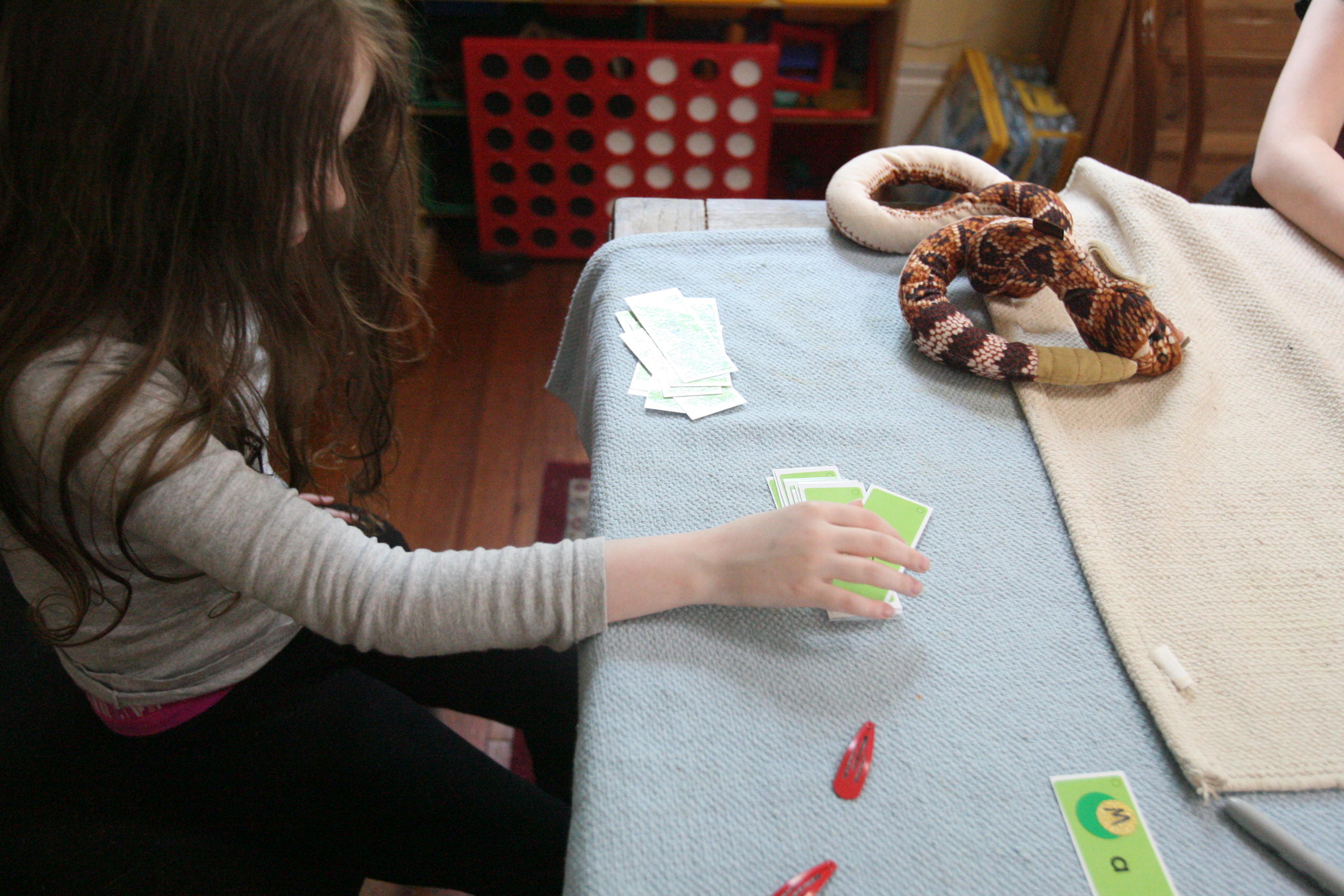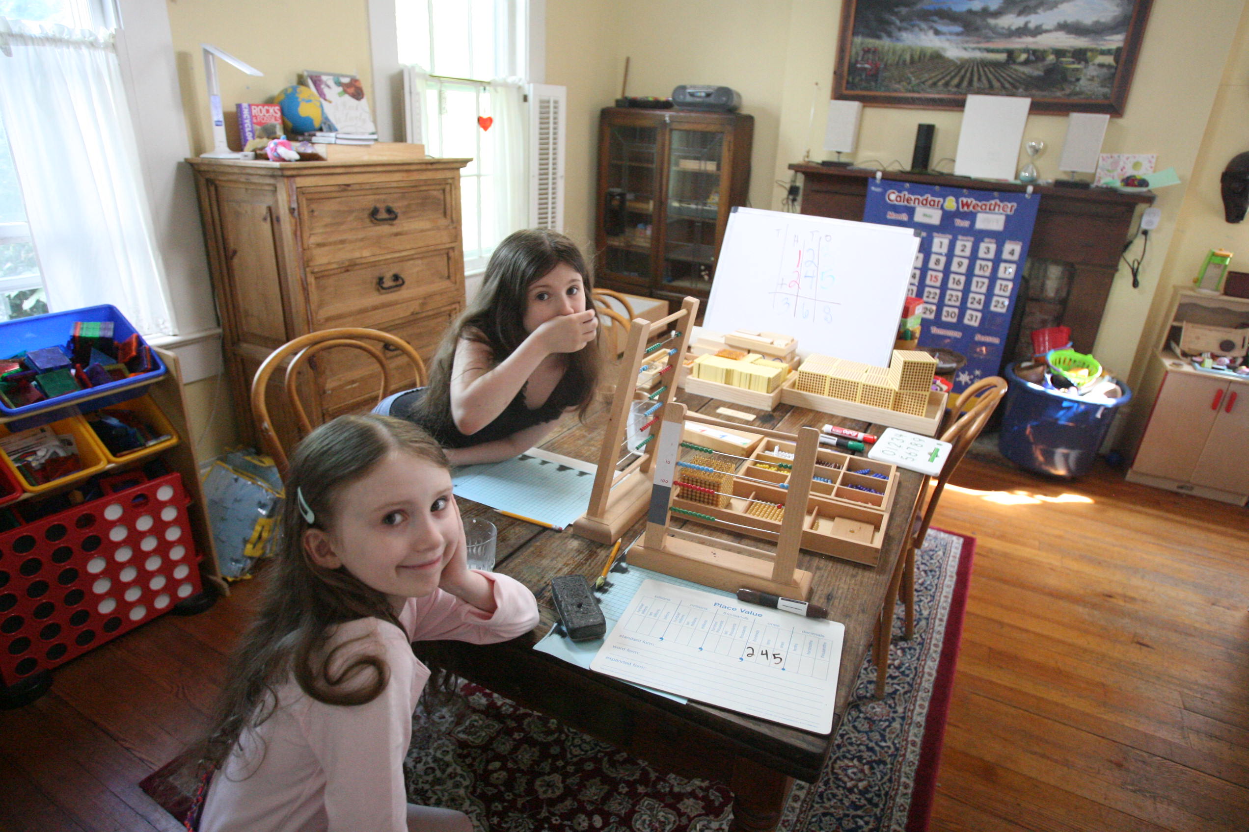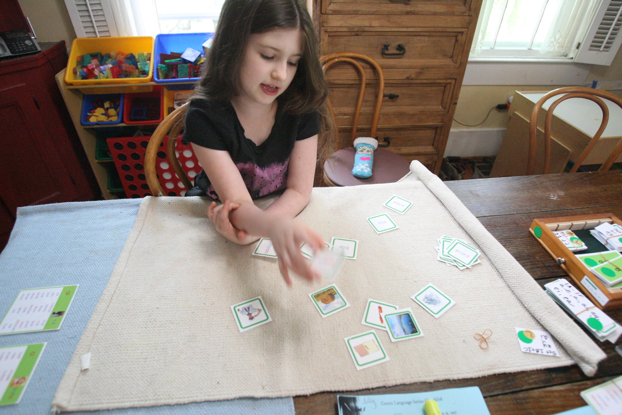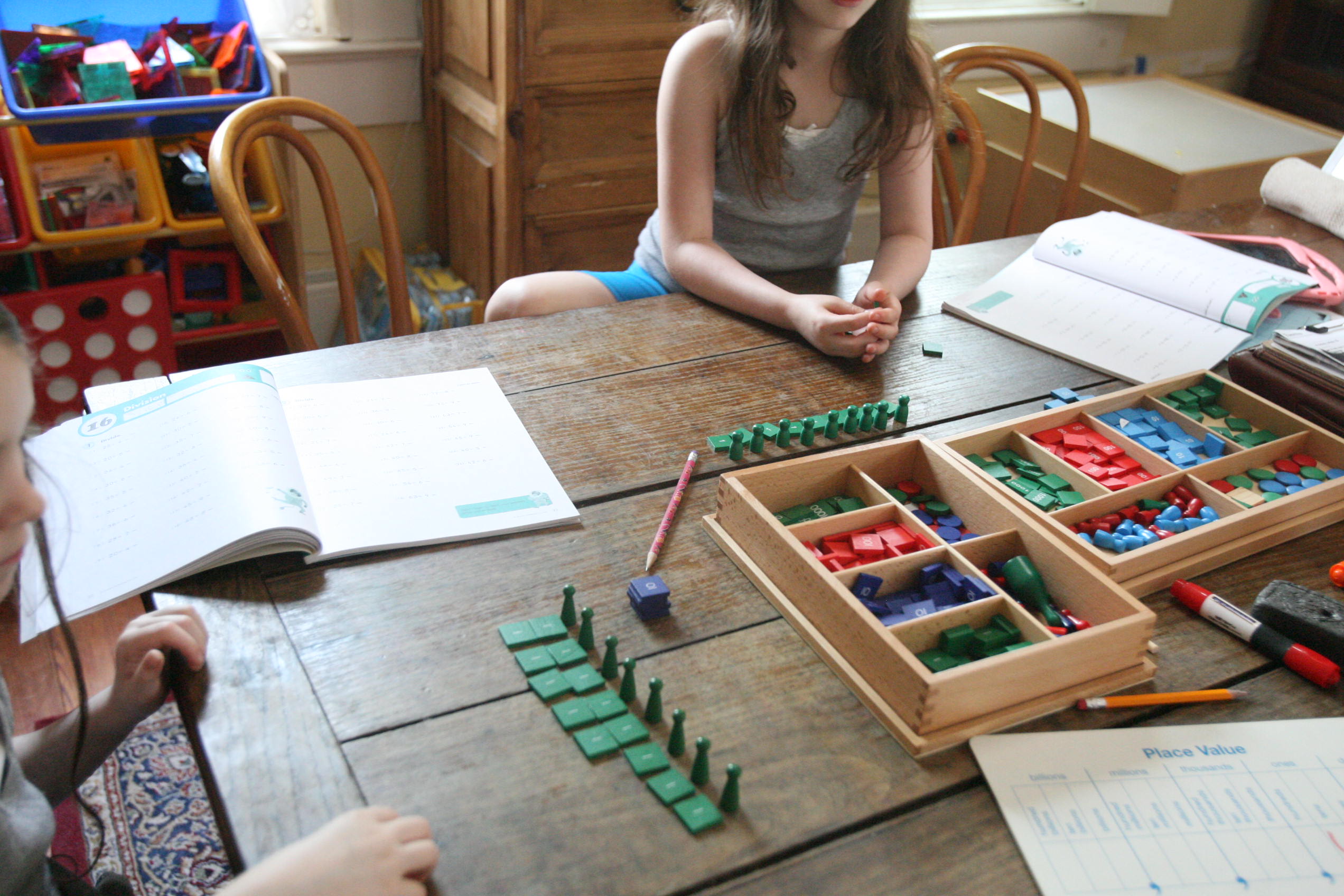 Above shows the girls doing division with racks and tubes and working on the green language series (montessori).