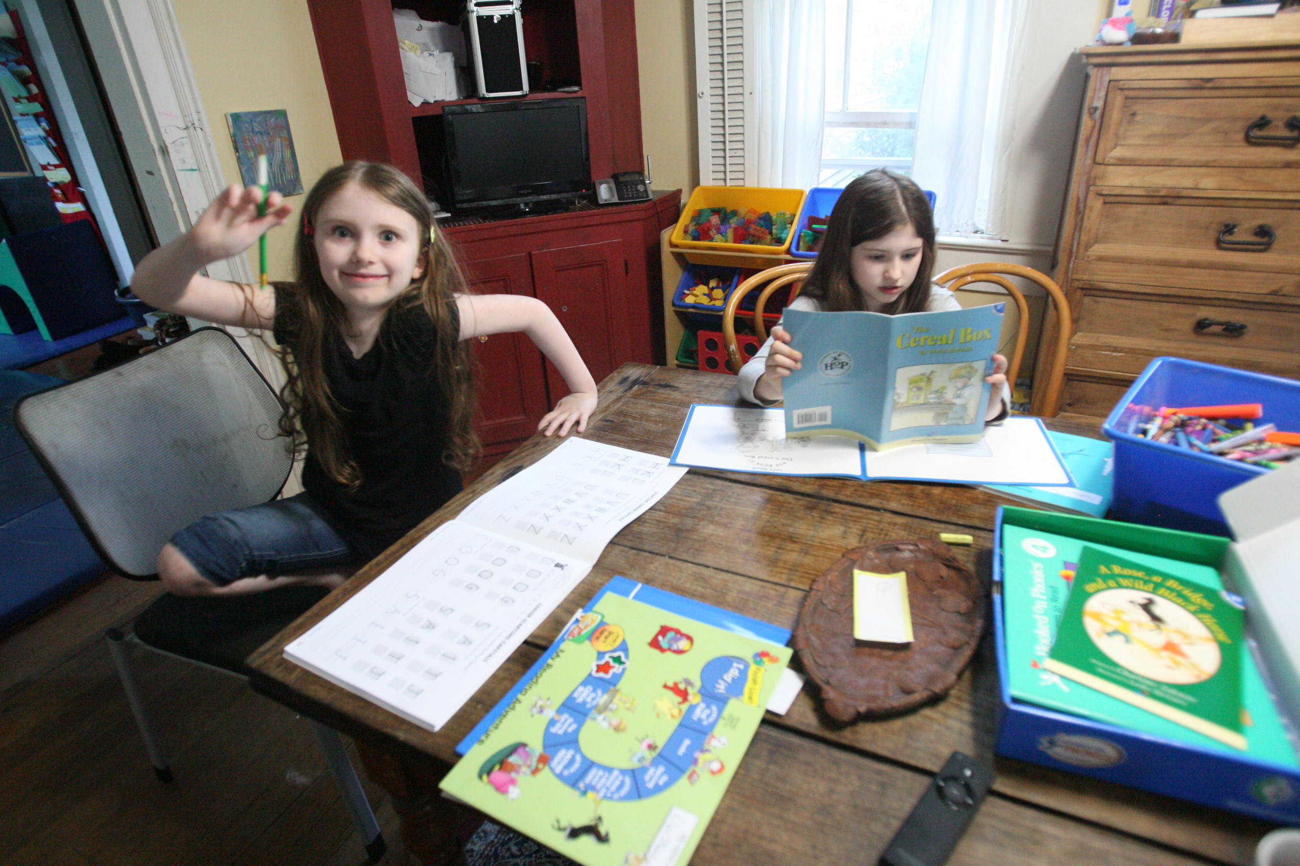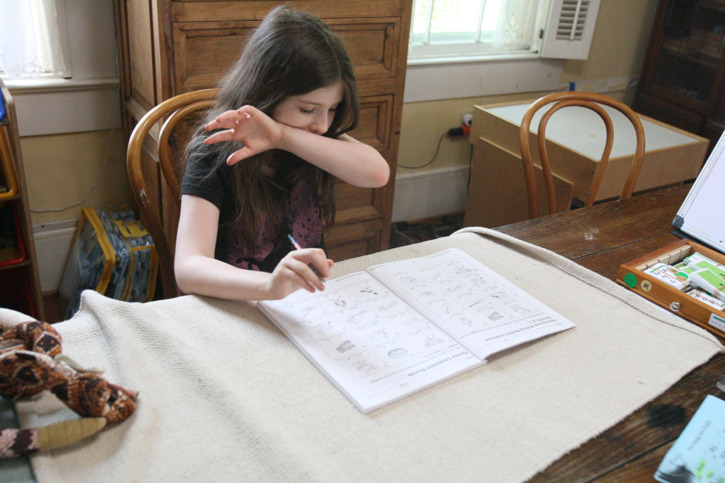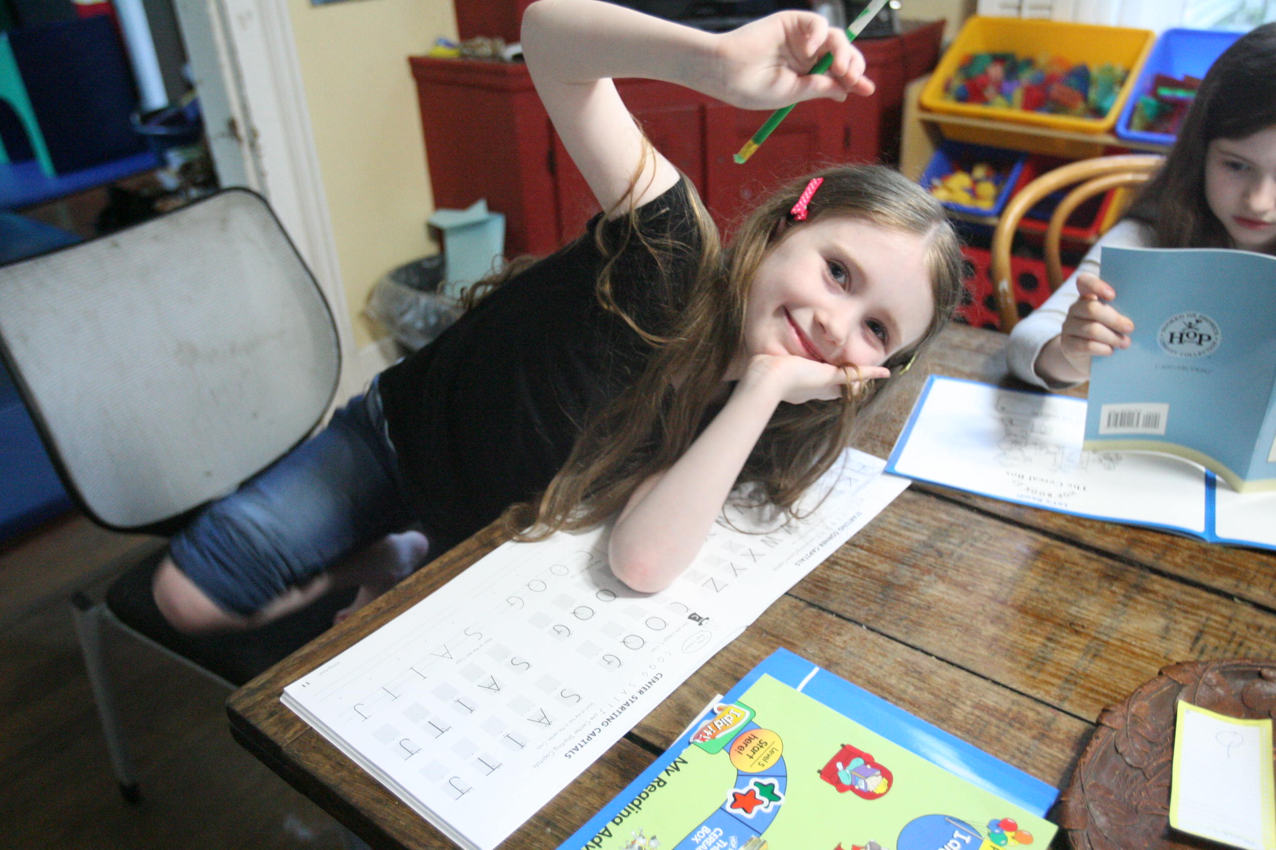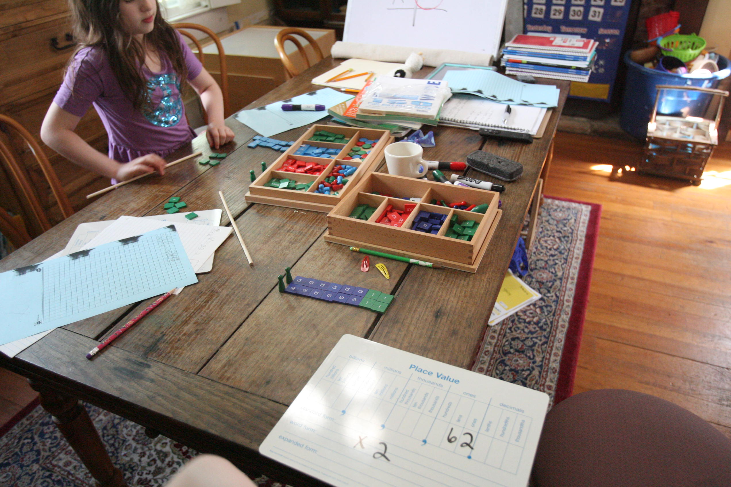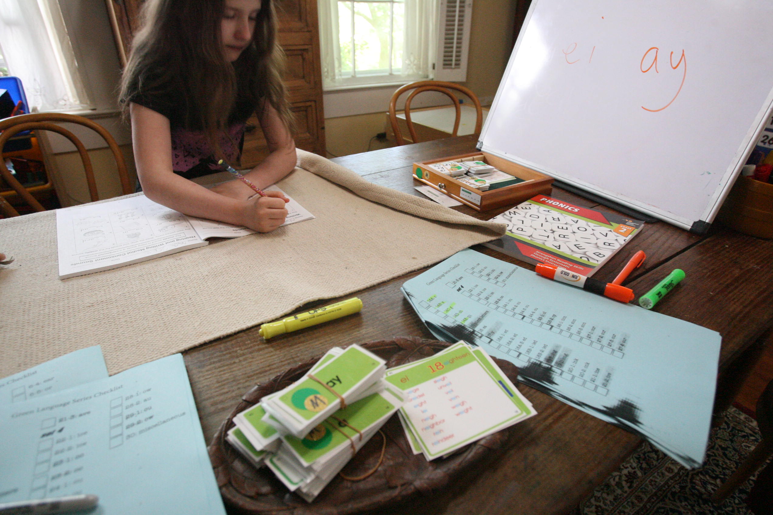 Above shows the girls doing division with racks and tubes and working on the green language series (montessori).