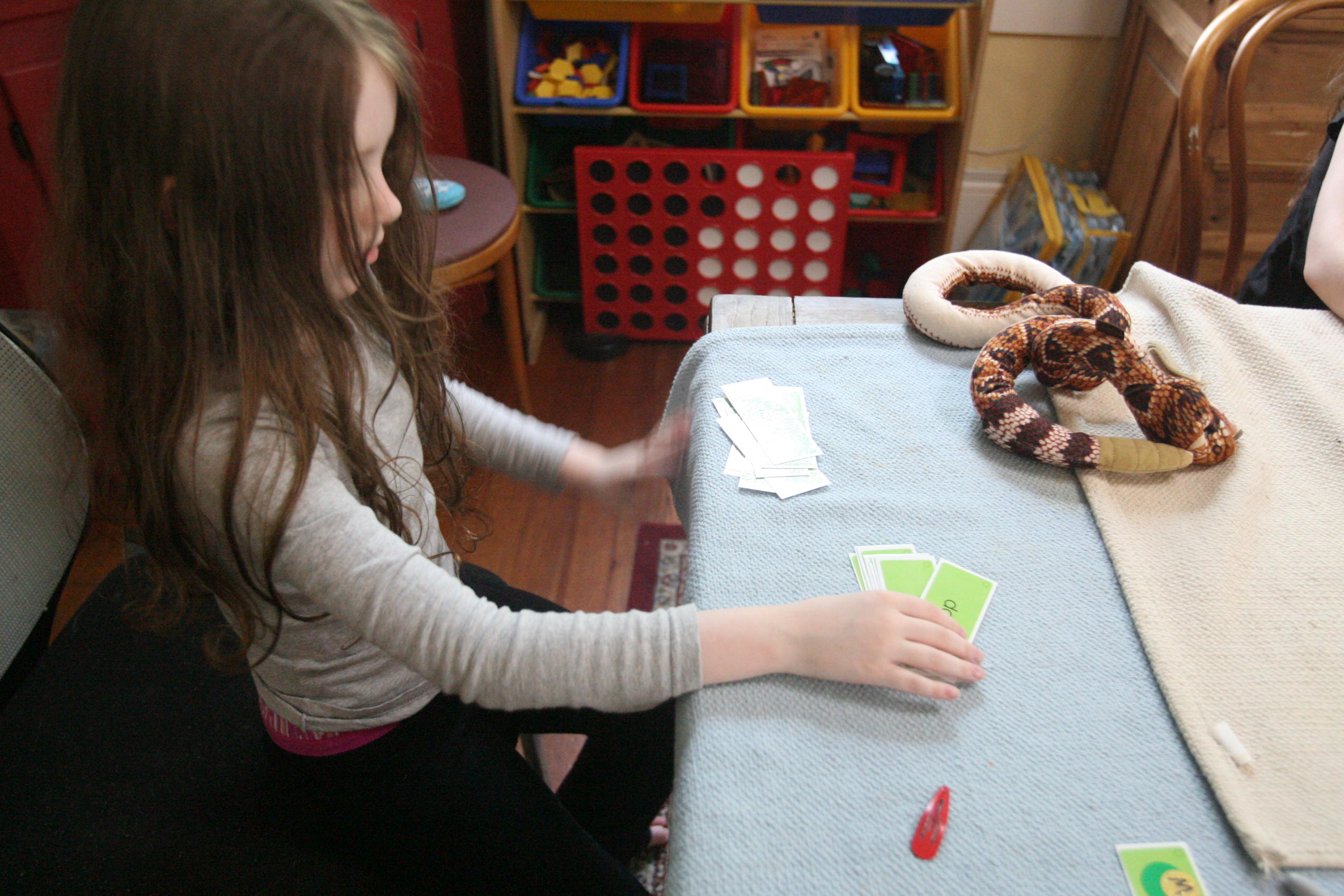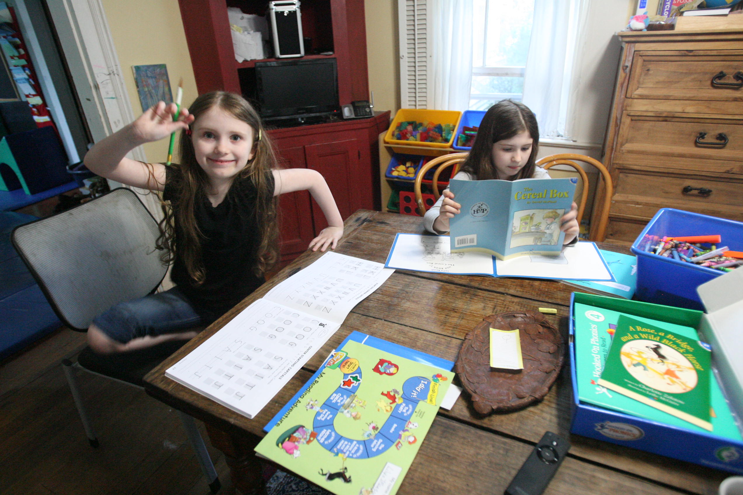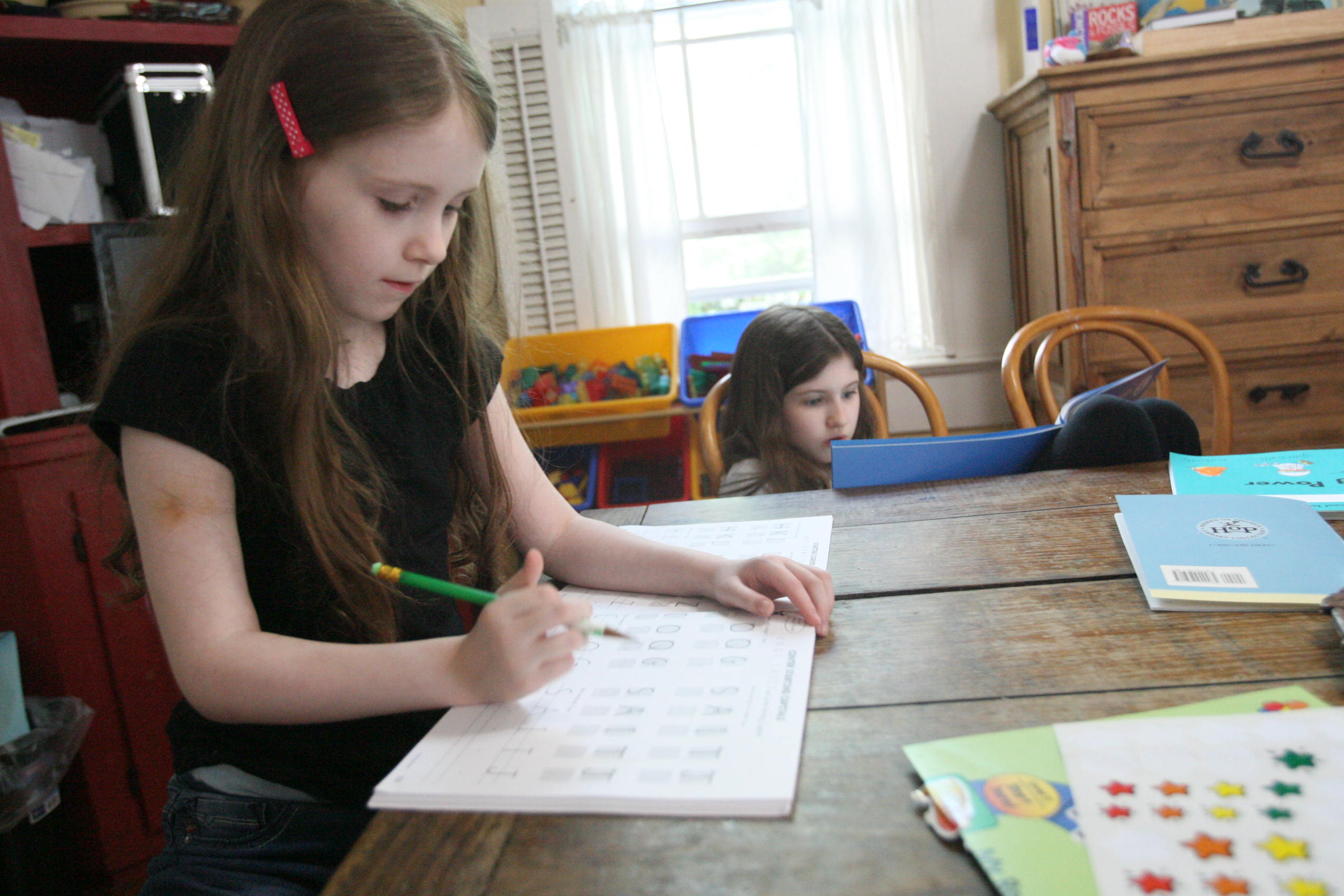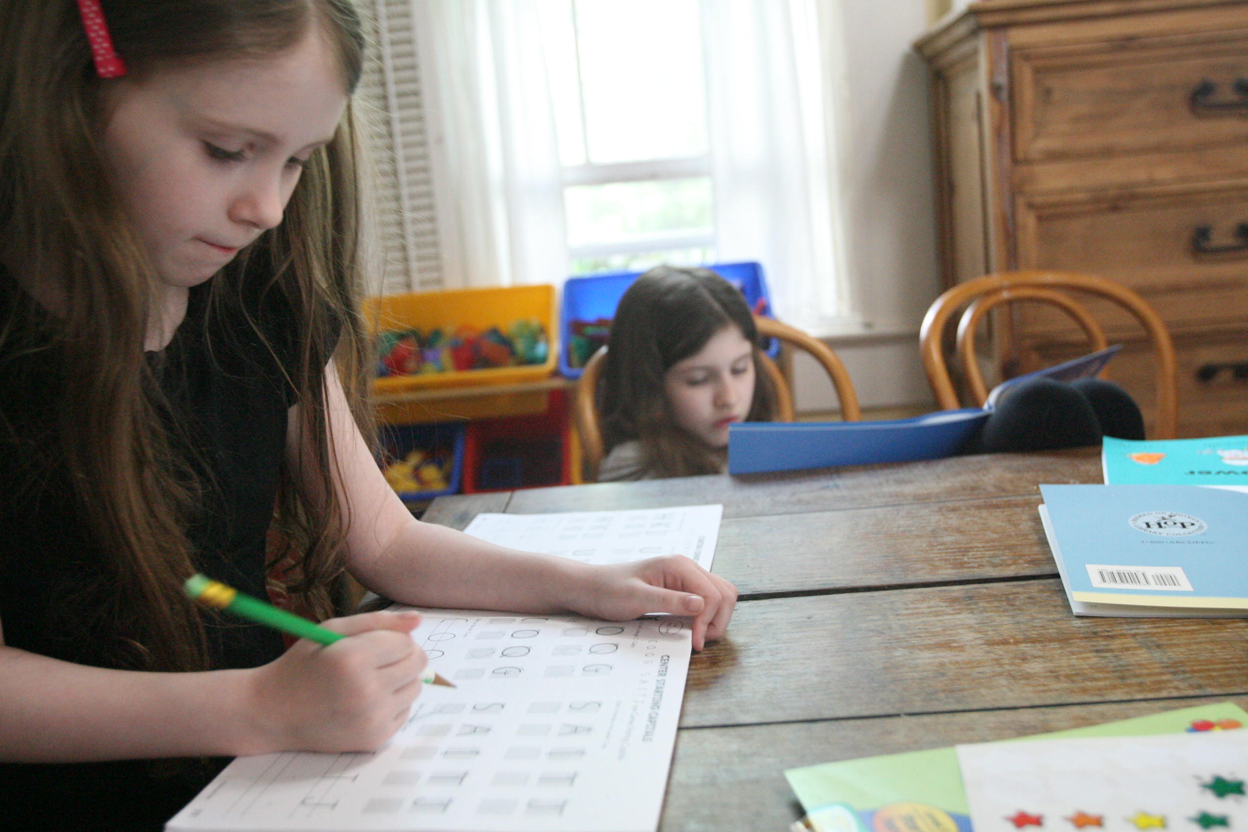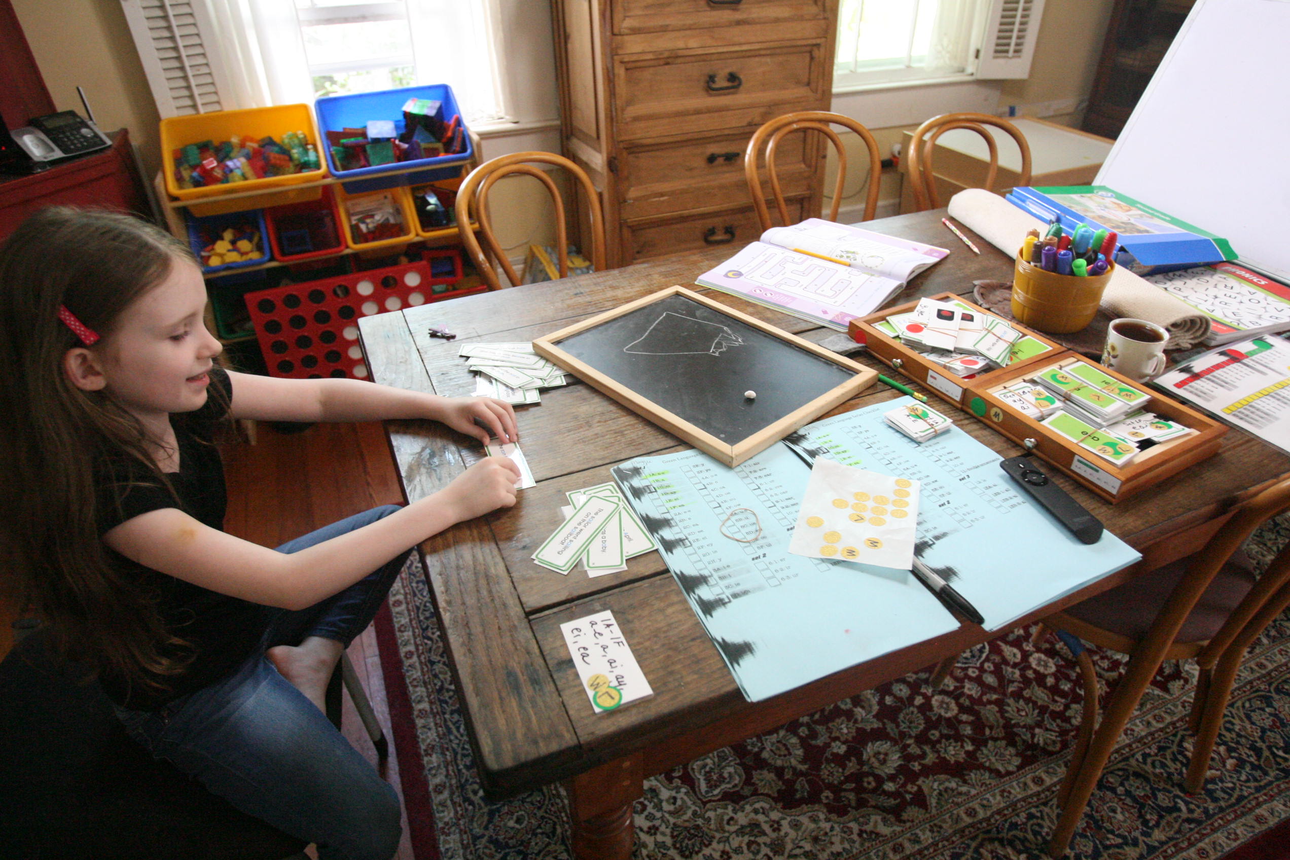 Above shows the girls doing division with racks and tubes and working on the green language series (montessori).