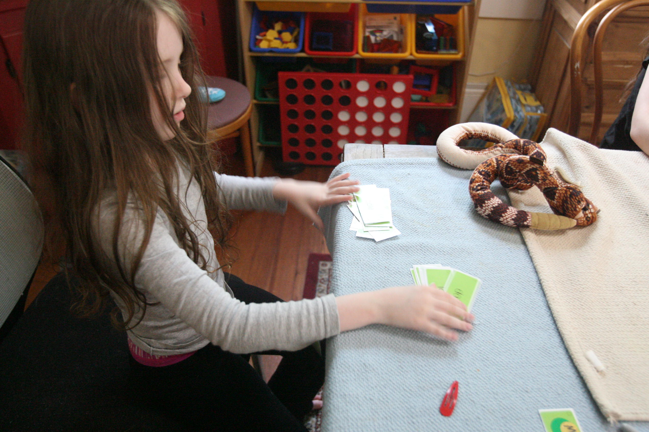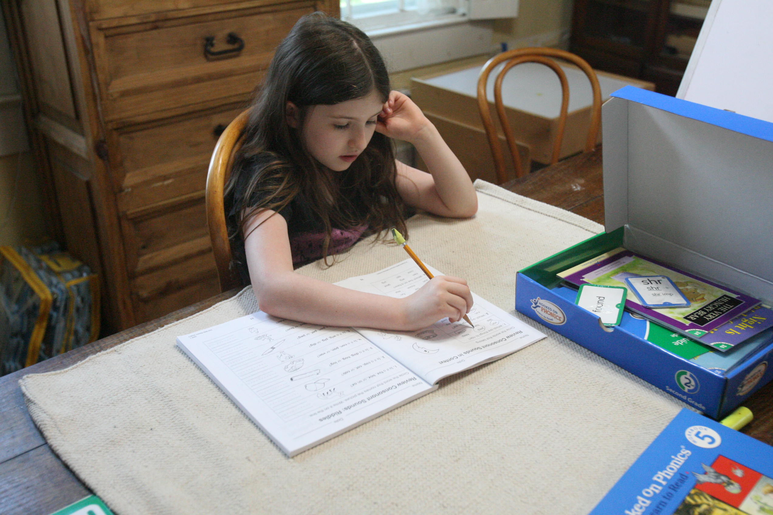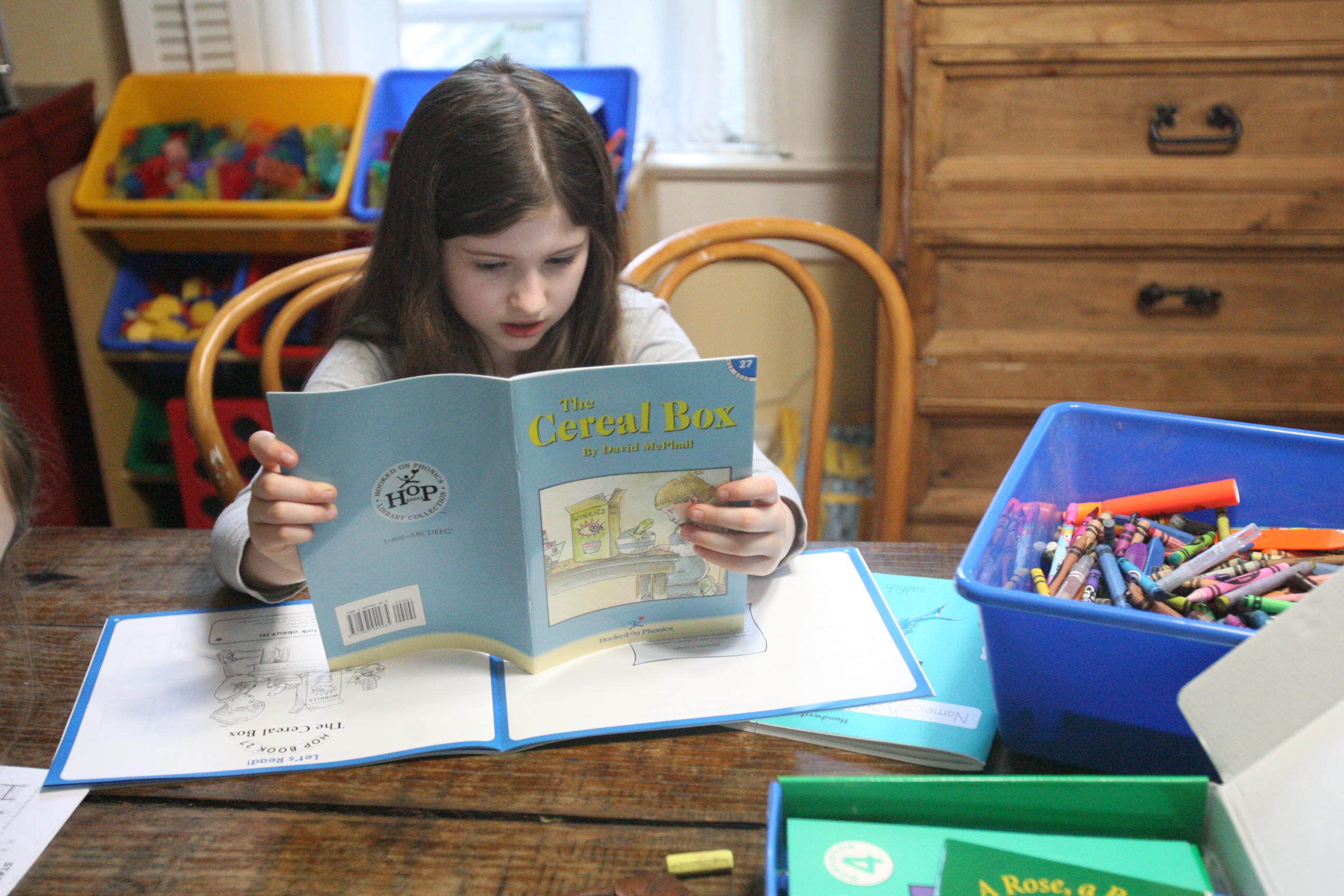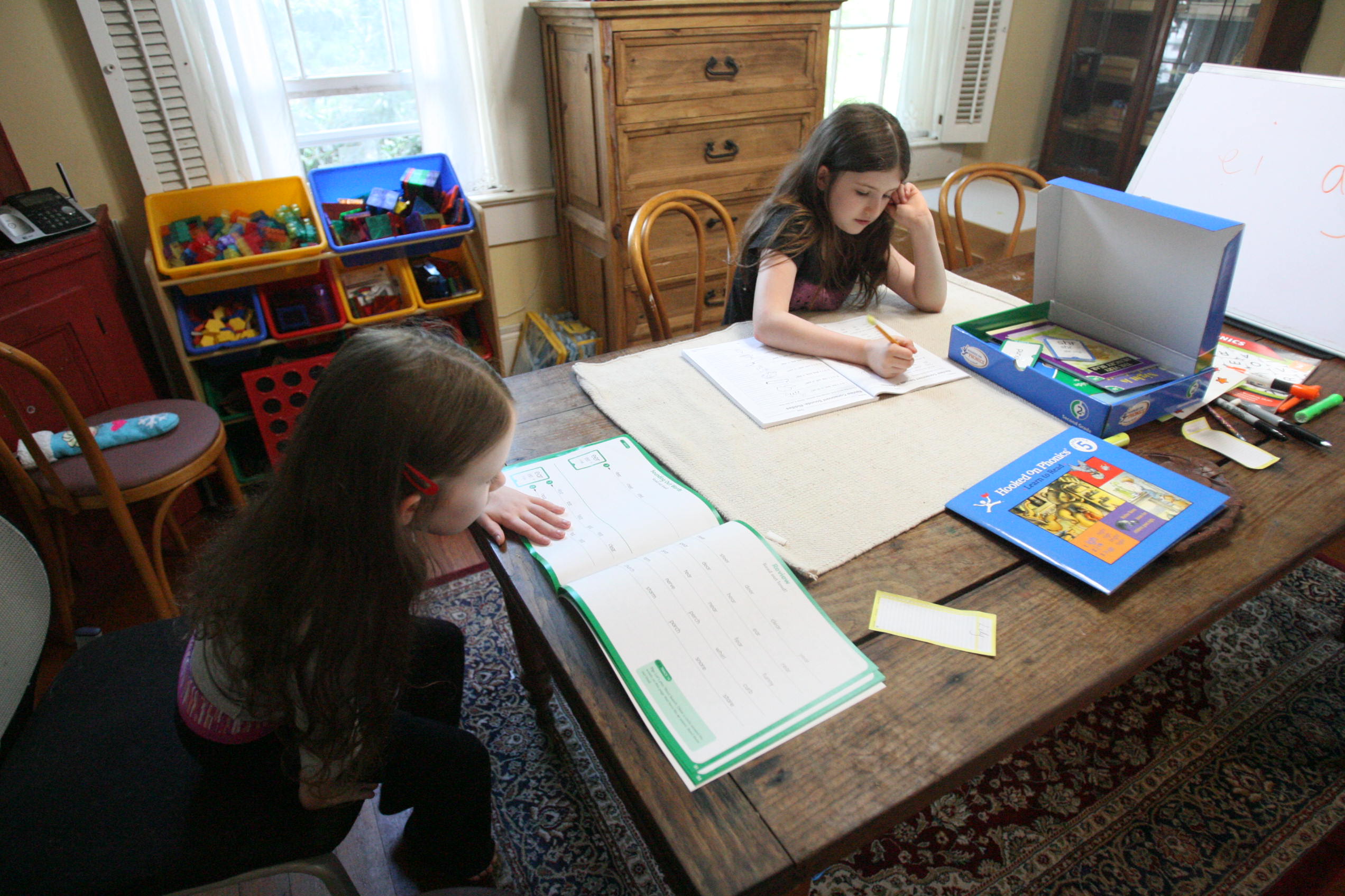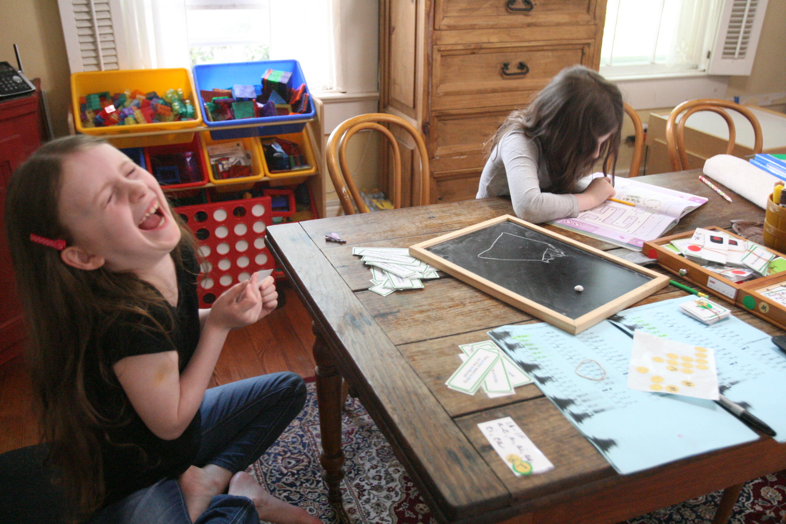 Above shows the girls doing division with racks and tubes and working on the green language series (montessori).