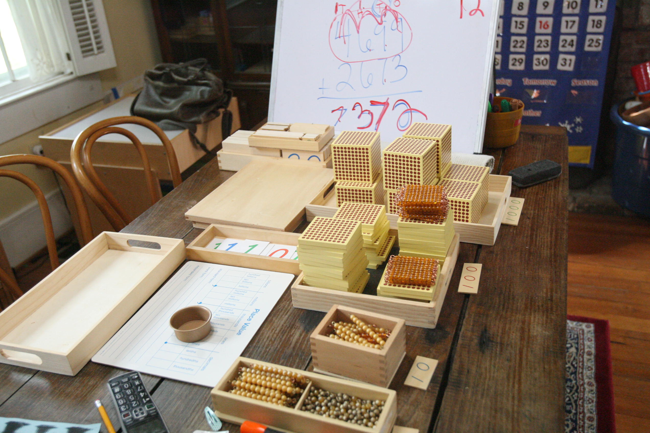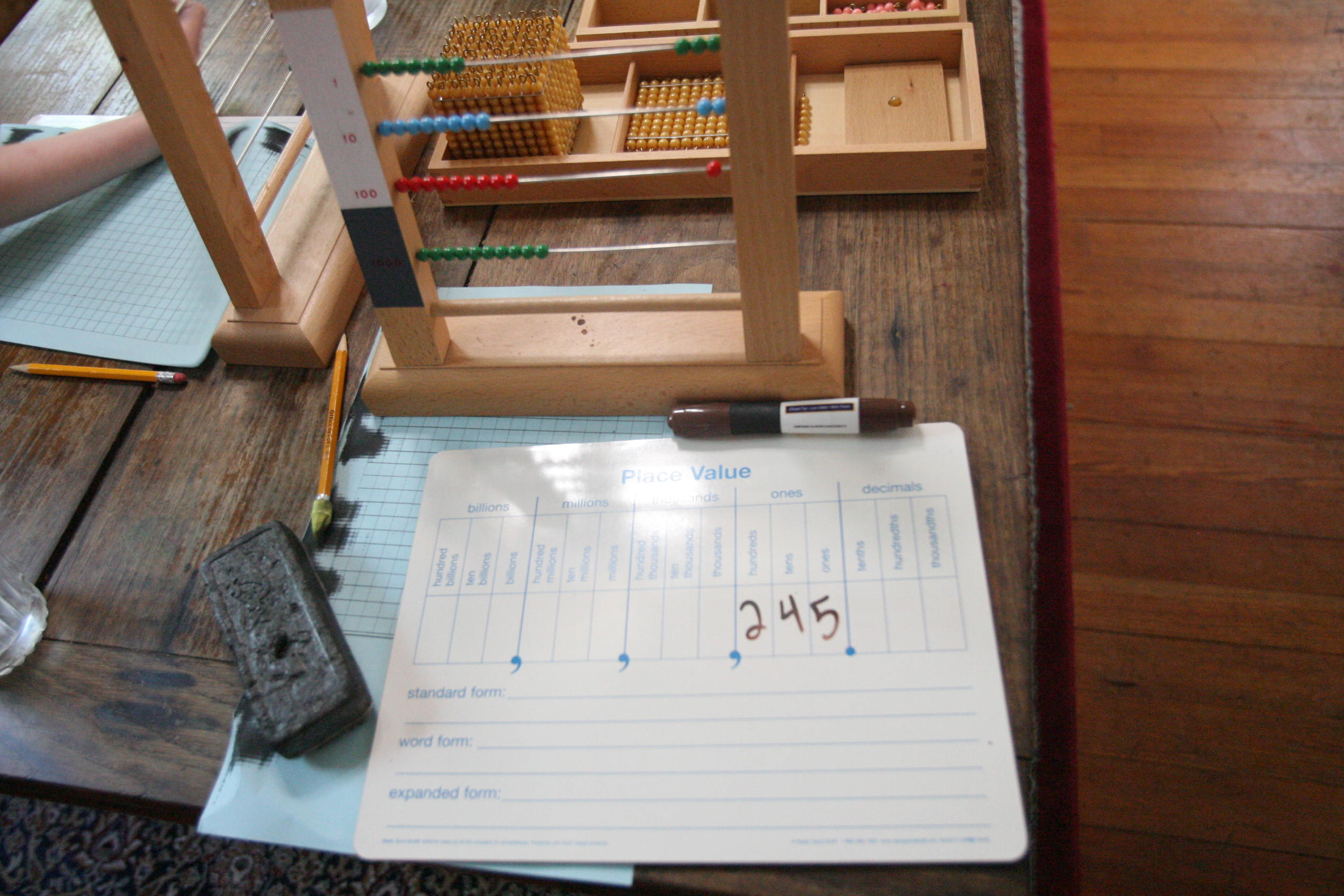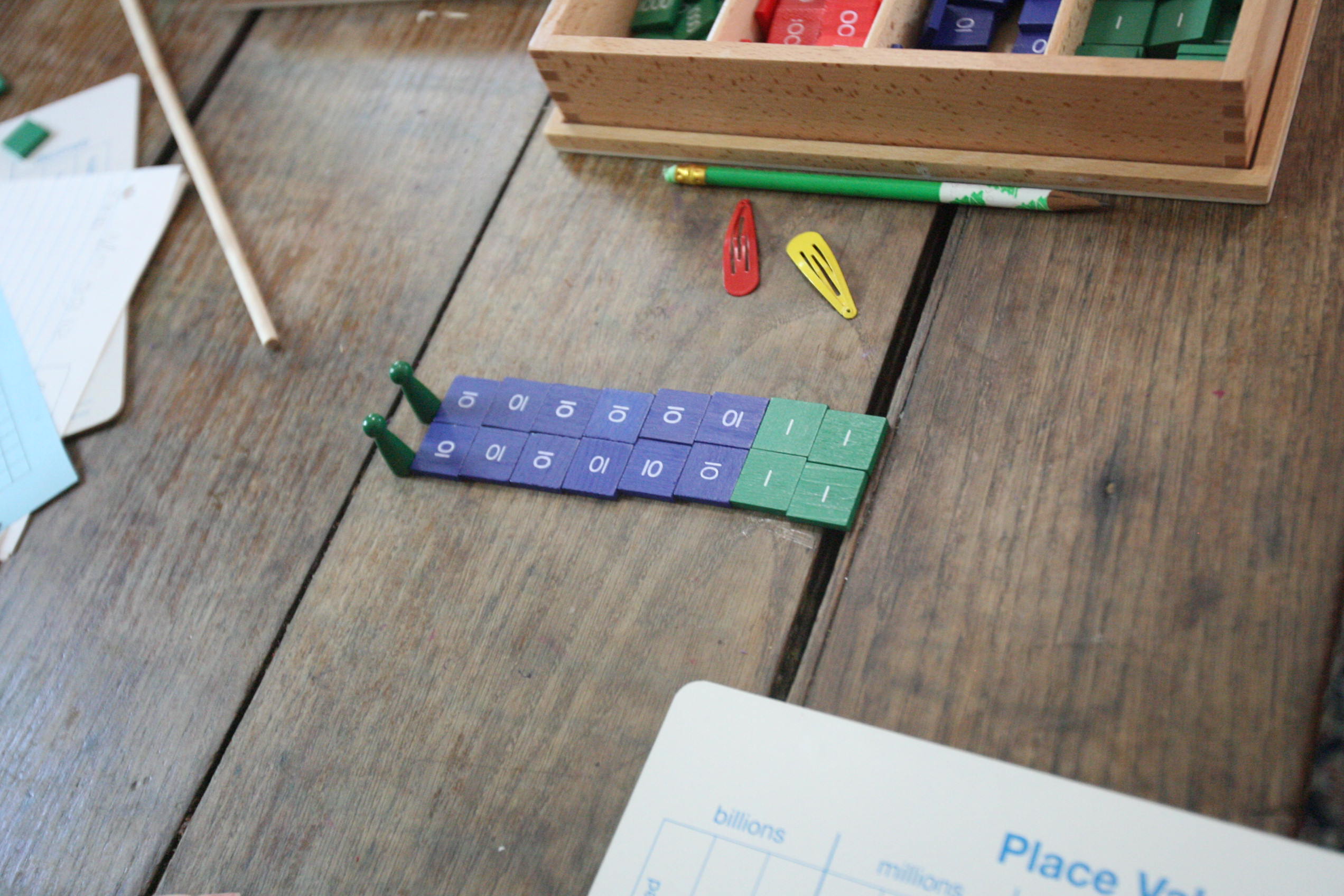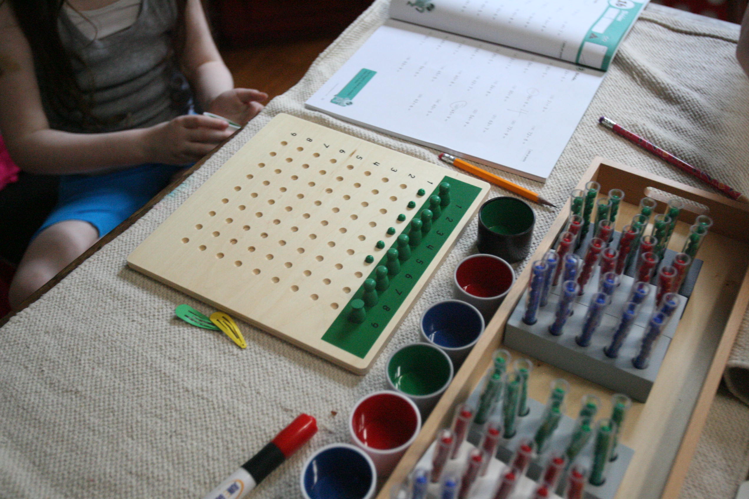Some work we have been working on is Montessori based math materials. We’ve been using the stamp game to do addition, subtraction, multiplication and division. This in an addition to the multiplication and division boards and just beginning the division boards with racks and tubes.