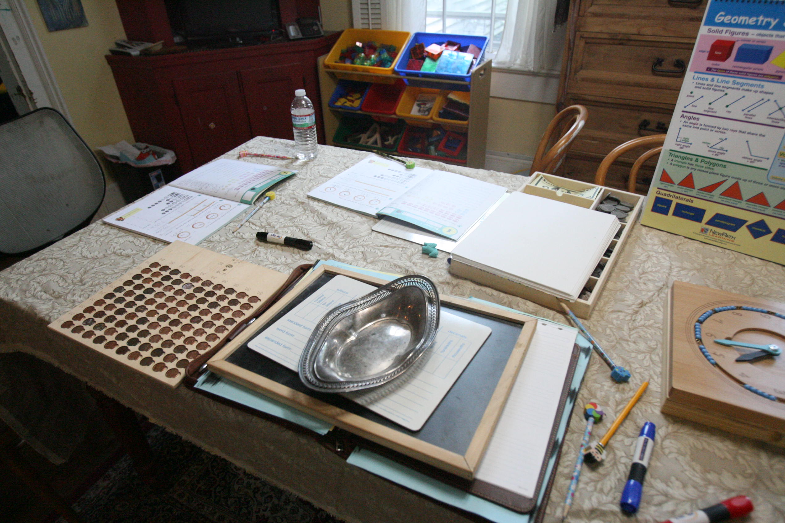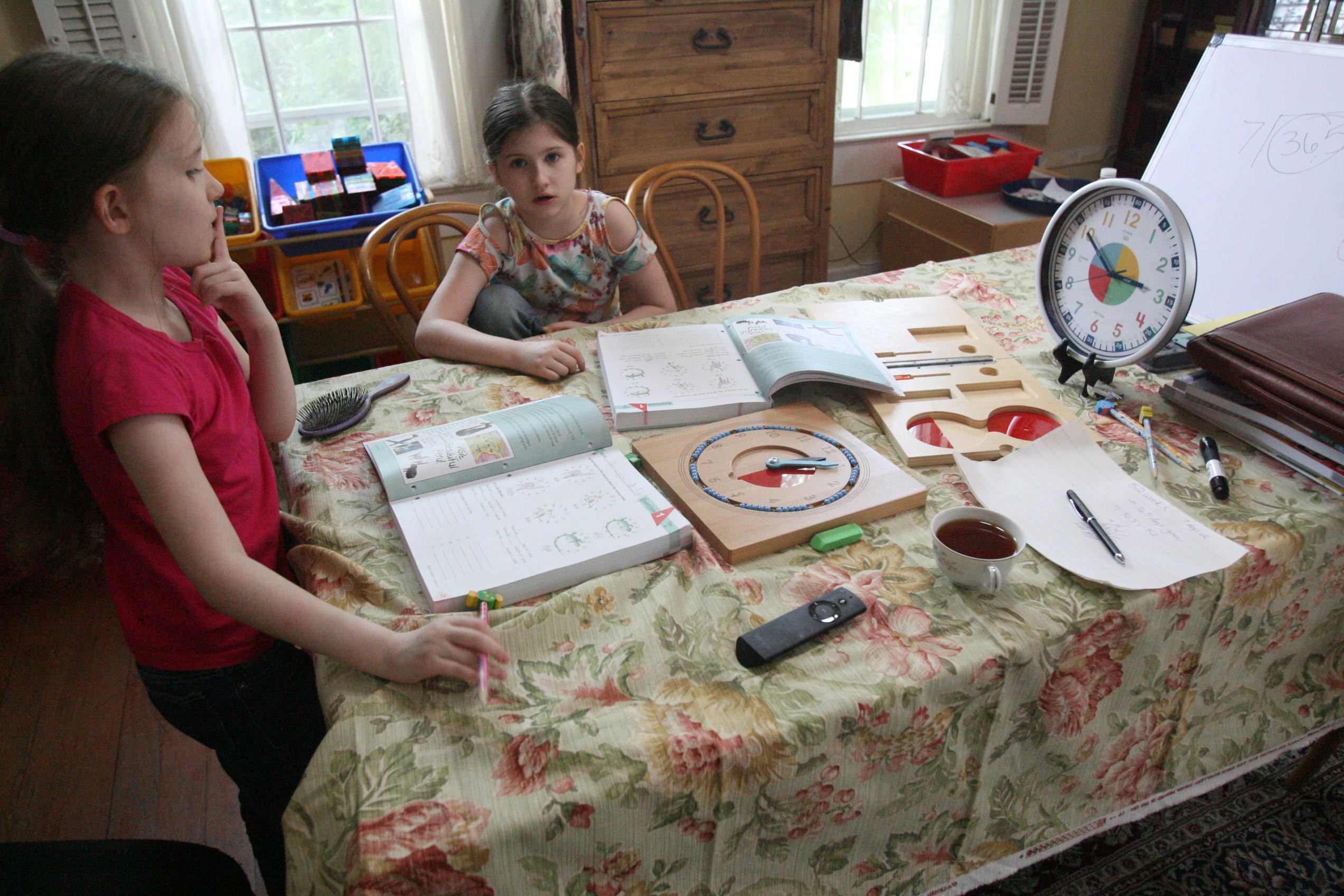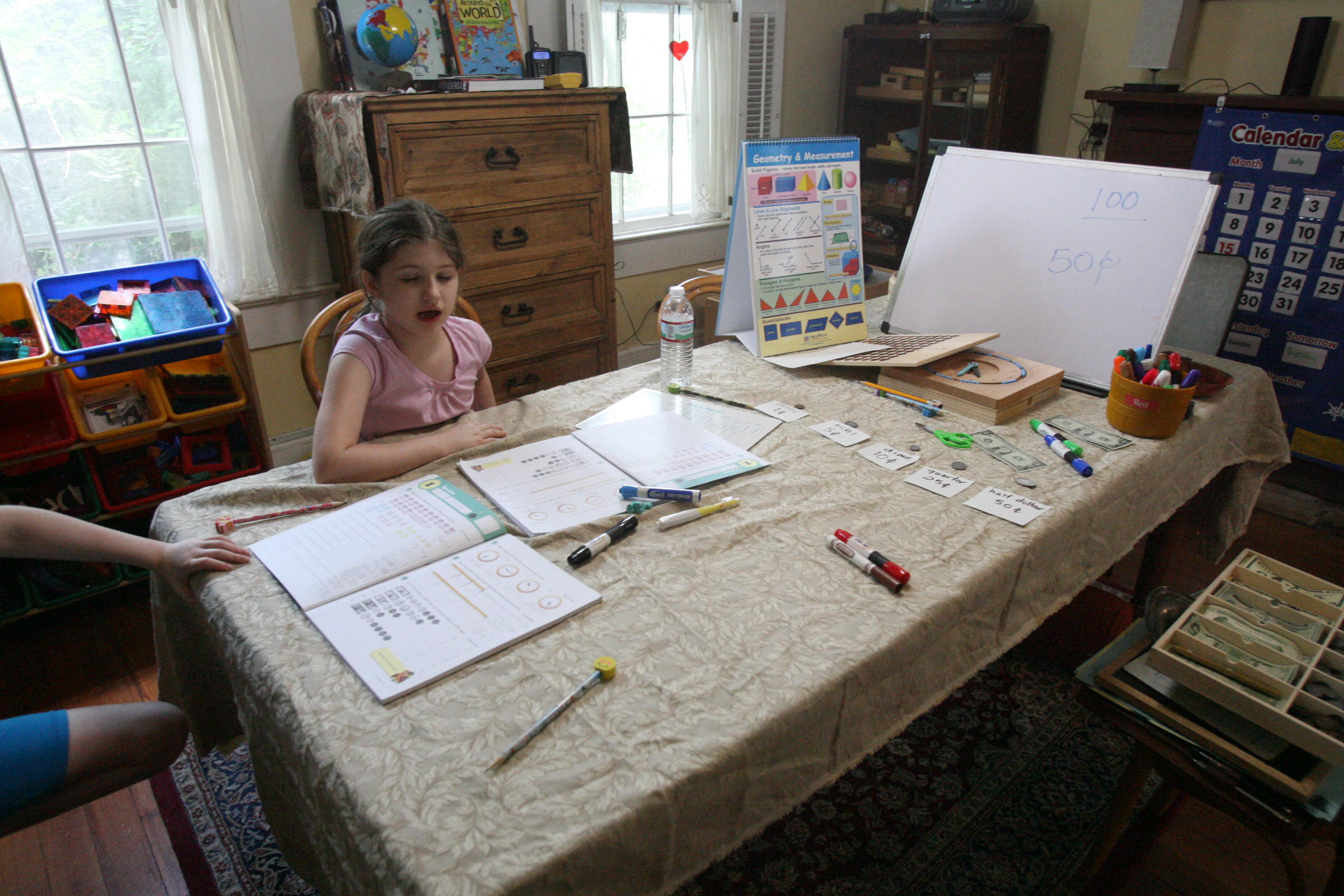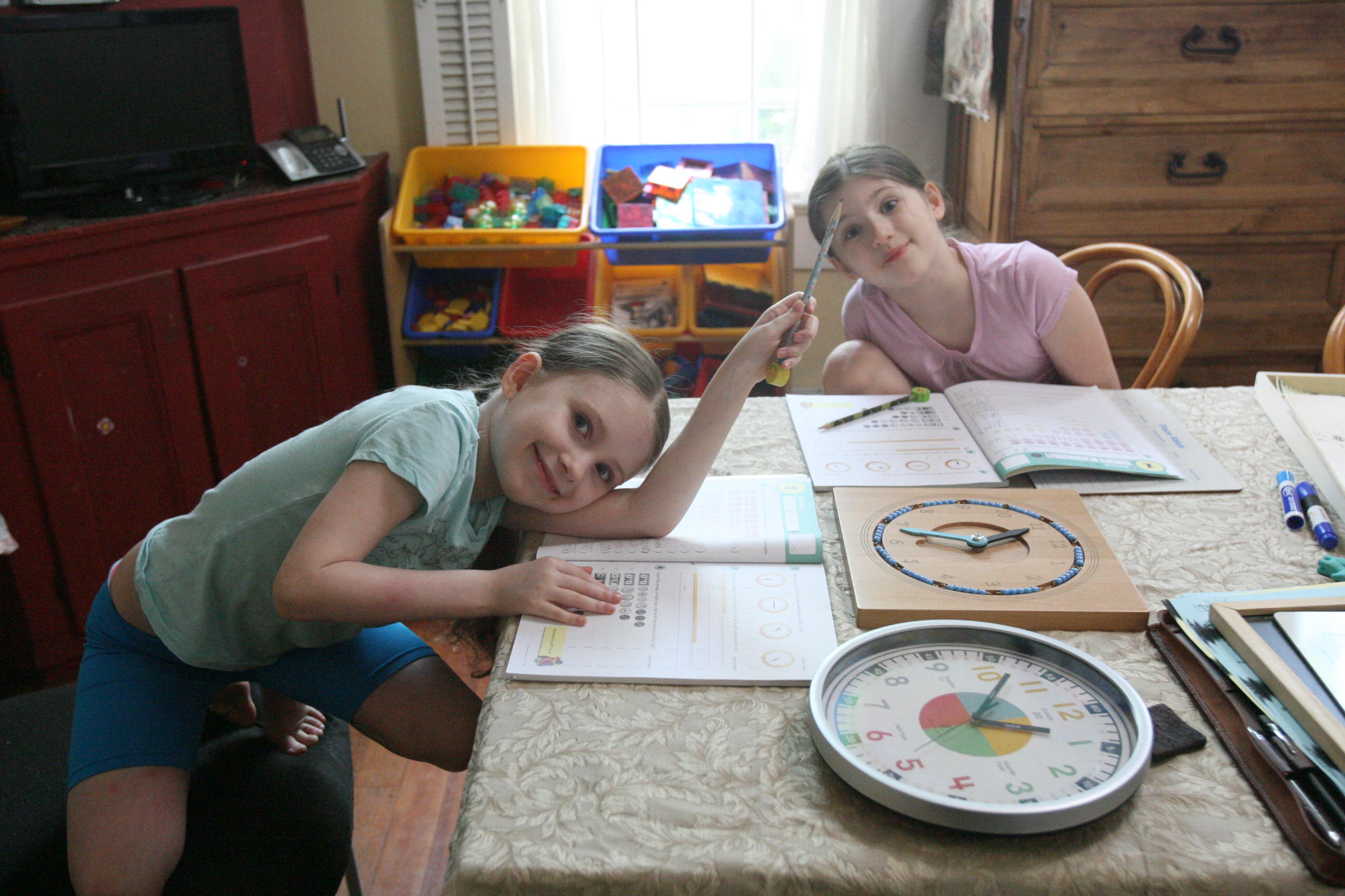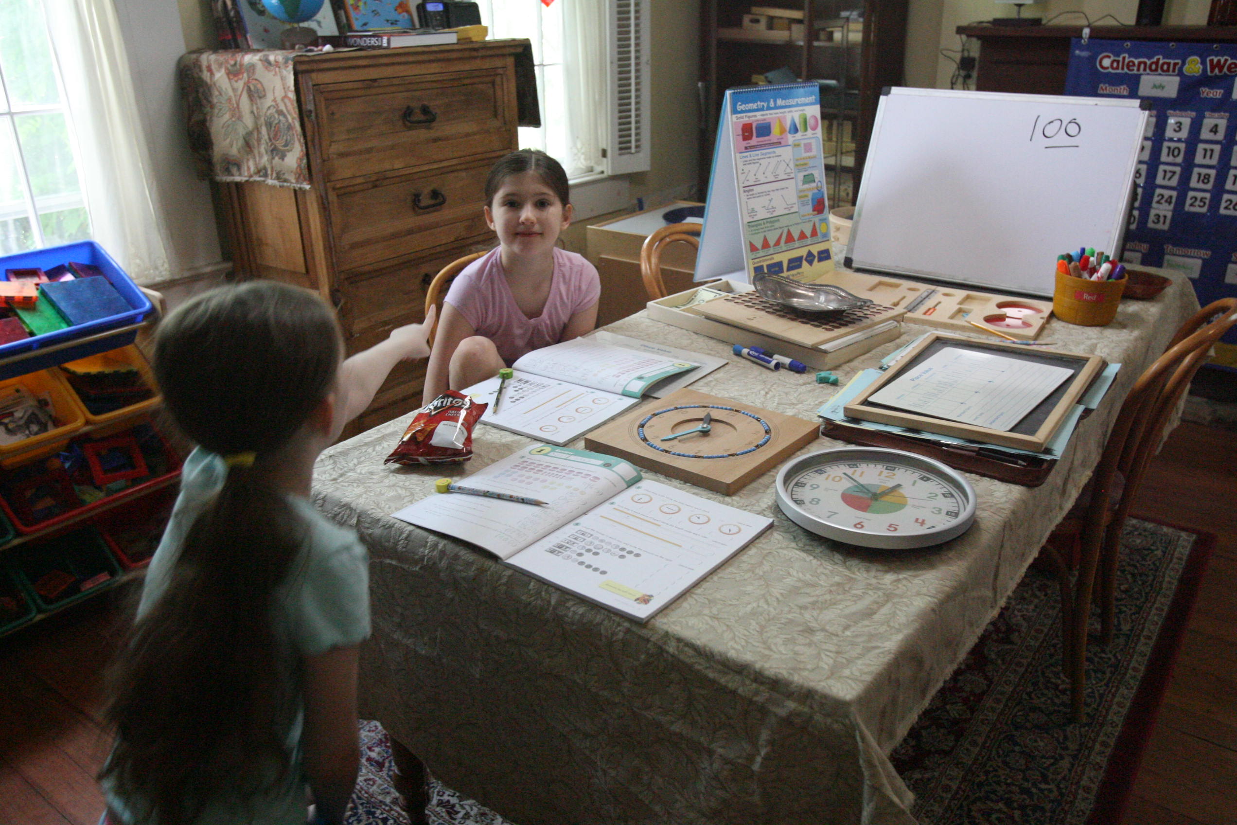 Above the girls work on time and money with geometry.