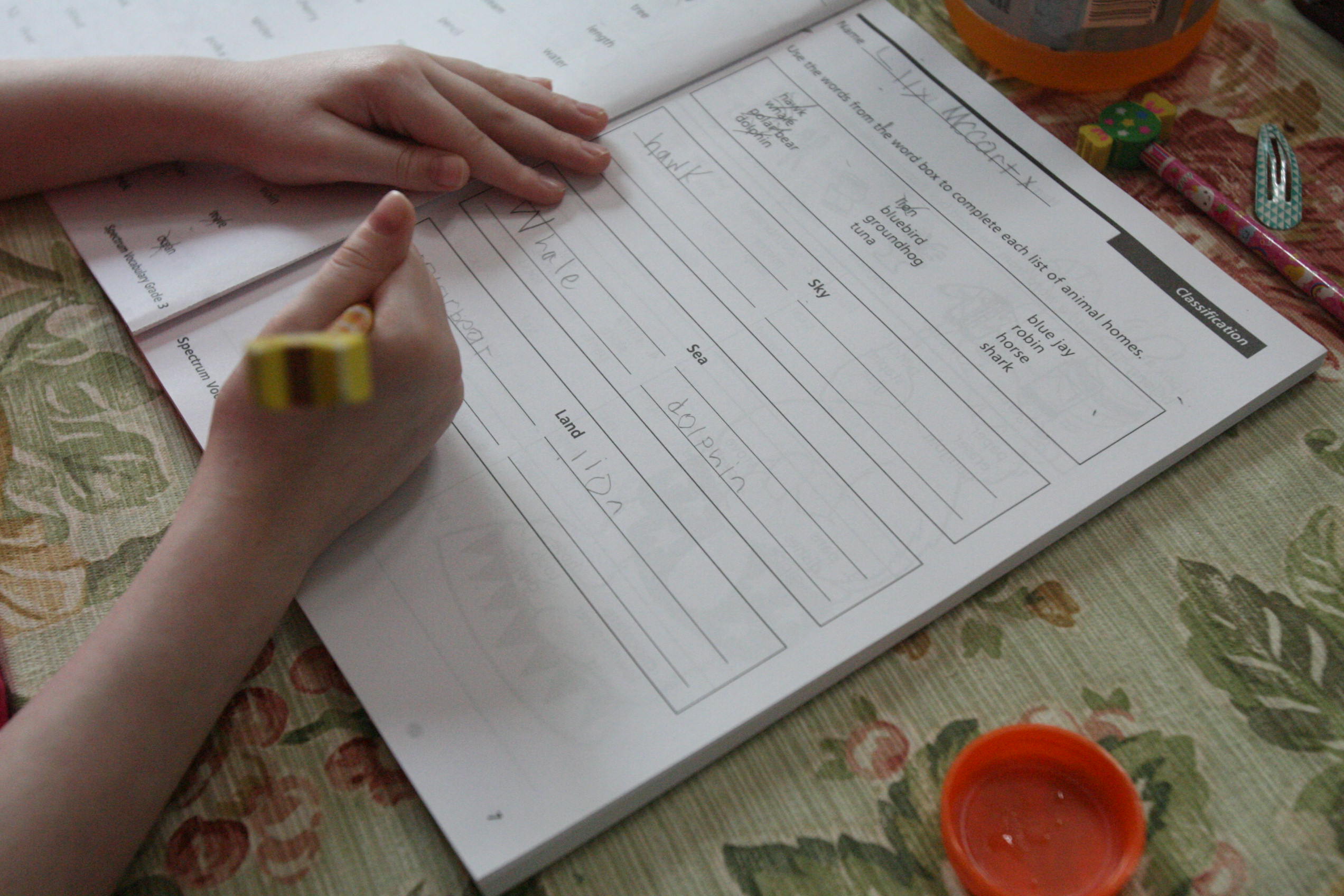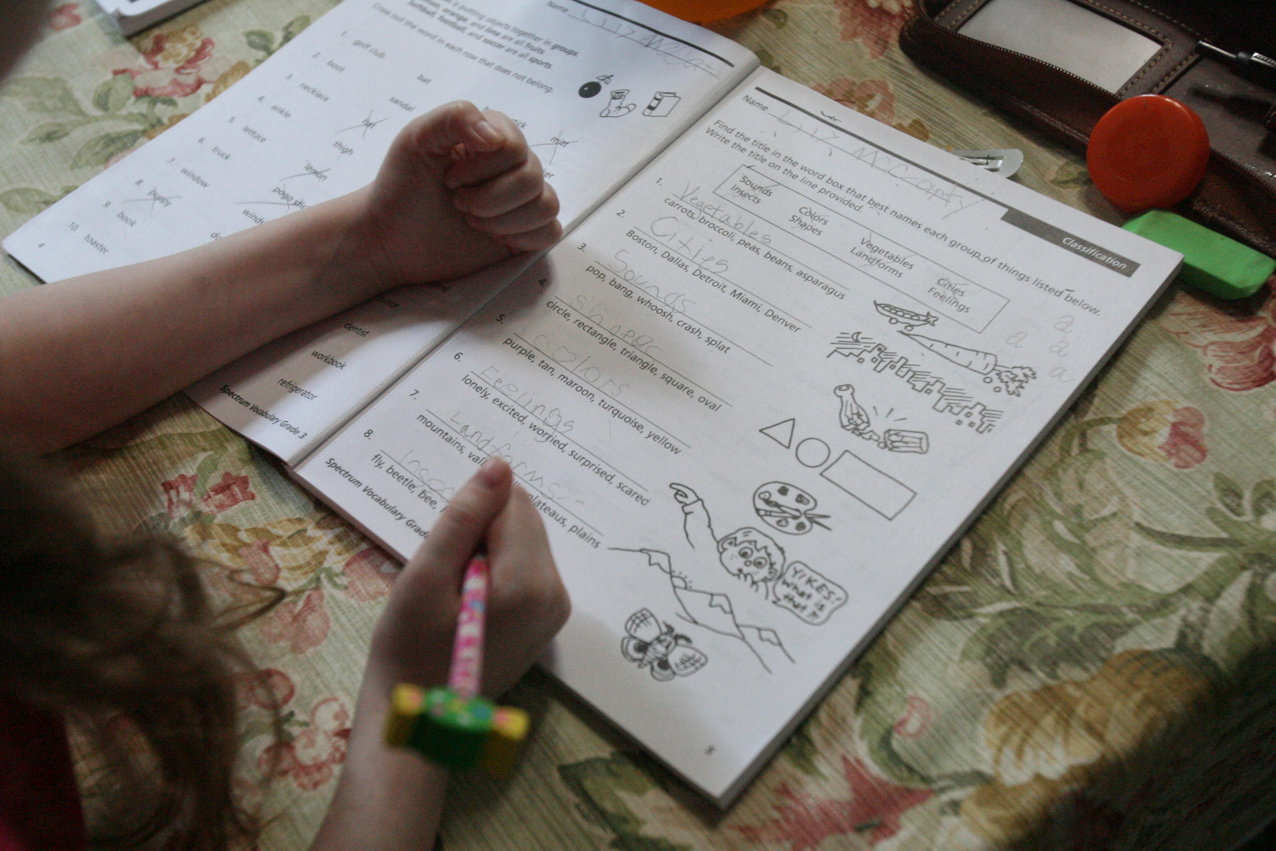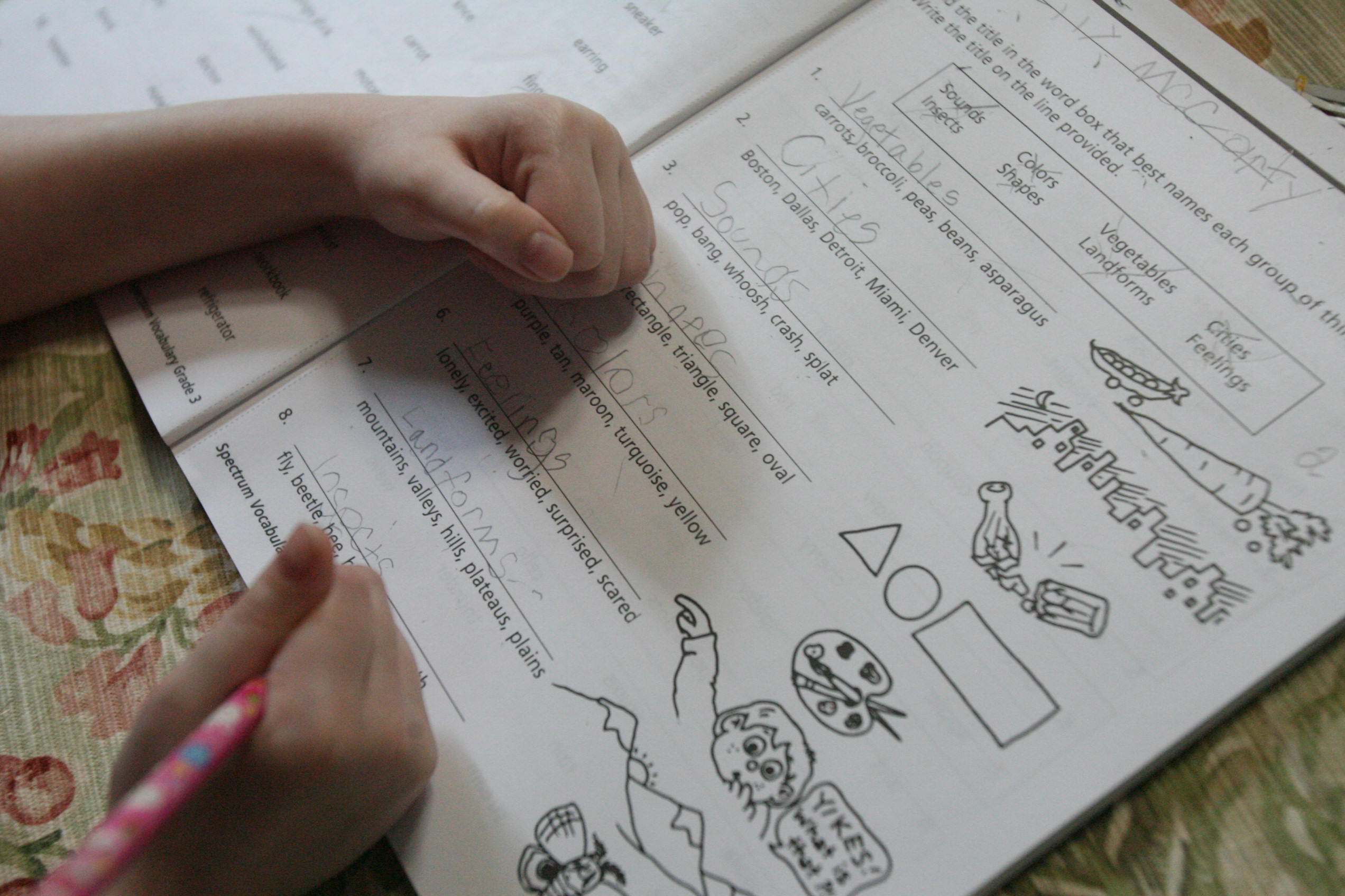 In vocabulary we worked on Classifying objects. The girls identified object groups. Maggie went ahead and worked on synonyms as she finished her work early. We worked on Reading and comprehension skills in the Common Core Reading workbooks. The girls read stories as test practice and answered questions about the text read.