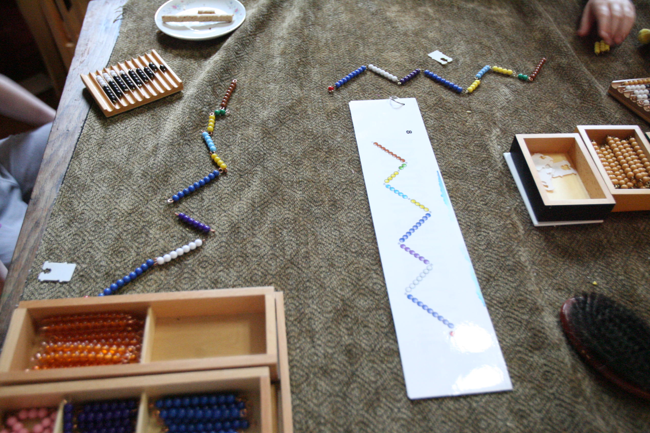 In the photos above you can see the girls working on the addition and subtraction snake game as well as using bead chains for multiplication.